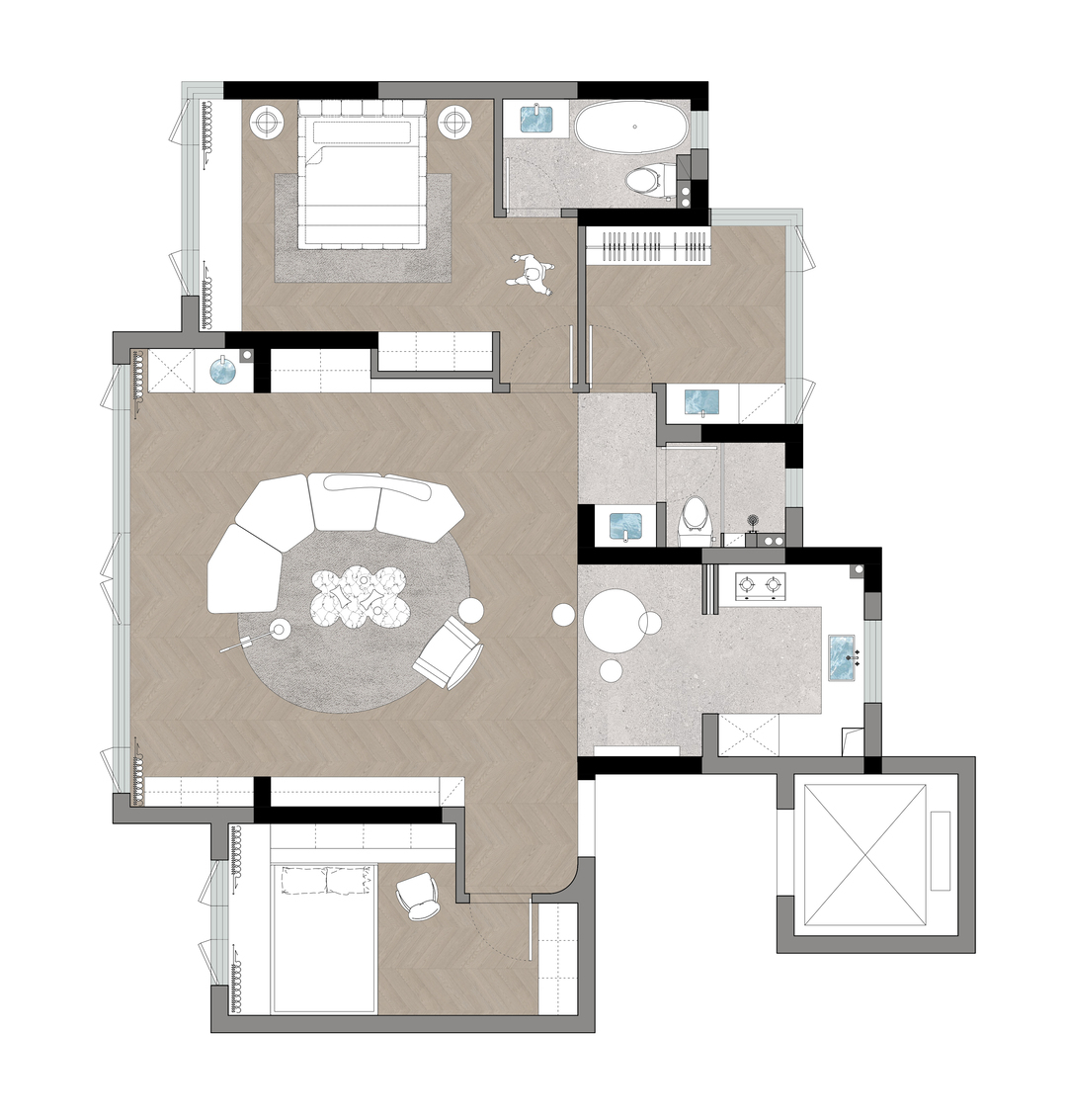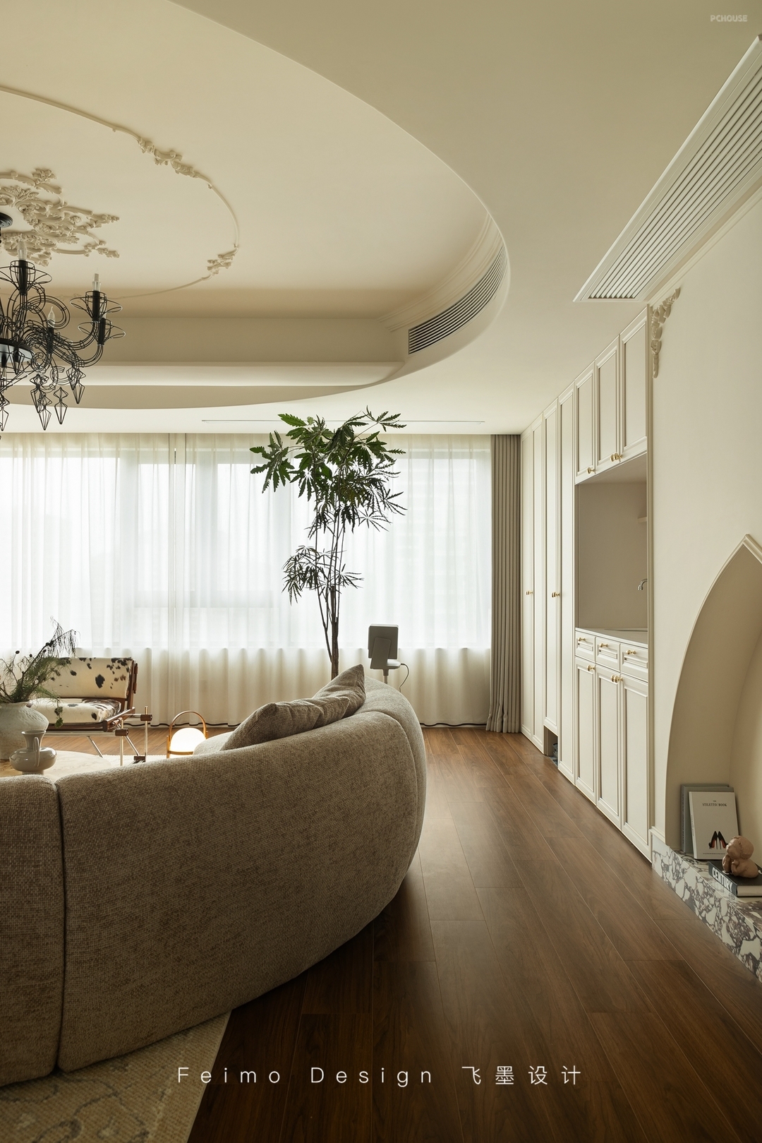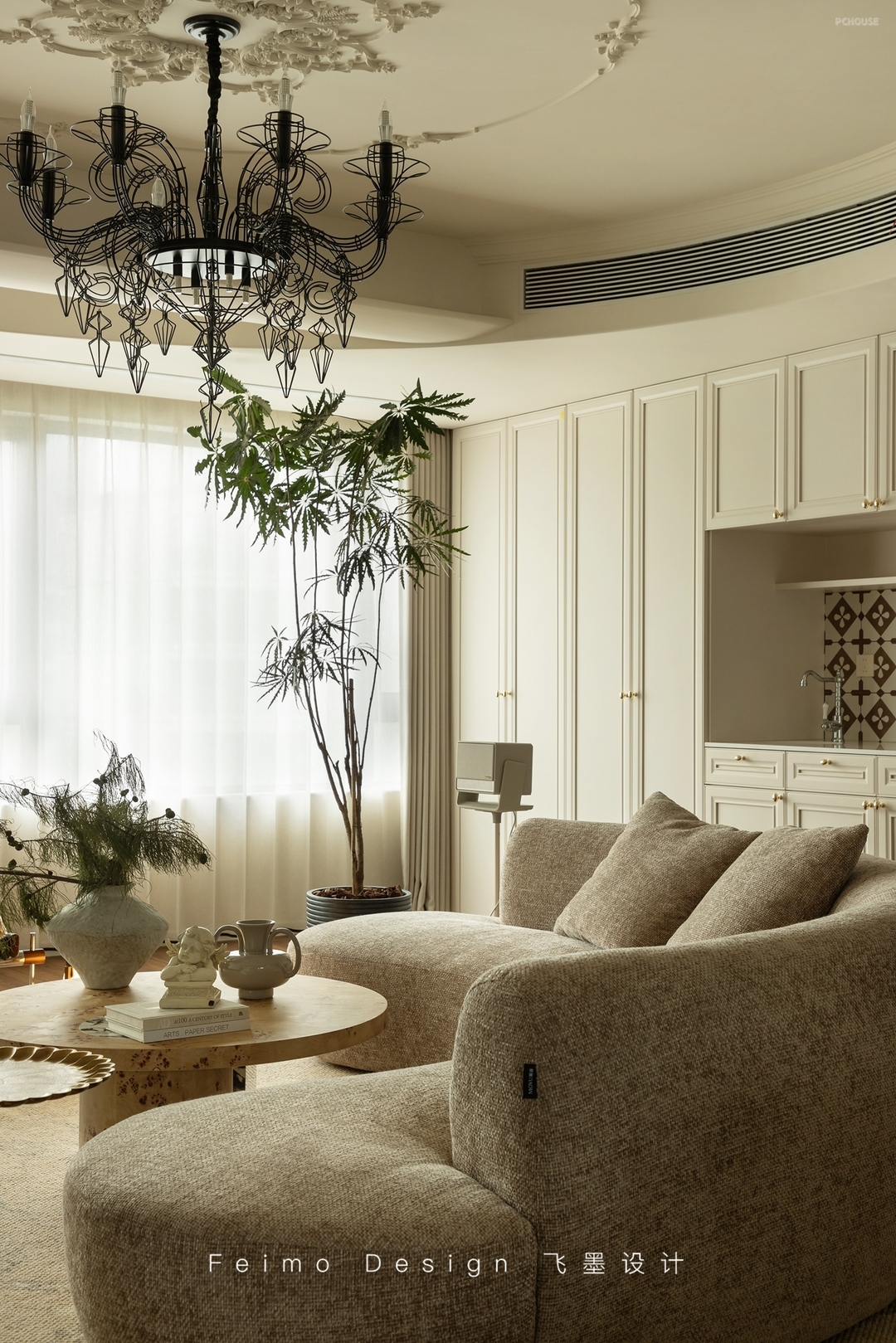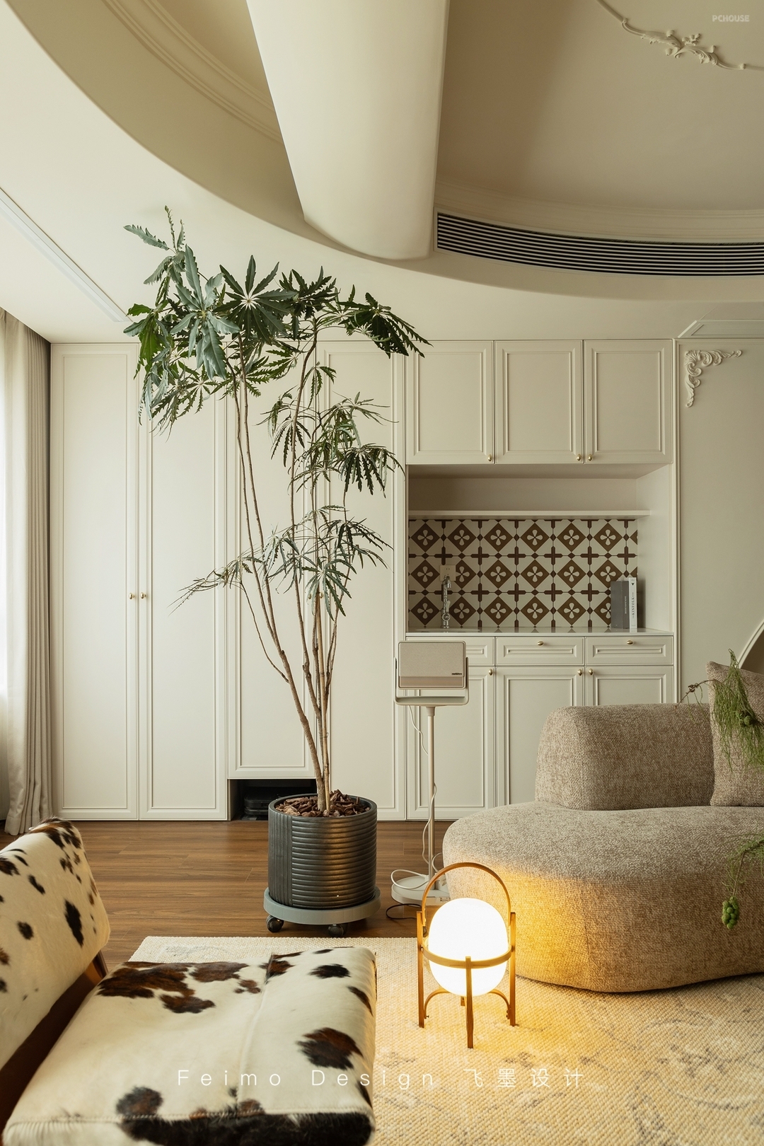圆弧的异形吊顶包裹了整个客厅,进一步彰显了客厅的视觉通透度;尖型壁炉拉伸客厅层高;圆弧岩石模块沙发不仅和硬装线条相呼应,使用体验也极其舒适。在实用的同时形成独特的审美力量。
