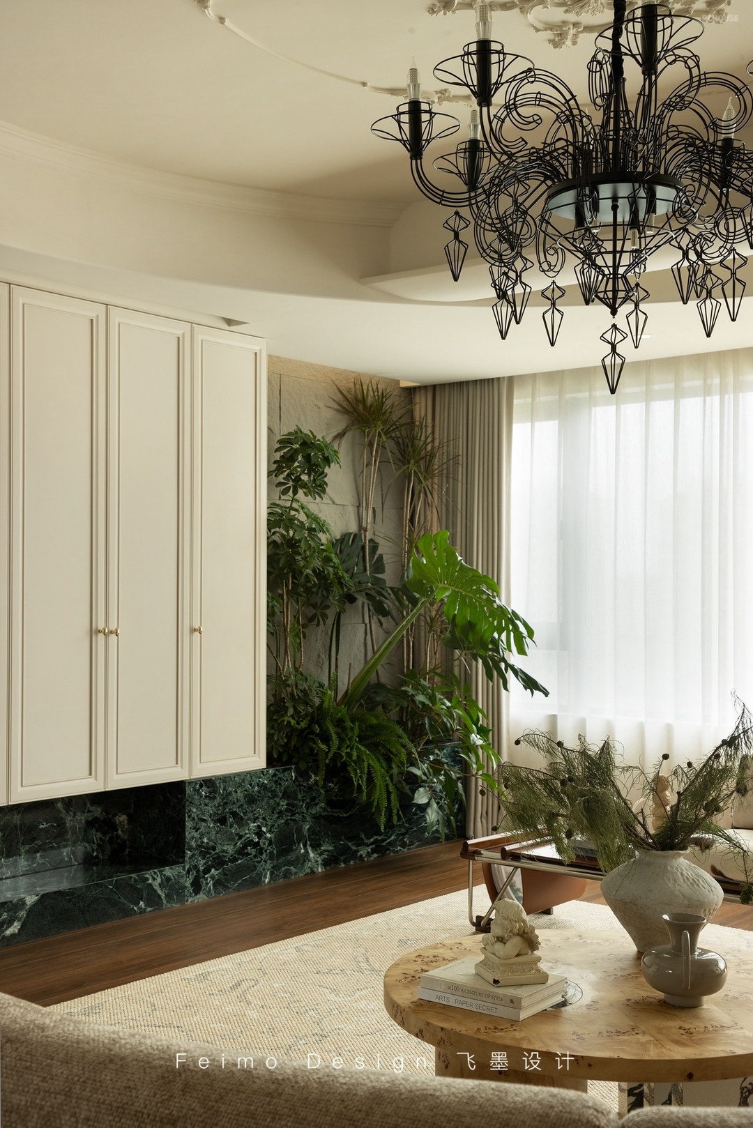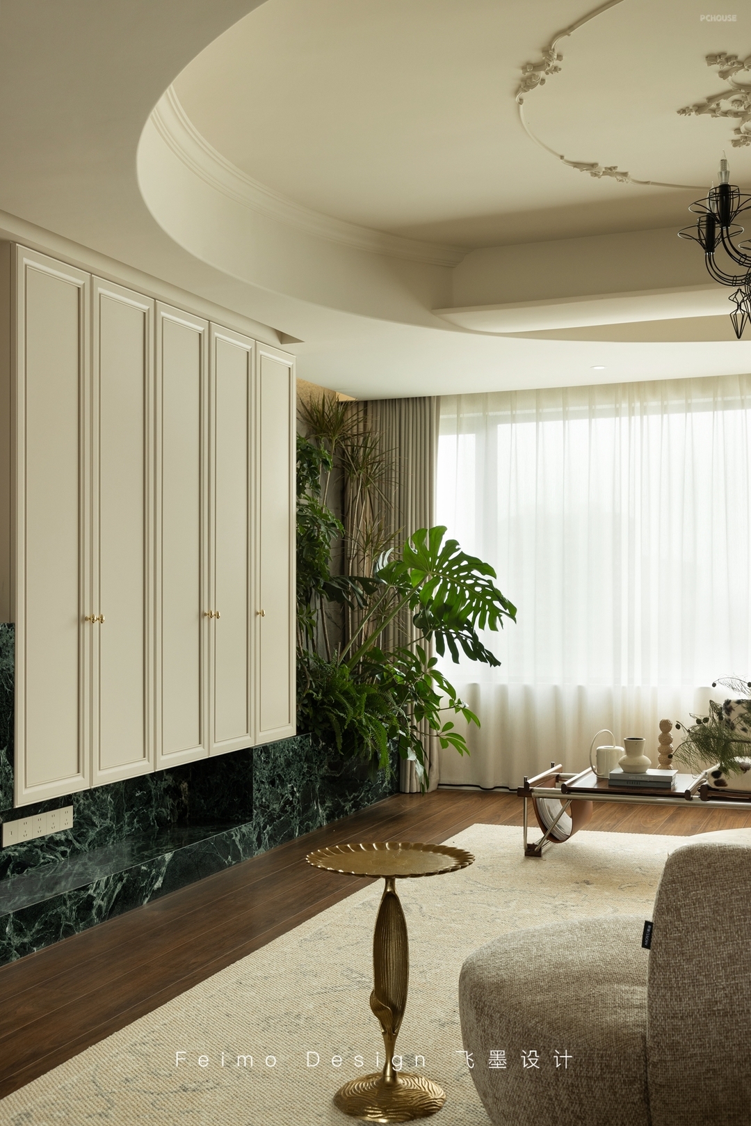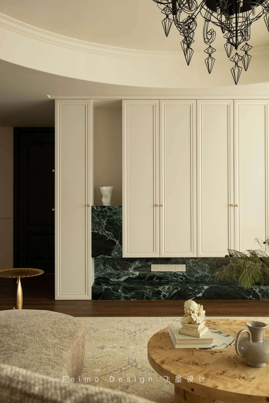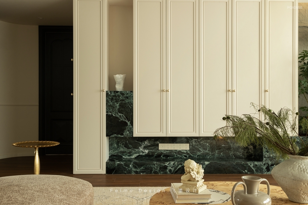 大理石的色泽纹理是自然的馈赠,但如何使用则在于设计师的精心搭配。恰如本案中,将法式电视柜和大理石地台结合。不同材质的混用,让房子更显天然的纹理质感,而不是简单的添加色彩。