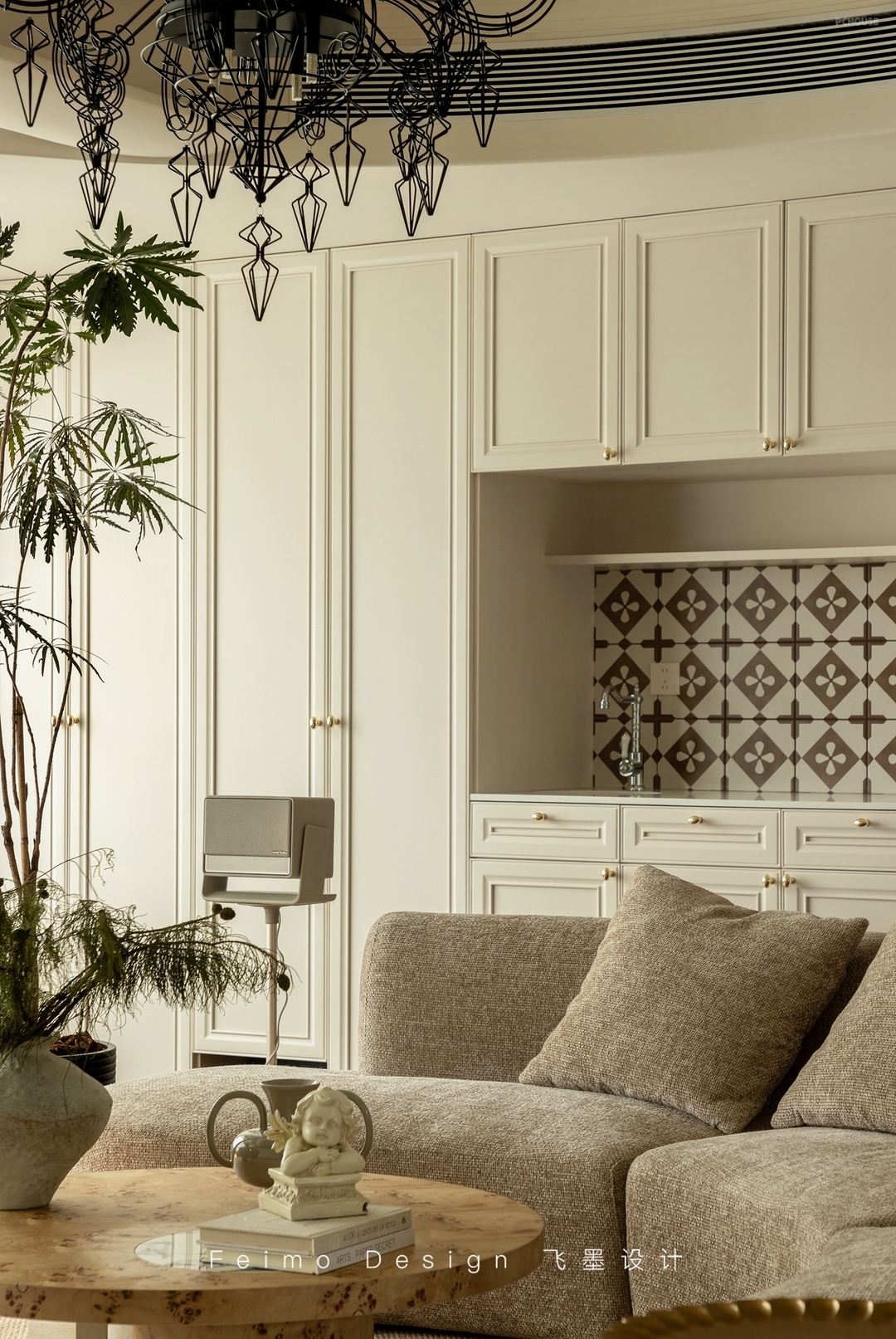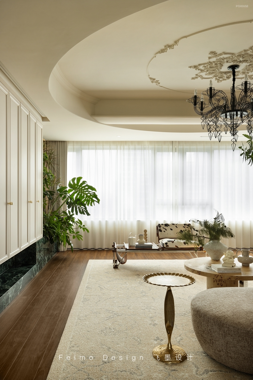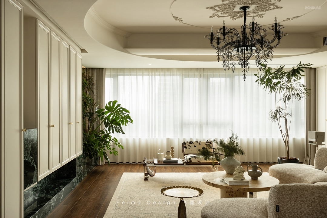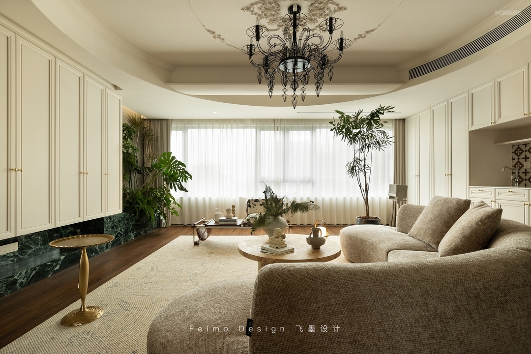 大理石的色泽纹理是自然的馈赠,但如何使用则在于设计师的精心搭配。恰如本案中,将法式电视柜和大理石地台结合。不同材质的混用,让房子更显天然的纹理质感,而不是简单的添加色彩。