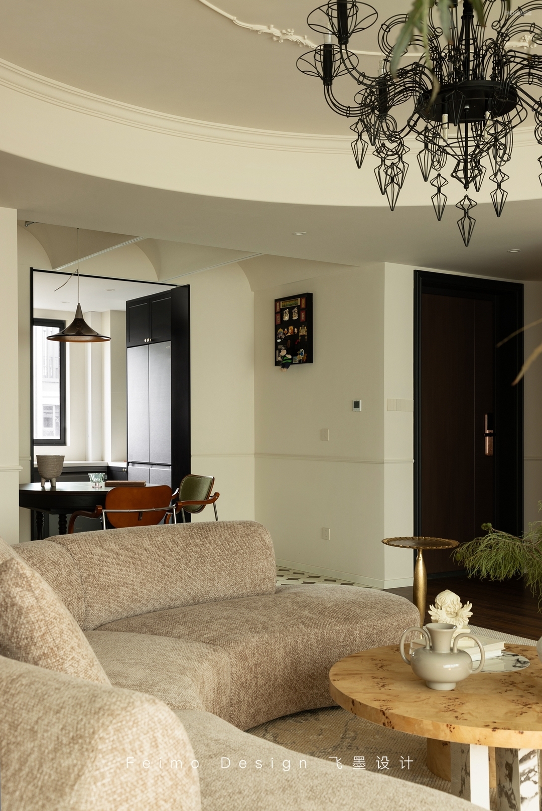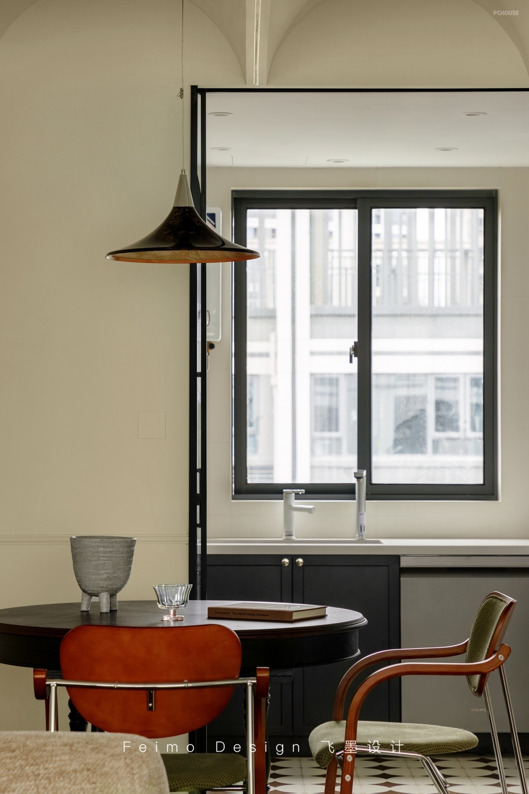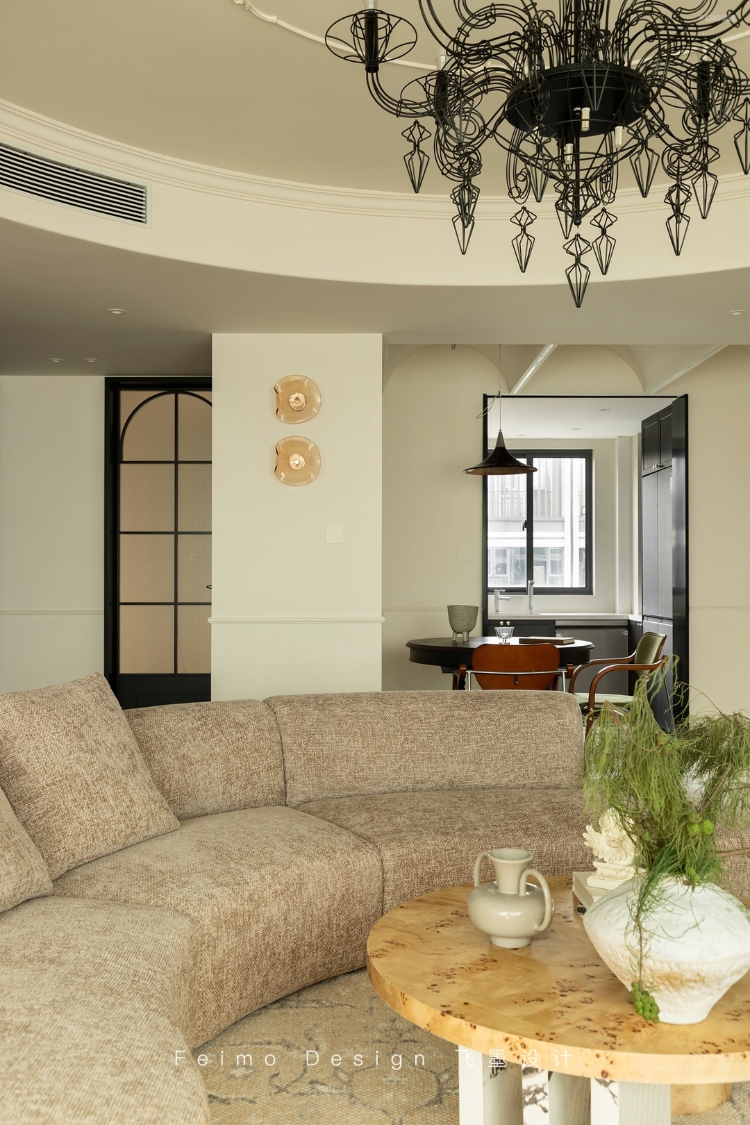 餐厅用简单的圆桌和吊灯组合,但细看就能发现同样细节满满。连续的穹顶让回家就像走进美术馆。这也非常考验施工技艺,最终我们将其成功落地,进一步增加了空间的独特专属性。