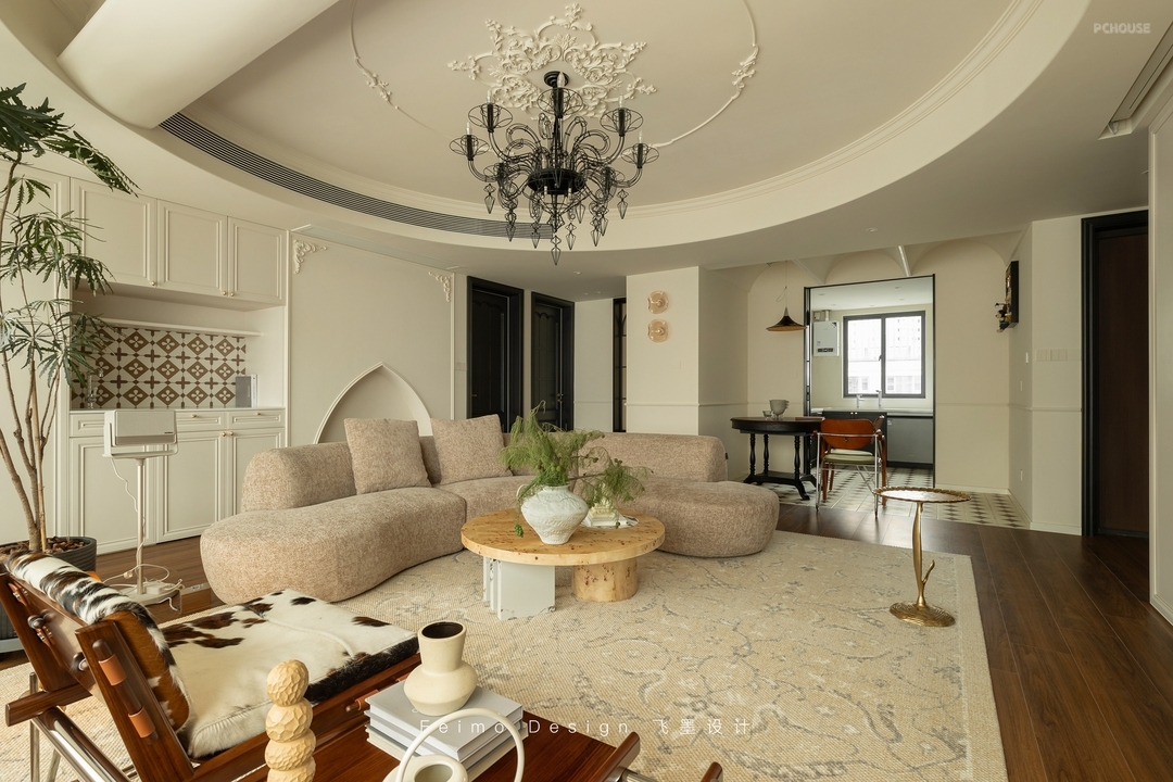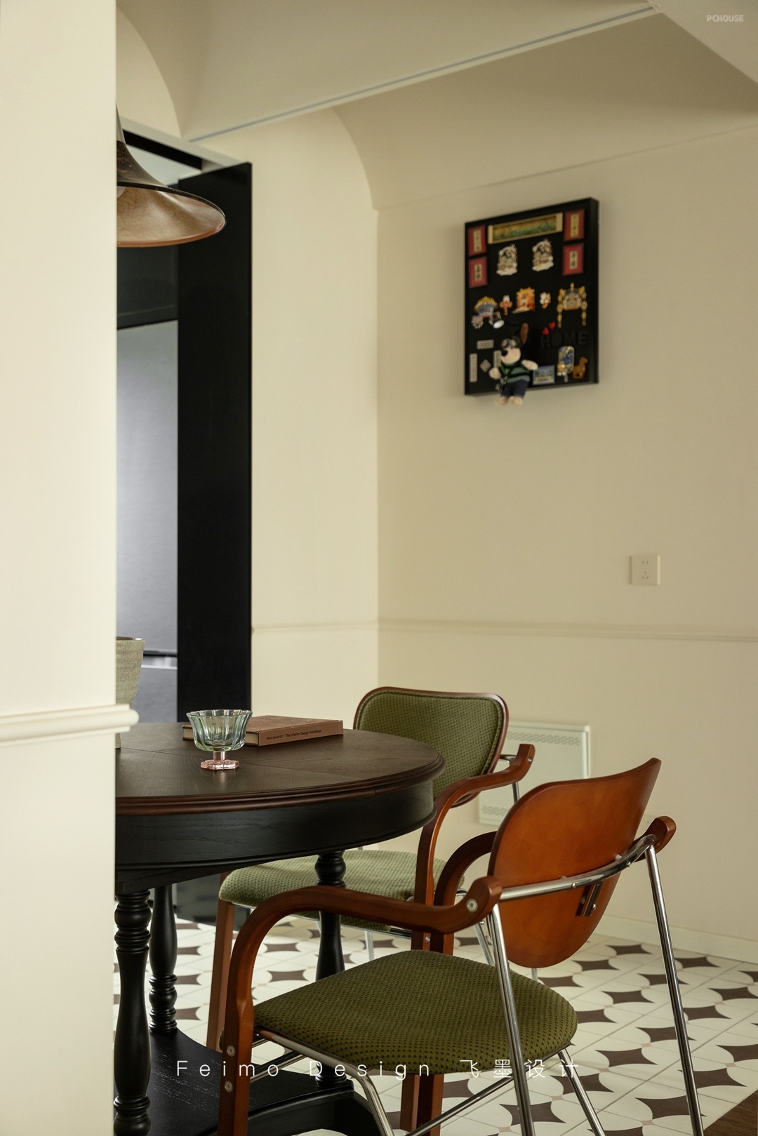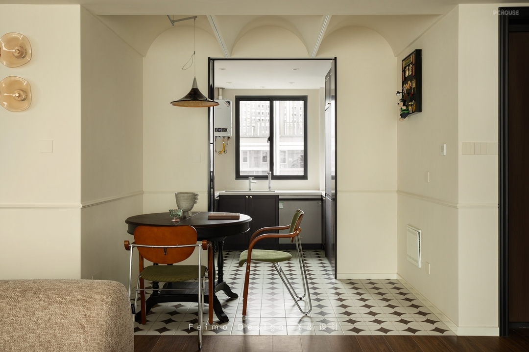 餐厅用简单的圆桌和吊灯组合,但细看就能发现同样细节满满。连续的穹顶让回家就像走进美术馆。这也非常考验施工技艺,最终我们将其成功落地,进一步增加了空间的独特专属性。
