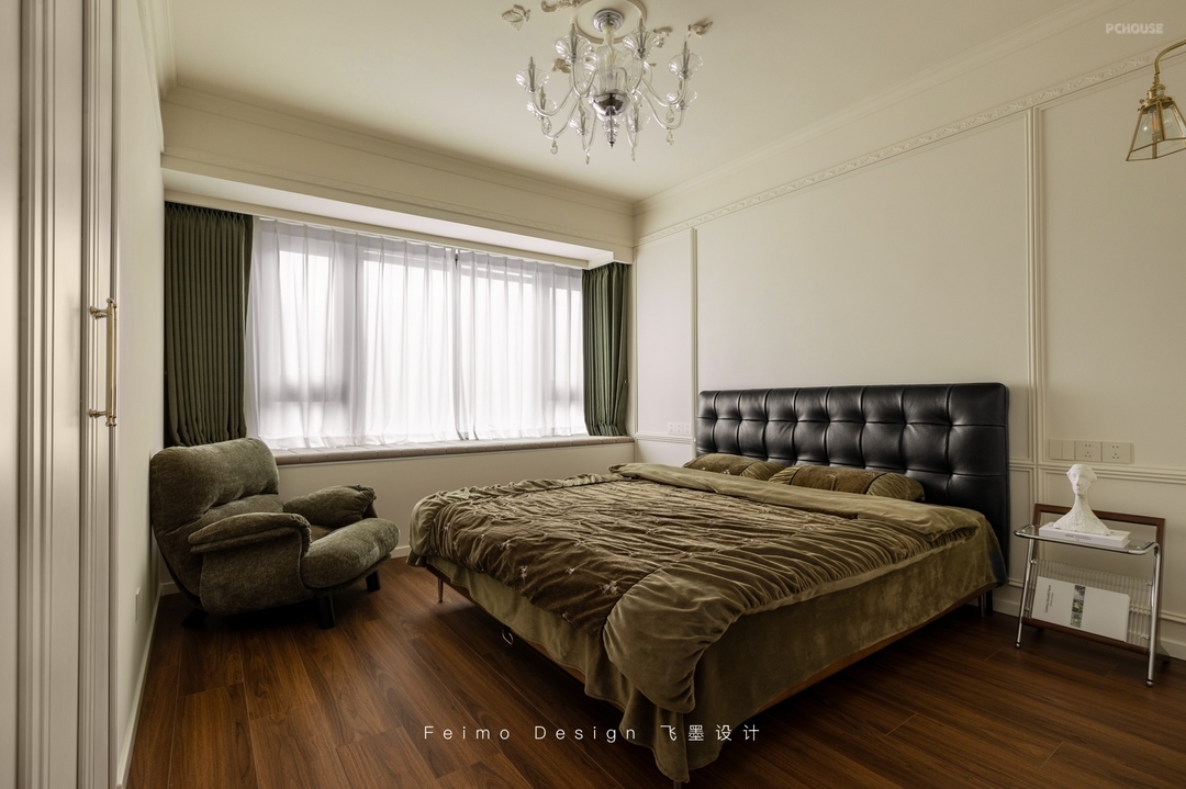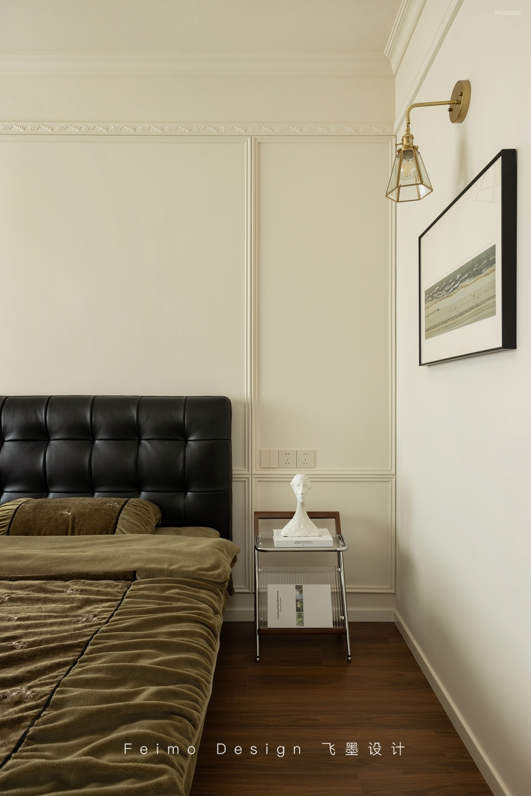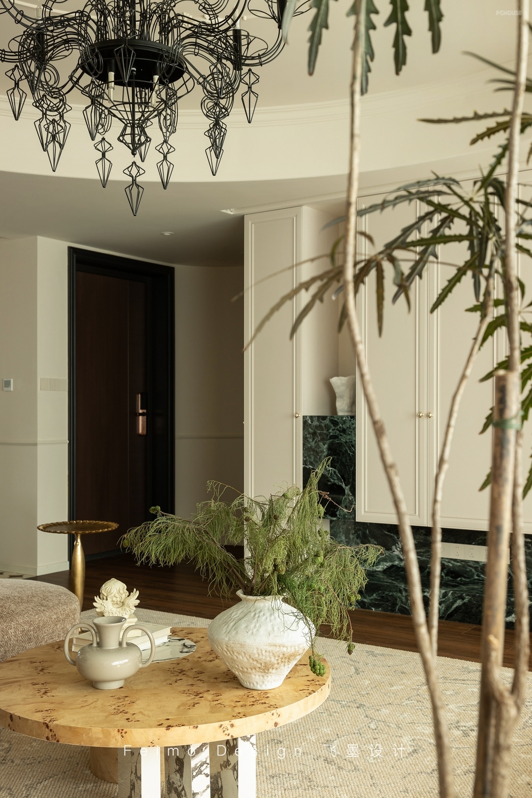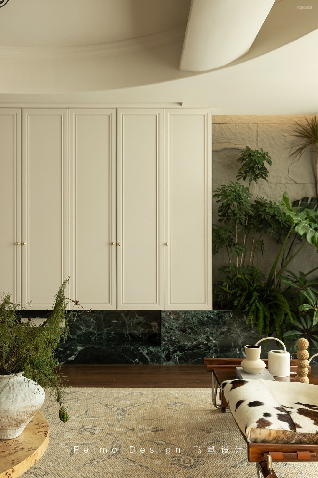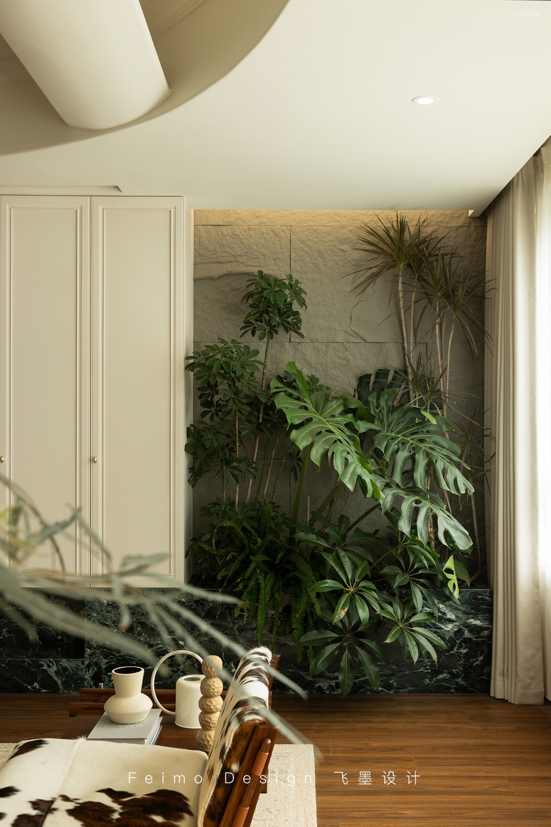 为了和这个“植物之家”相互呼应,大面积的普拉达绿大理石和电视墙结合。岩面的天然脉络赋予空间静谧的鲜活感,也在光影中沉淀出高级质感。