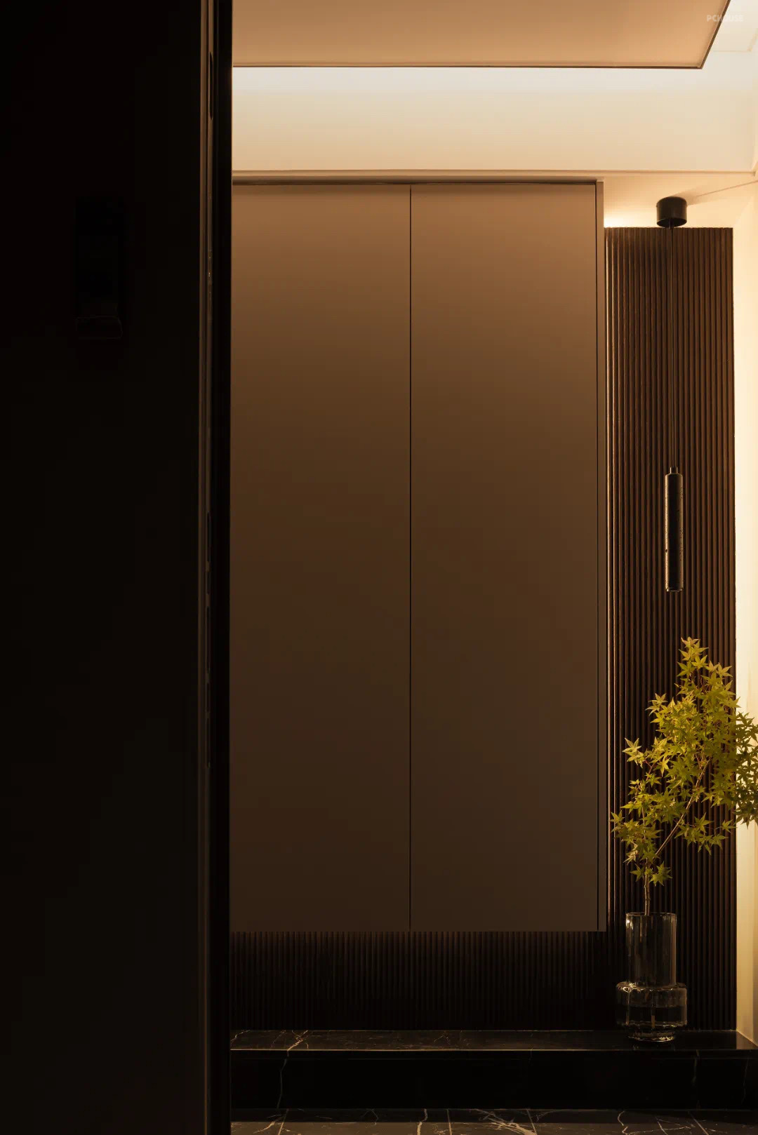 玄关是家居的第一印象,它温馨、舒适、洁净且有品位,设计师通过对空间巧妙的梳理、排布,营造出纯净时尚的氛围。一抹绿植的加入,更添灵动气质,让居者到家瞬间即从自然和本性中得到精神放松。设计师又根据飞鸟先生的职业特性,利用空间的灵活性,在玄关一侧设计了一个行李柜,以此满足经常飞行的飞鸟先生更多独特的生活需求。