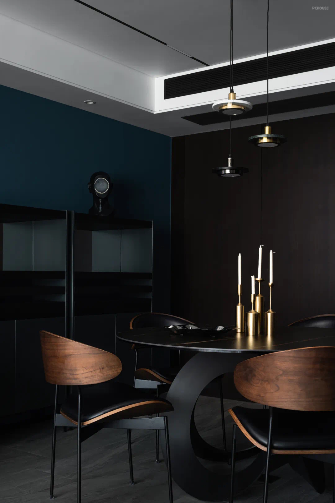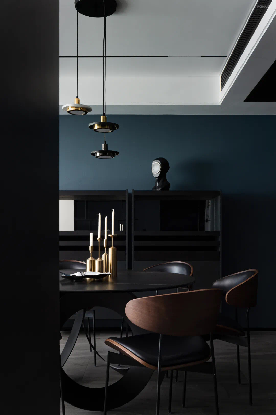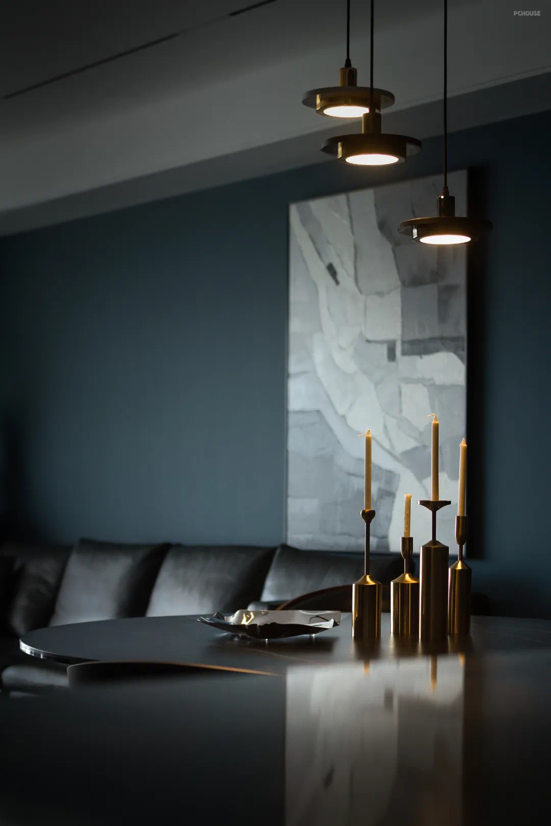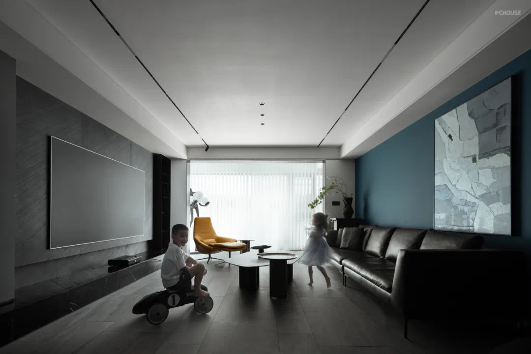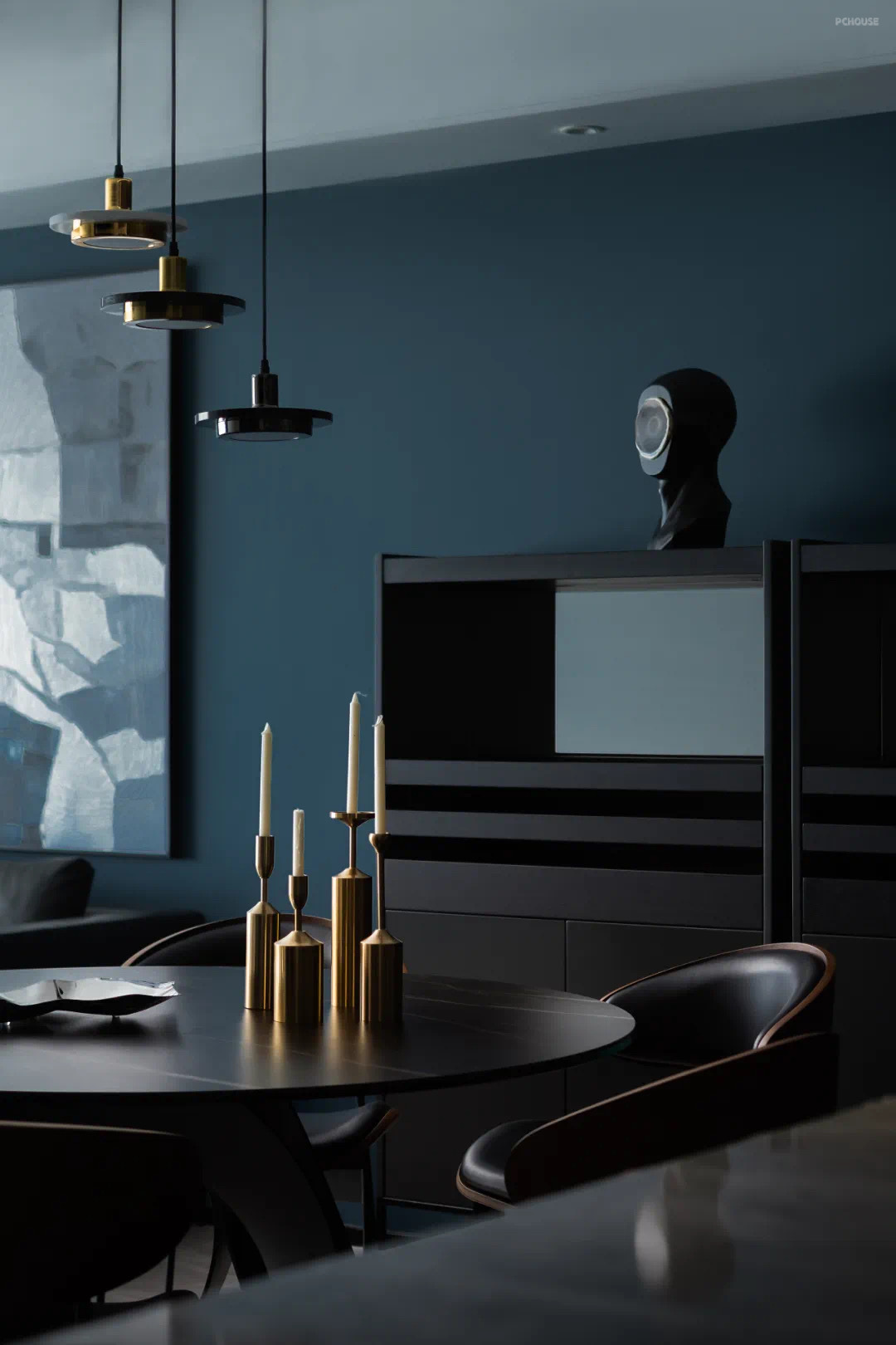 客厅一侧是内敛的灰,另一侧是低饱和度的秘境海蓝,两者搭配,营造出一派宁静氛围。拆除了客厅与阳台的玻璃隔断,使整个空间线条简单利落,刚柔并济的材料搭配,以及光线与阴影的巧妙配合,赋予了空间独特的艺术美感。