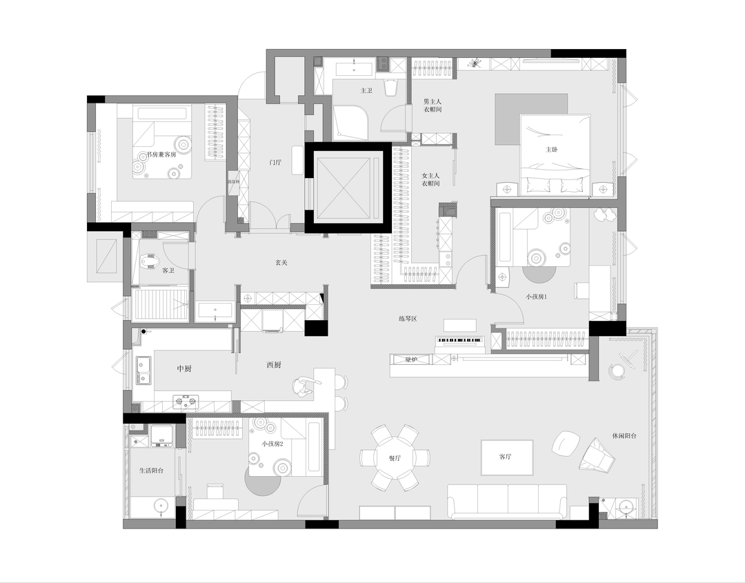 1.两个孩子有各自的房间和共同使用的娱乐空间2.能有一个空间陪着孩子绘画和练琴3.男女主人需要各自独立的衣帽间4.需要中西两个厨房,西厨可以会友