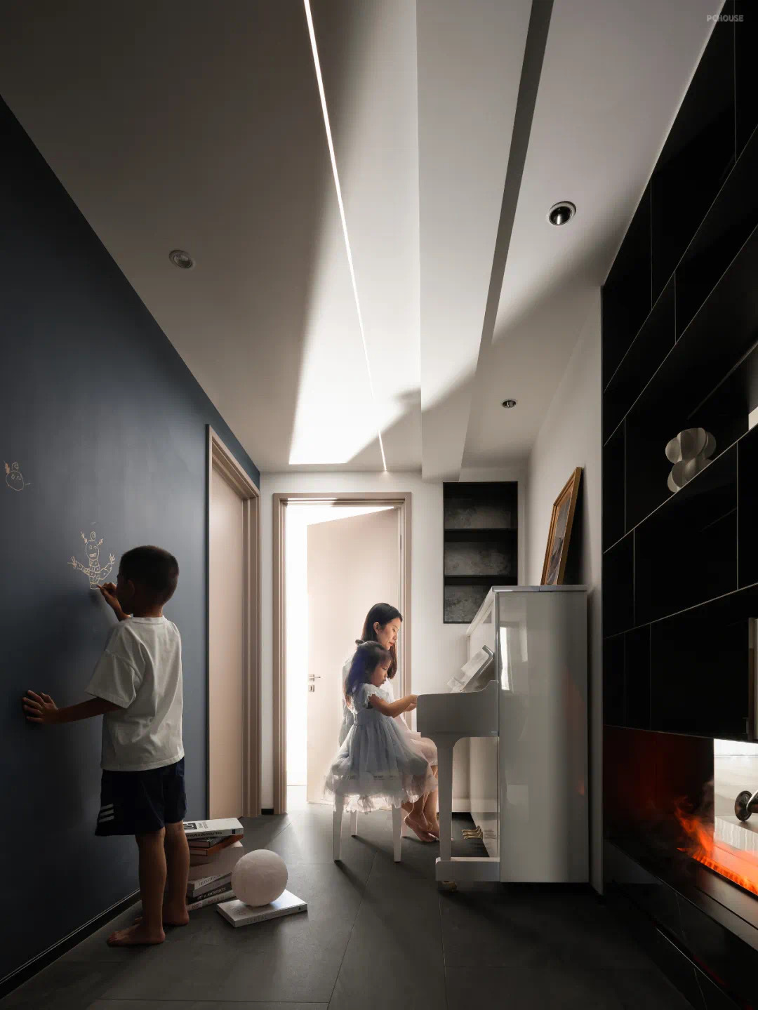 客餐厅和过道之间用镂空的钢板柜间隔,形成一个独立又有交互关系亲子娱教区,既可静享阅读的舒适,又可在学习之余带女儿弹奏钢琴,哥哥则是喜欢在这里涂涂画画,一家人各得其所。