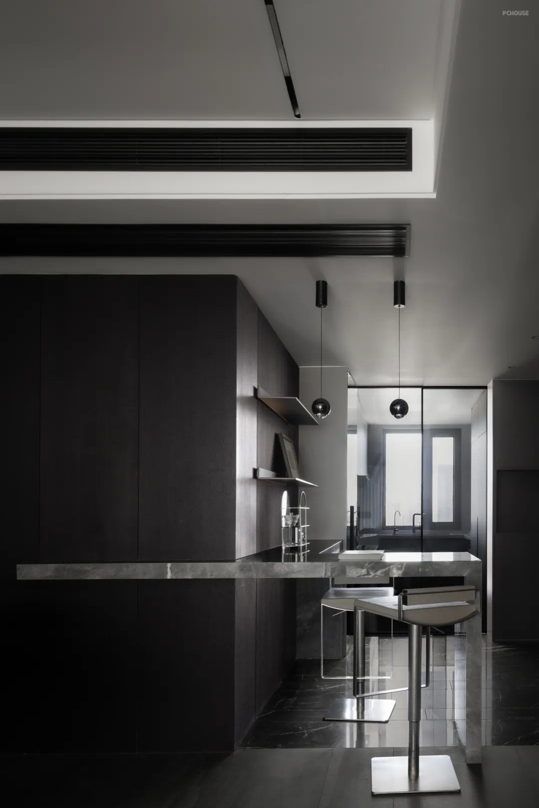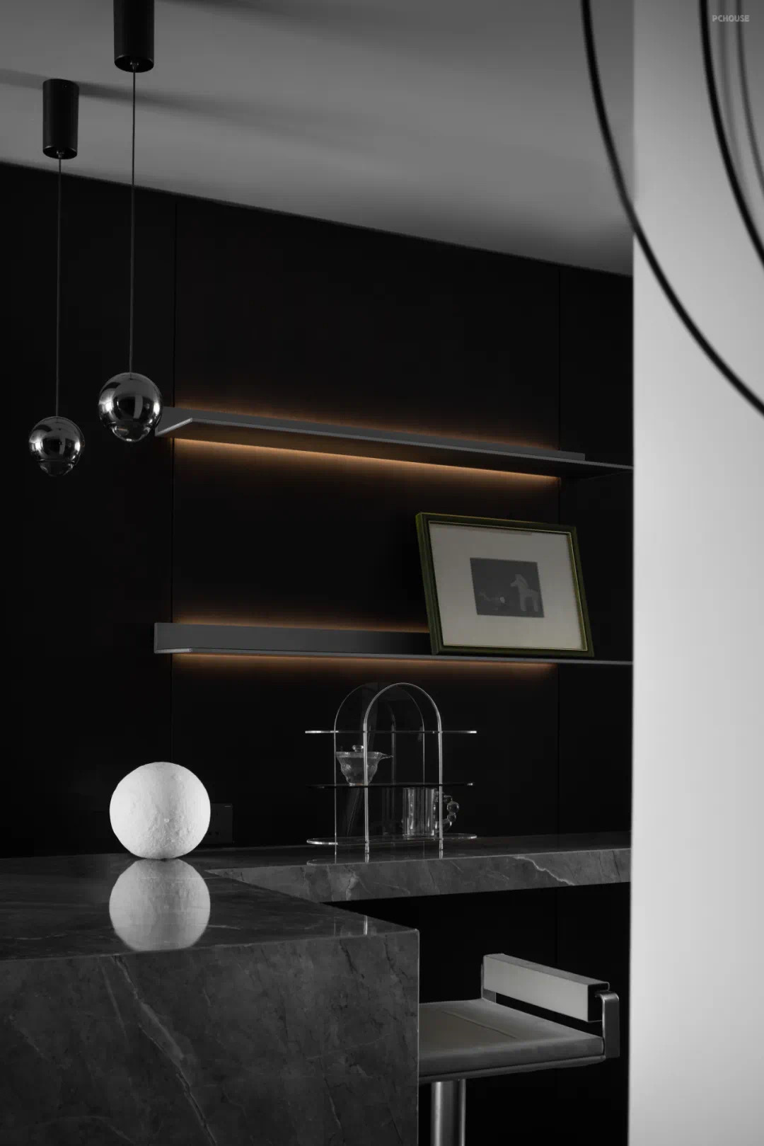 在进行空间规划时,我们彻底颠覆了原有的格局,重新设计了玄关的长度,将原来的入户狭长过道进行优化,将其一部分改造为西厨,另一部分则巧妙变身成为宽敞舒适的玄关。而这个西厨中,有一个亮丽独特的吧台,已成为鱼小姐和朋友们最爱的聚会之所。在这里,品浓郁香醇的咖啡,赏一盘香辣滋味的长沙特色小龙虾,一切尽在眼前,无比惬意,有何不可吾方羡。