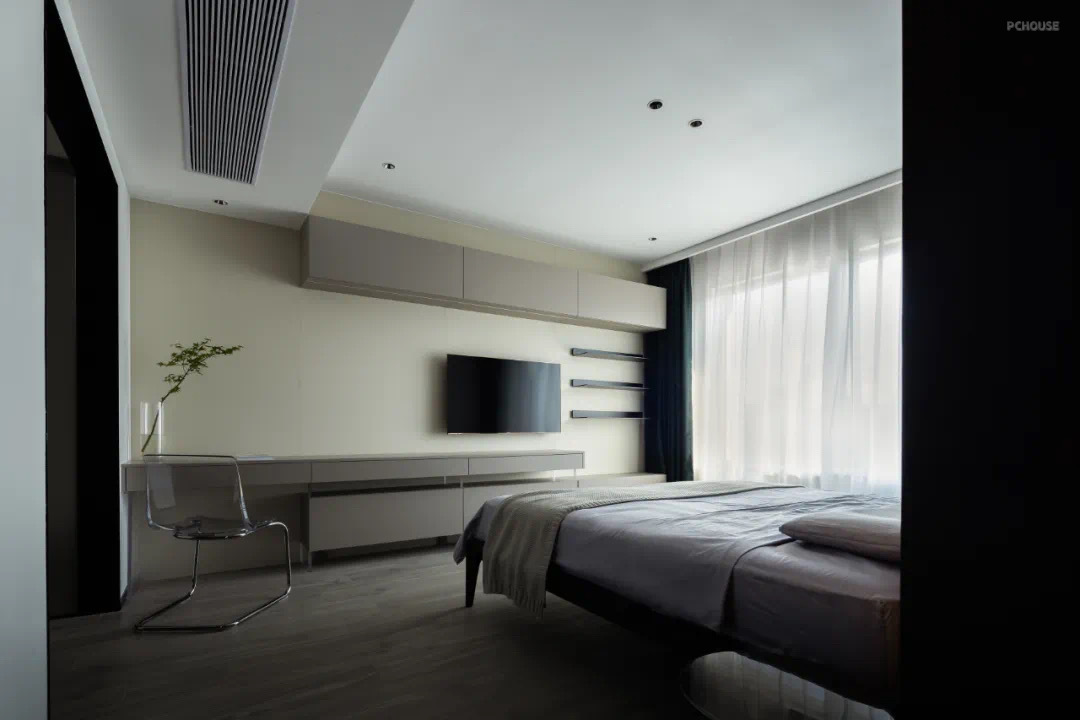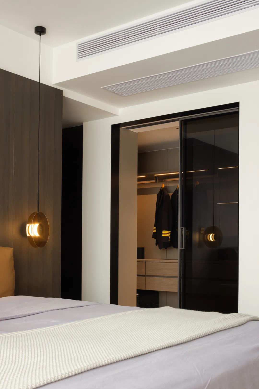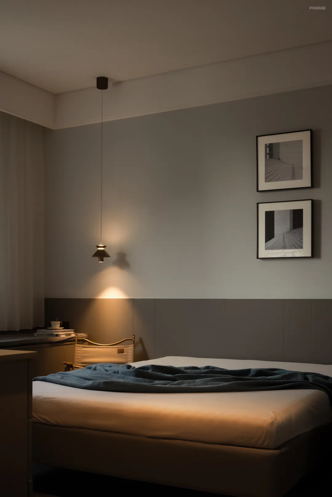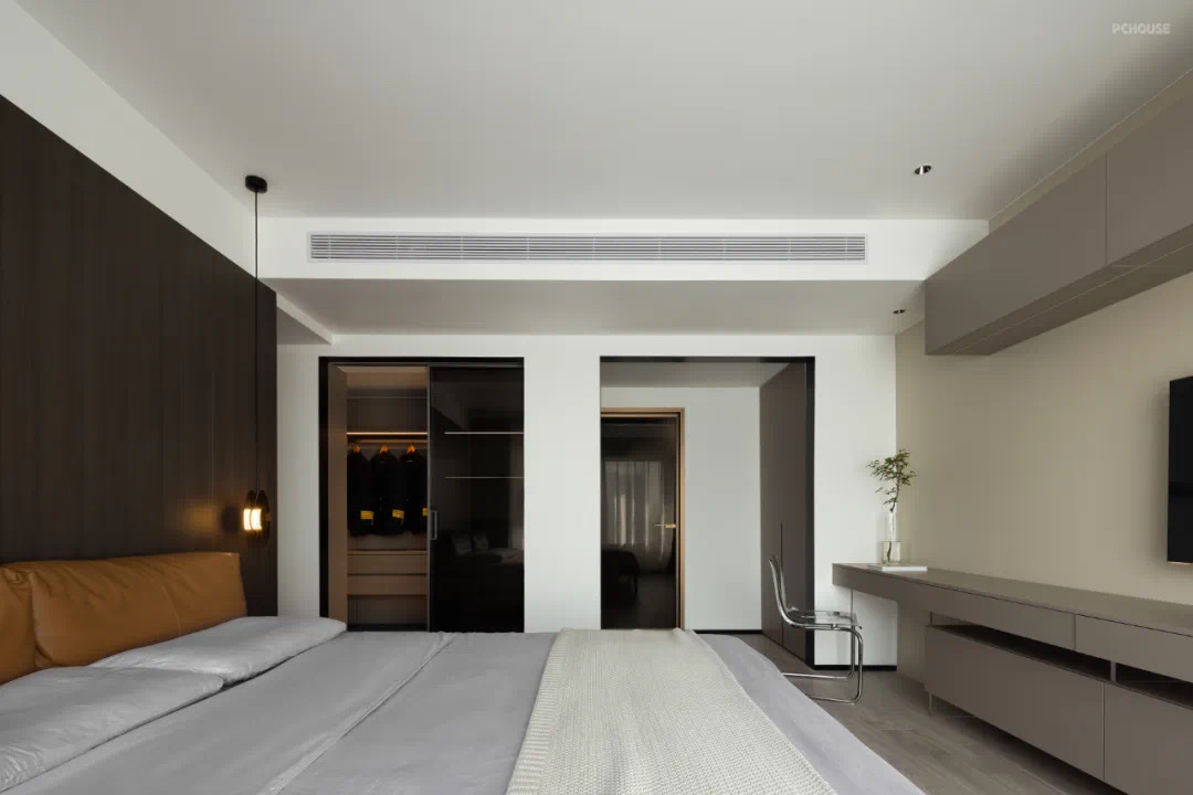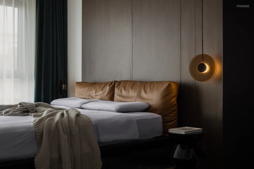 卧室是屋主私人的休息空间,整体设计简洁雅致,焦糖色床头靠背,非常柔软。与硬朗的木质墙面形成了鲜明对比,而床头唱片玻璃吊灯,则呈现了更多的艺术感。