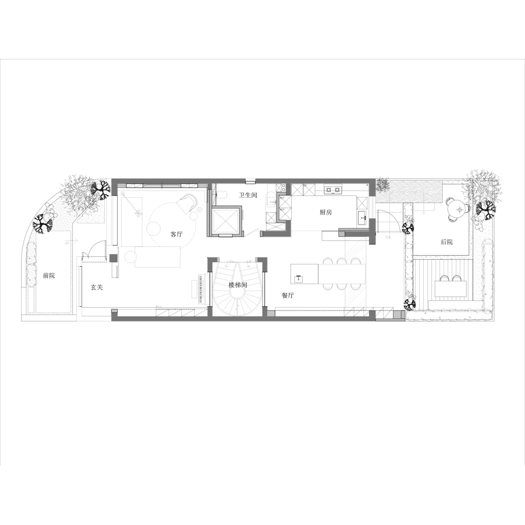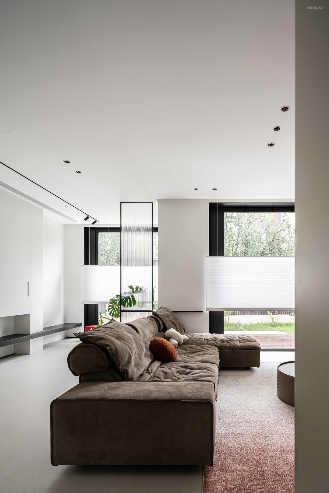 推门入户,豁然开朗的一楼客厅成为空间的第一重奏。整面落地窗将葱郁小院景致无缝引入室内,光与绿意在此自由流淌,模糊了内与外的界限。