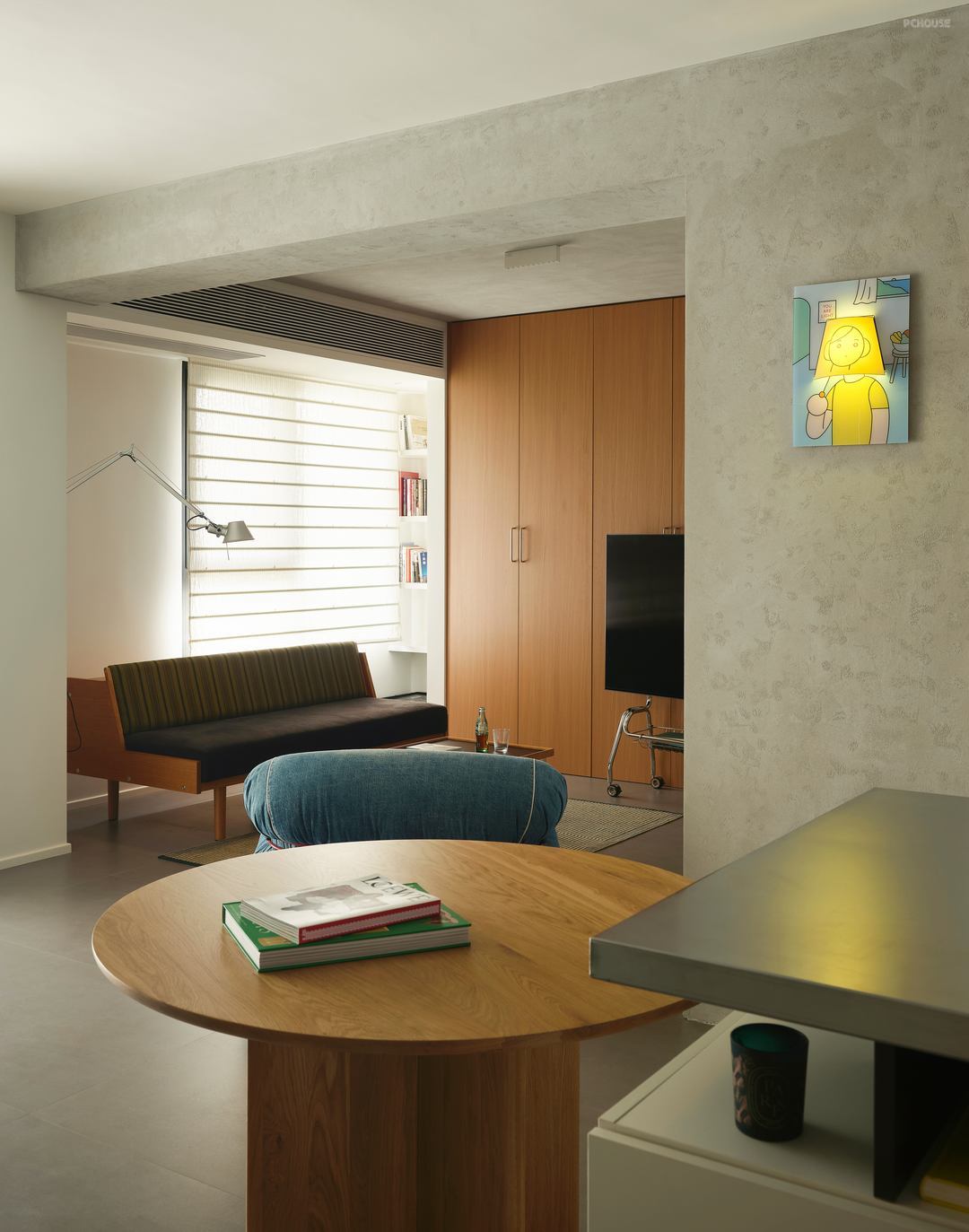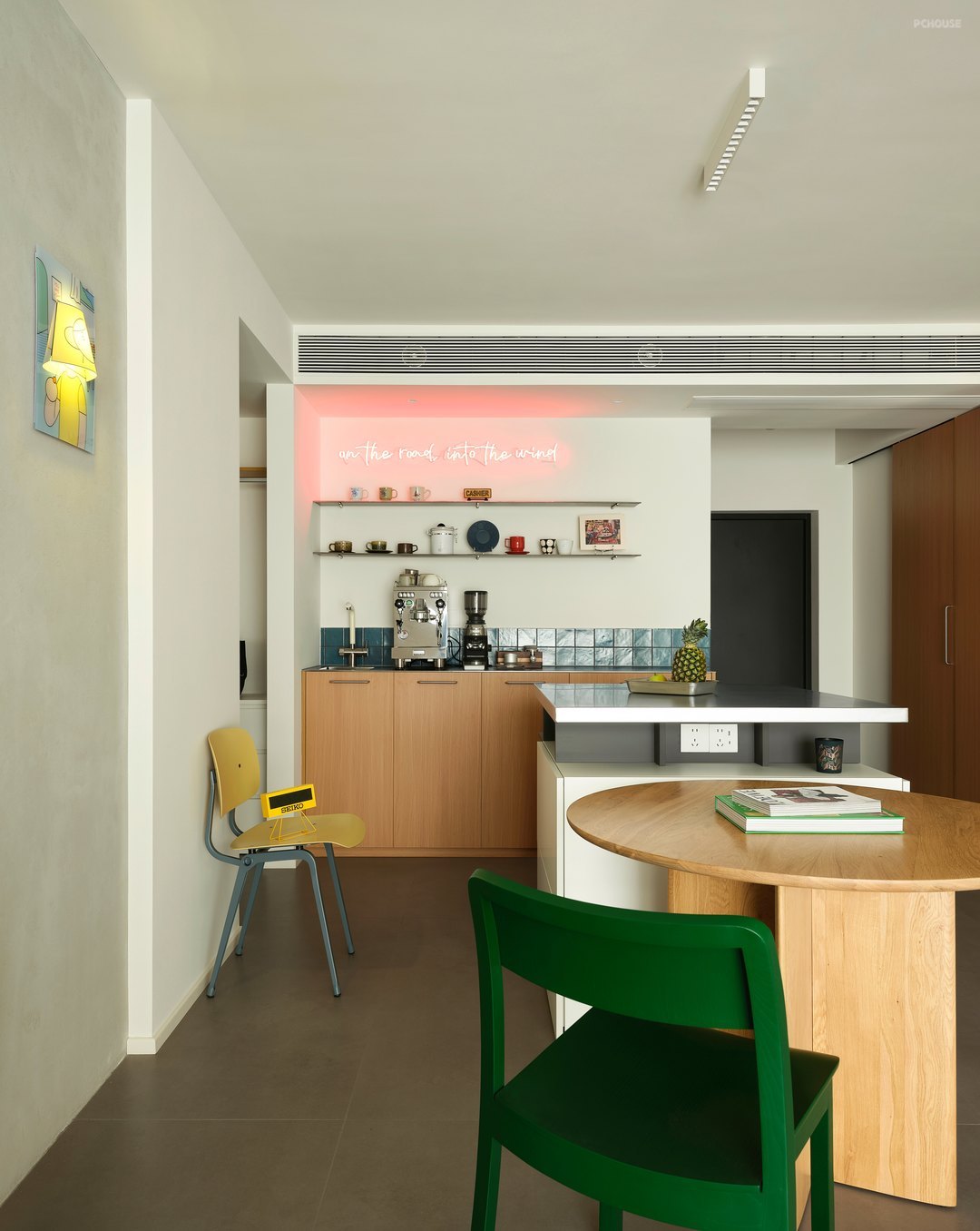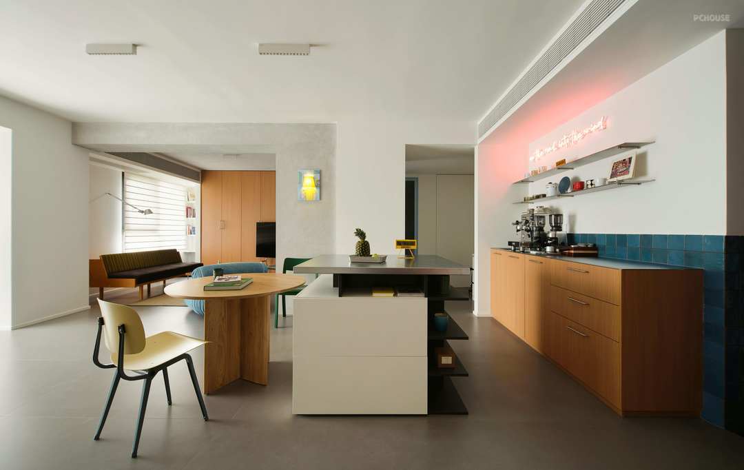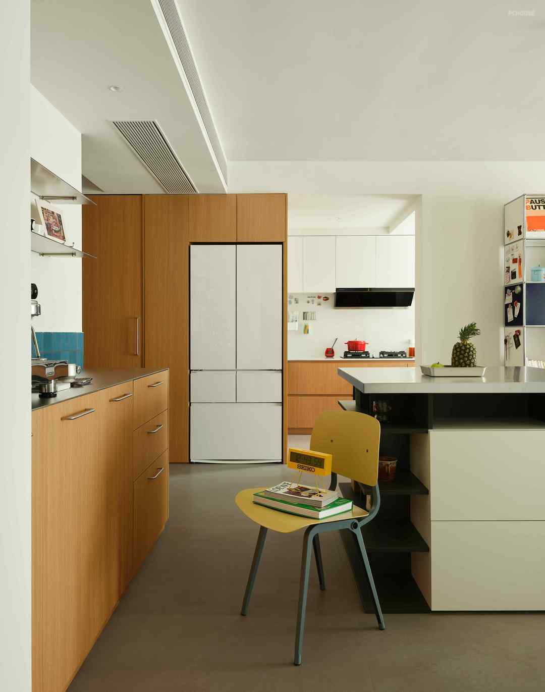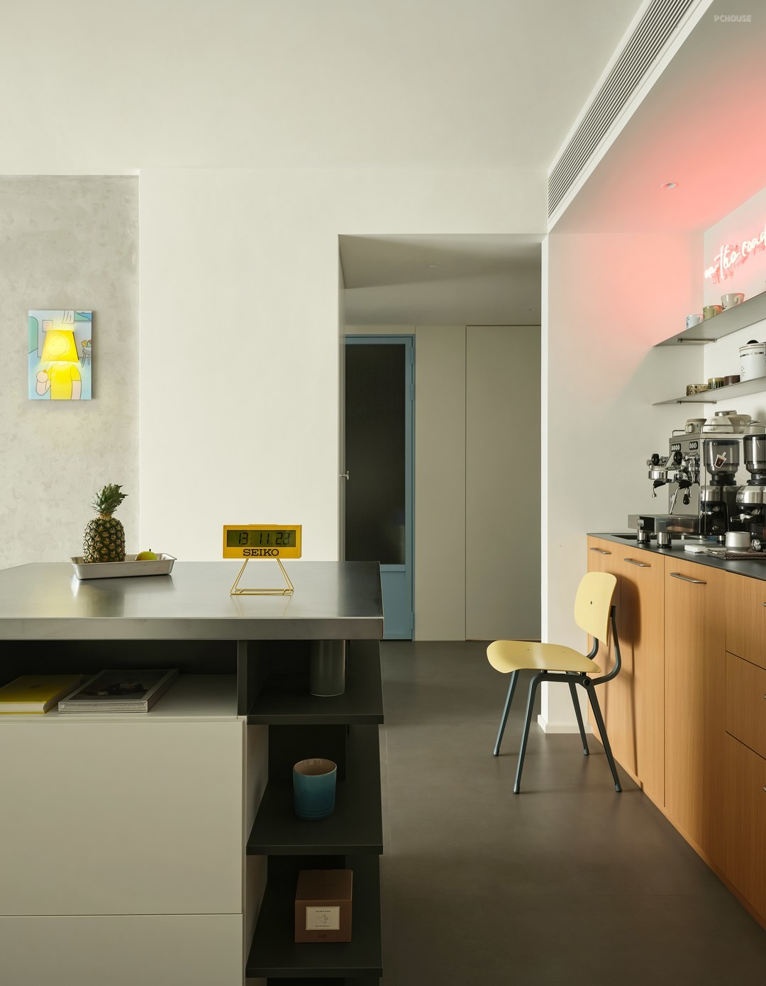 拒绝复杂造型,仅通过简单分色处理材质,将不锈钢、水泥墙、木色等元素协调融合,避免风格标签,符合屋主“不被定义”的需求。