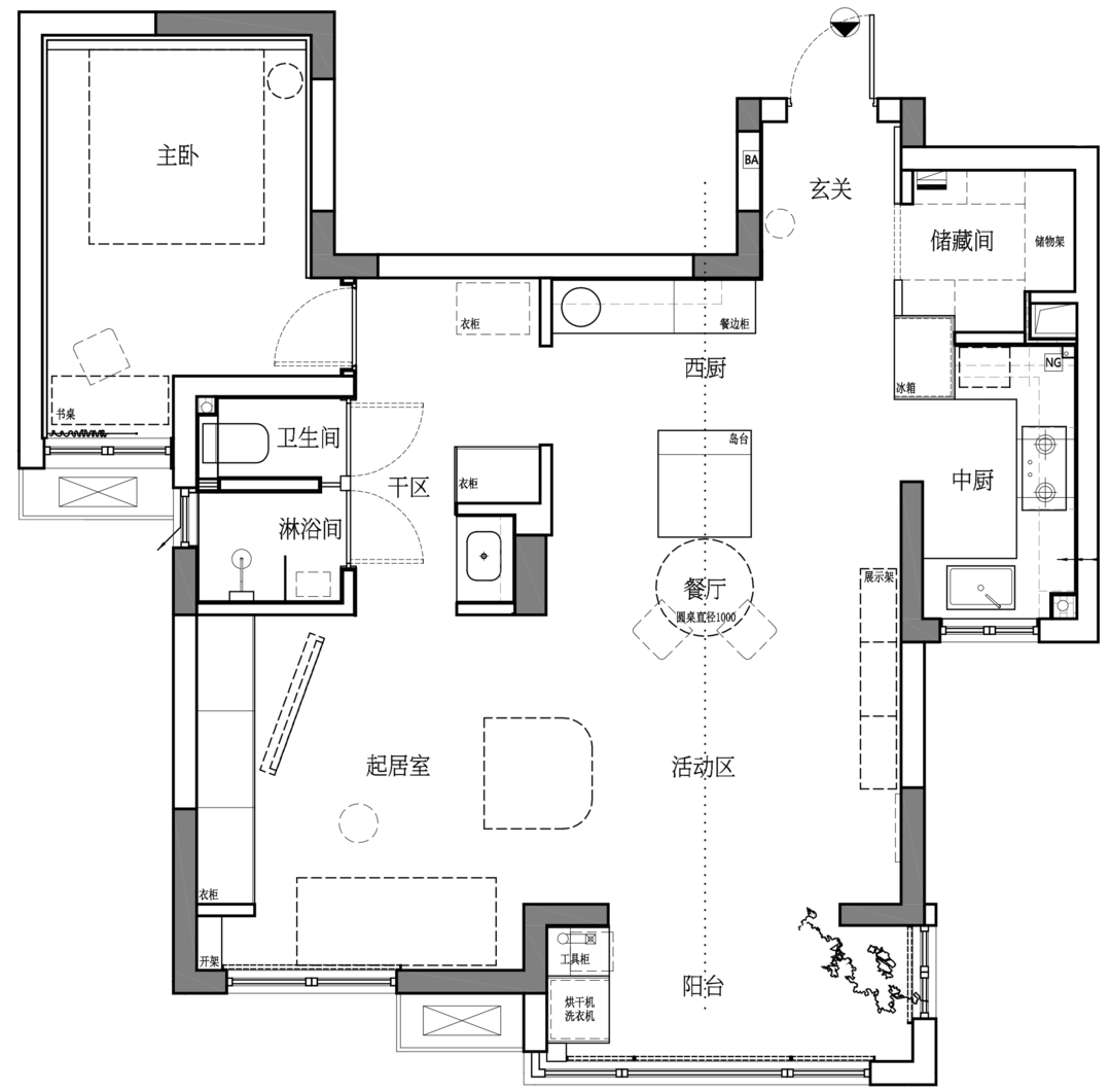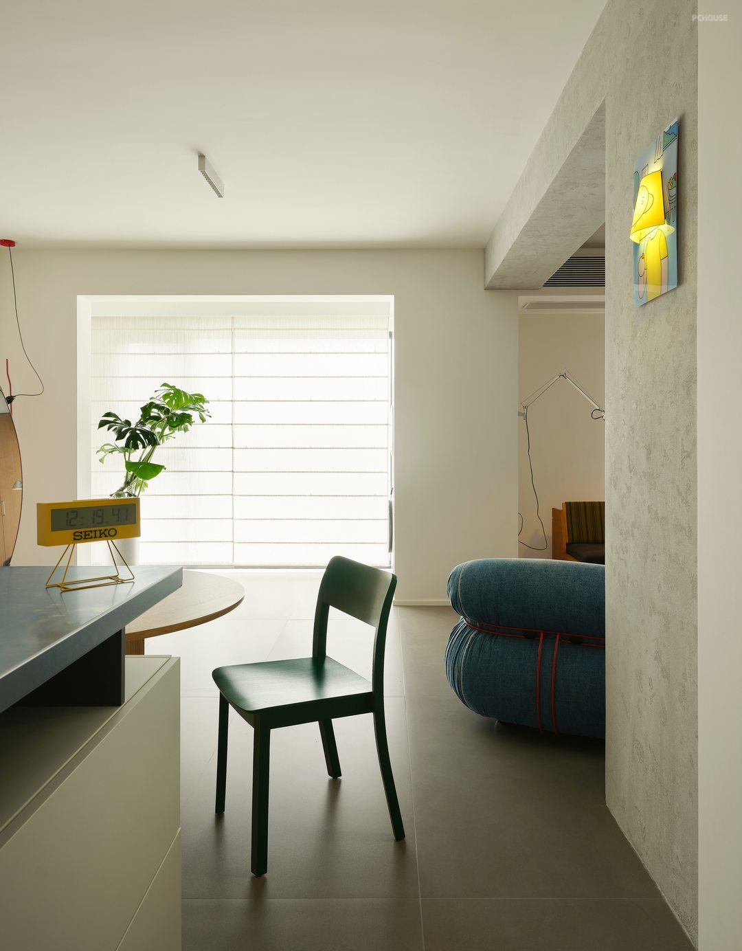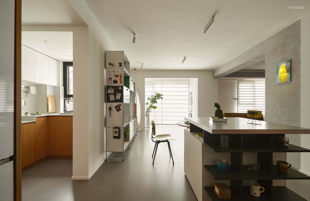 左边储藏室把原有的开门改成移门,减少开关门对储藏空间的影响。并且让移门和相邻的冰箱柜体形成一个整体,以体块关系把视线和动线往生活区引导。