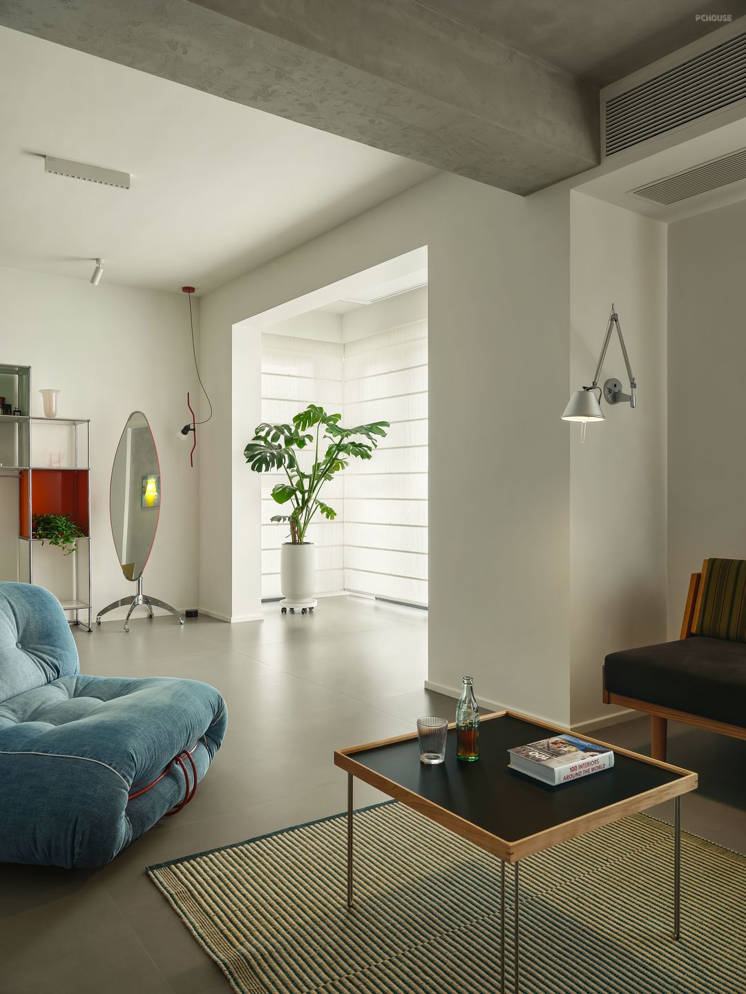 卫生间的区域以白色体块的形式卡在了清水混凝土结构的下面形成了一个和外围白色界面呼应的界面。顶面以清水混凝土材质和白色做区分。