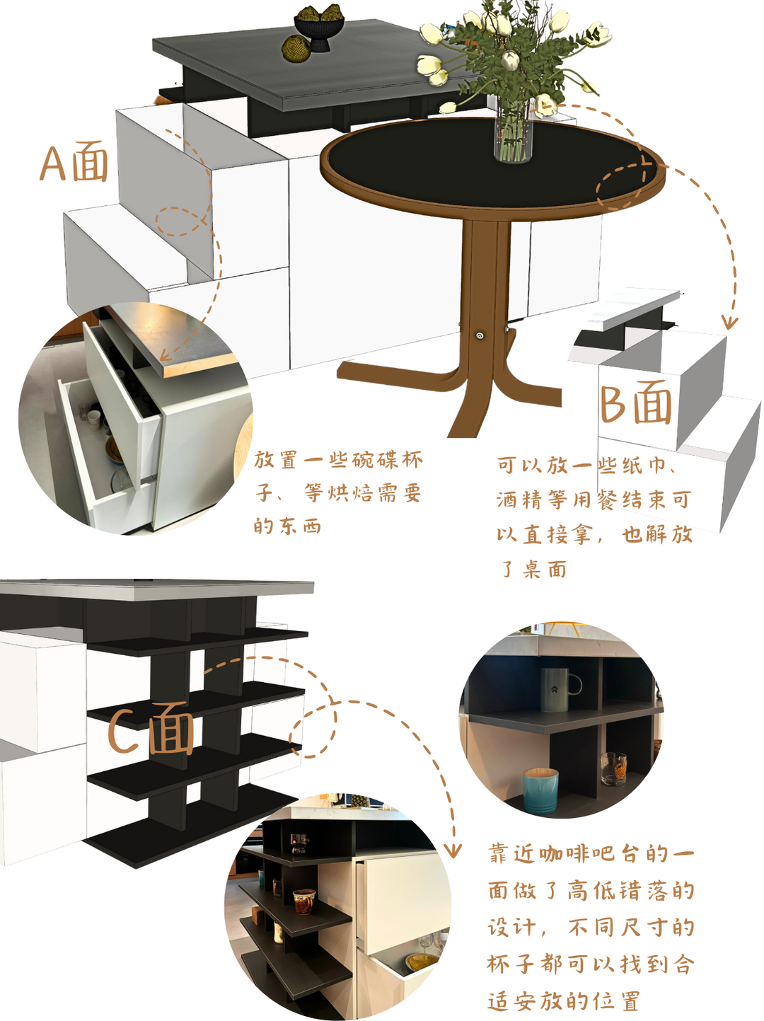 岛台做了三面的收纳并采用“分层设计”:白色体块做成储藏式抽屉,不锈钢台面负责操作,中间用黑色板片串联,既隐藏餐桌插座,又形成“虚空间”可放置常用器具,兼顾颜值与实用。