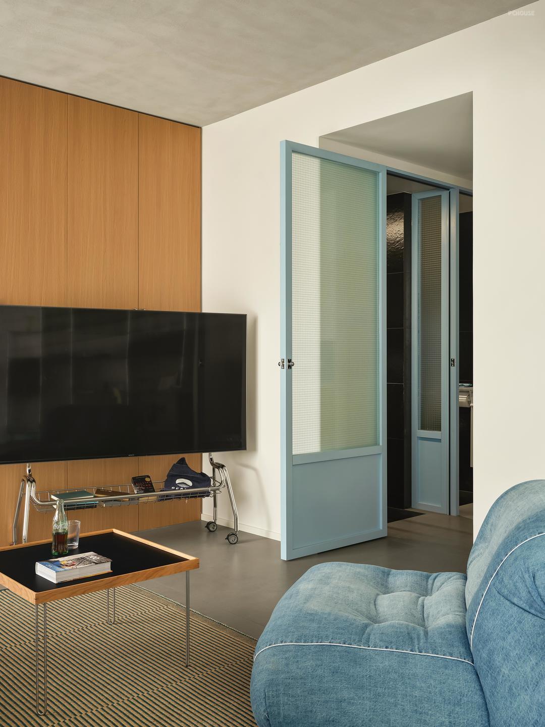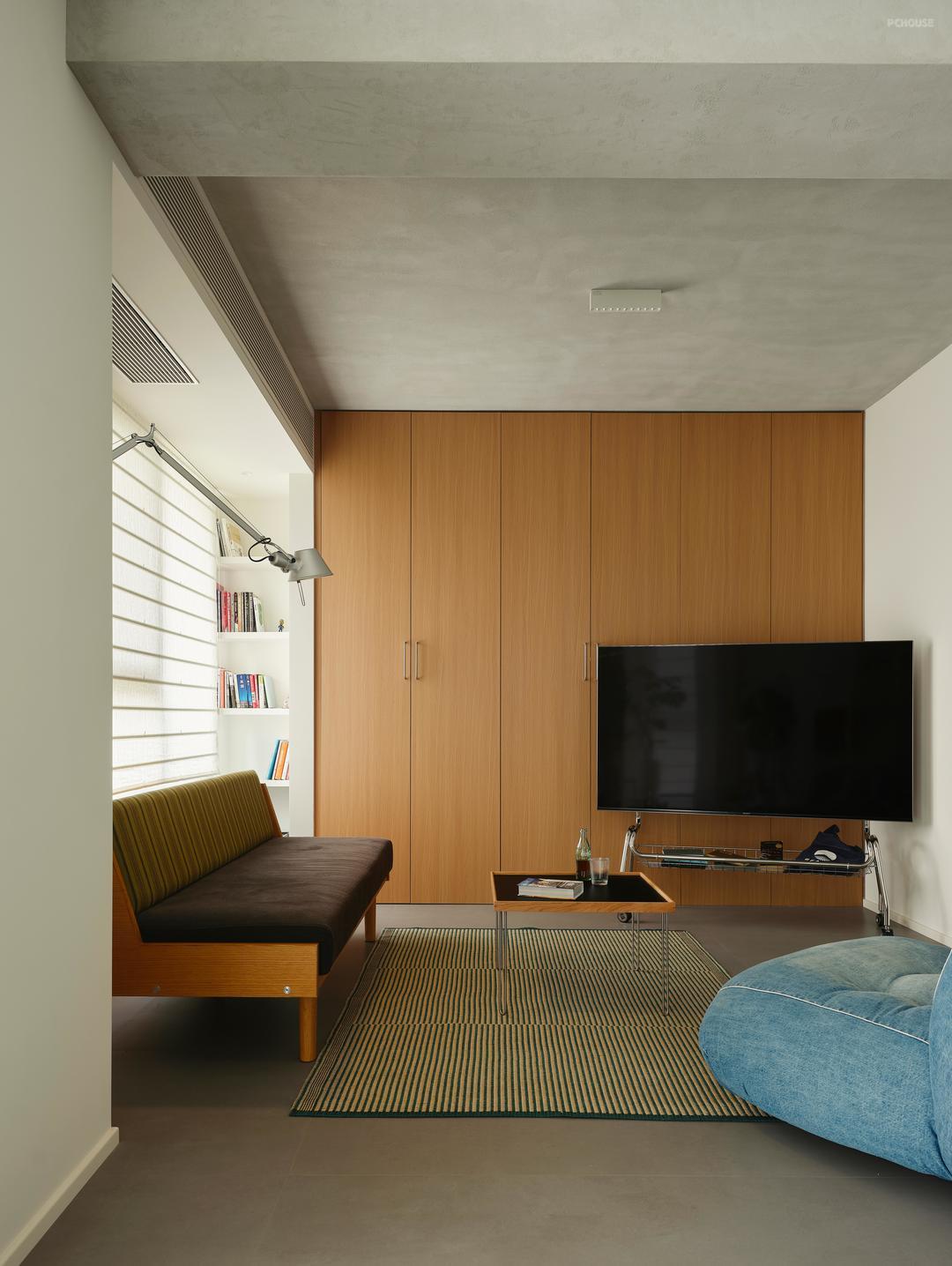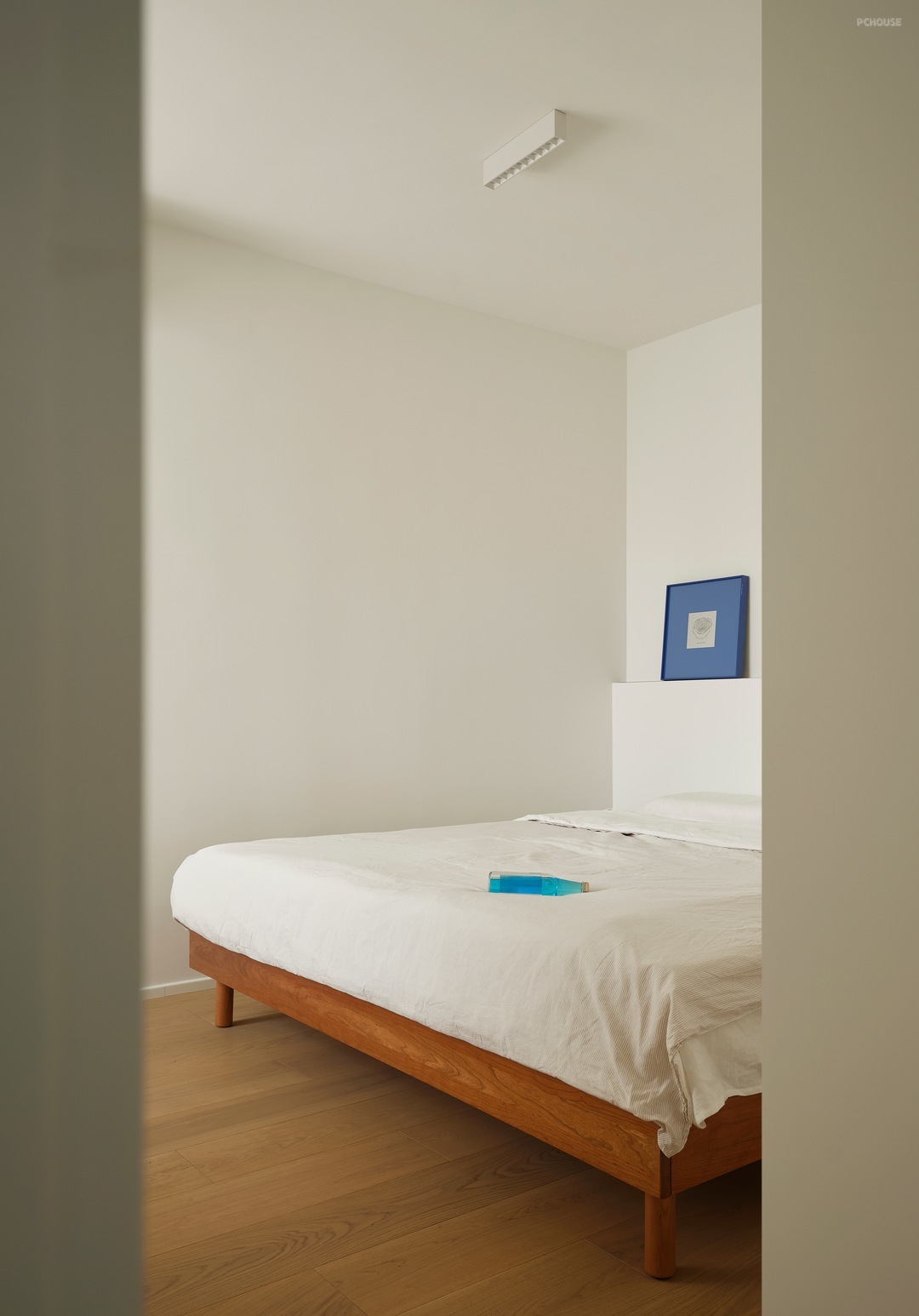 作为被梁和墙体围合的区域,结合储藏需求,做了整面的折叠门衣柜。门板以一个完整的木饰面控住了整个空间。