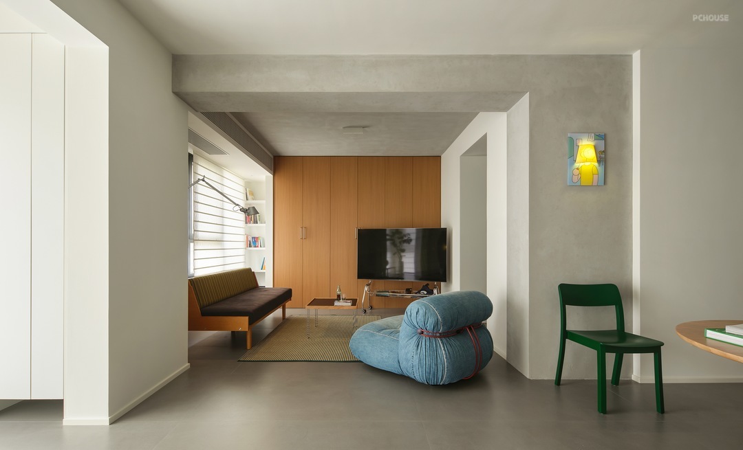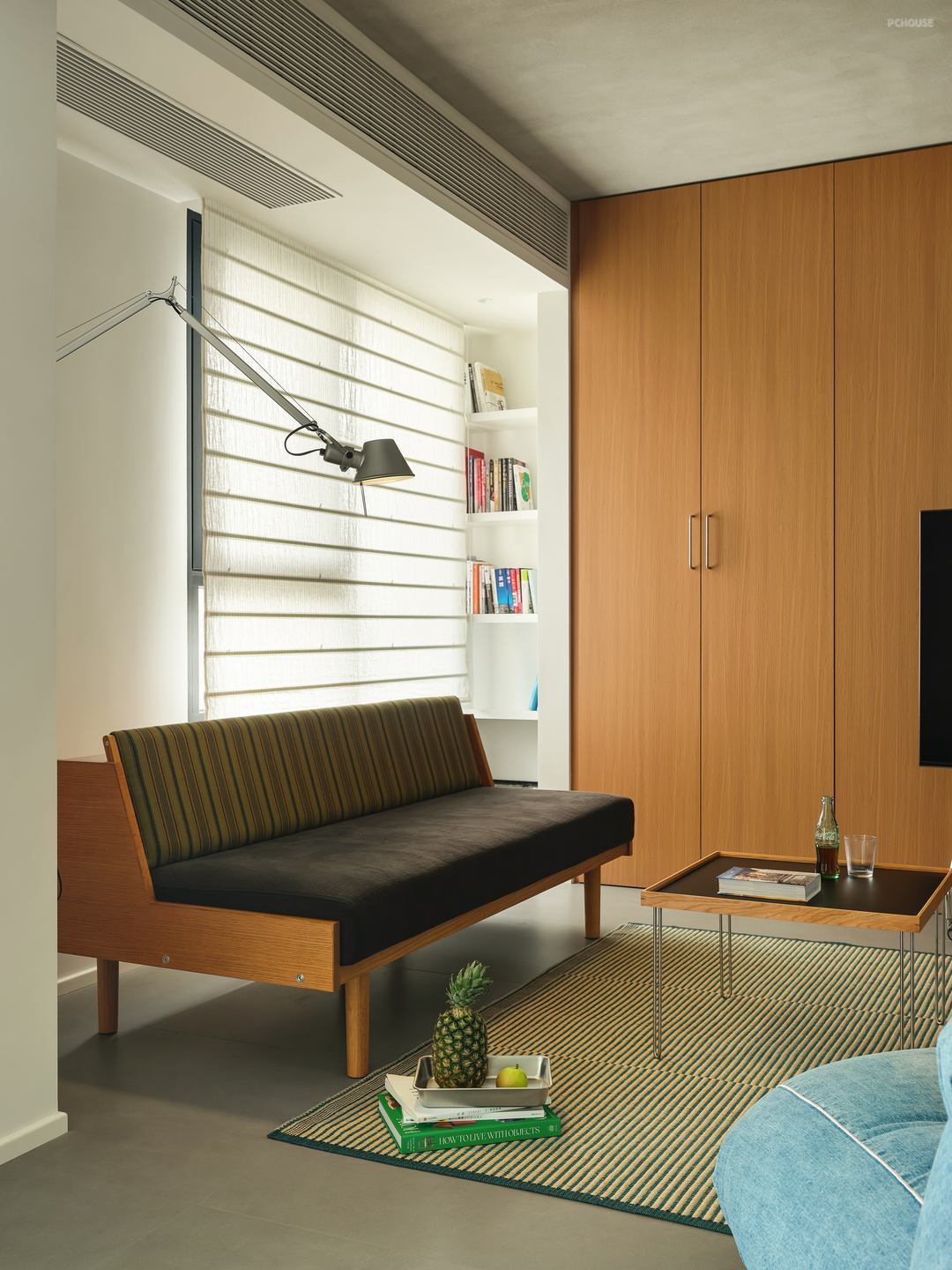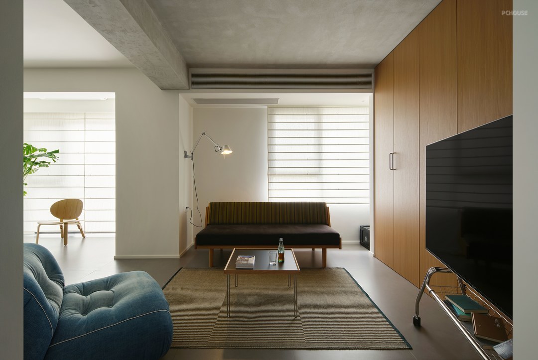作为被梁和墙体围合的区域,结合储藏需求,做了整面的折叠门衣柜。门板以一个完整的木饰面控住了整个空间。