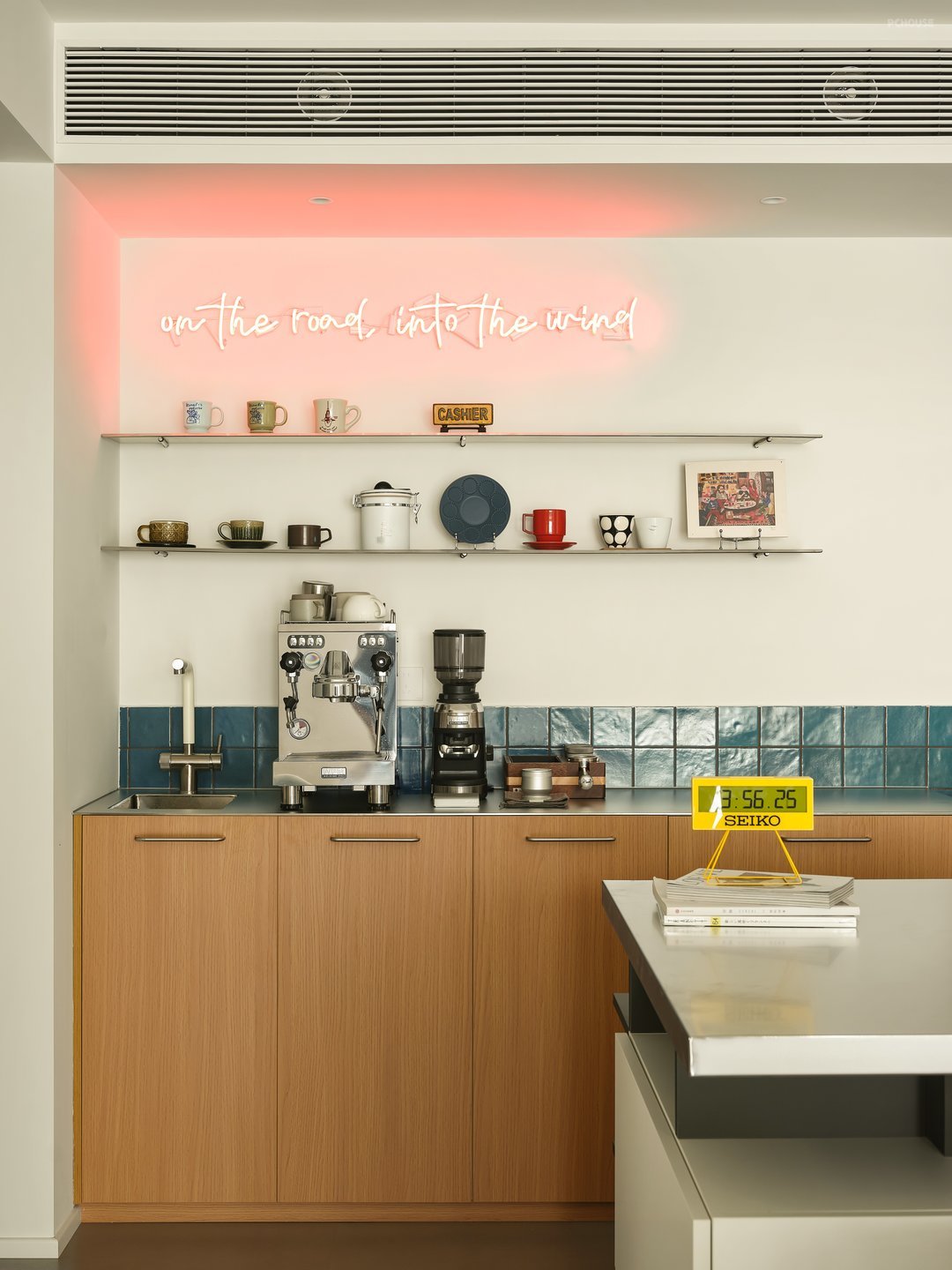 岛台承担咖啡制作、揉面操作双重功能,台面选用不锈钢材质,方便咖啡渍、面粉清洁,贴合日常使用。