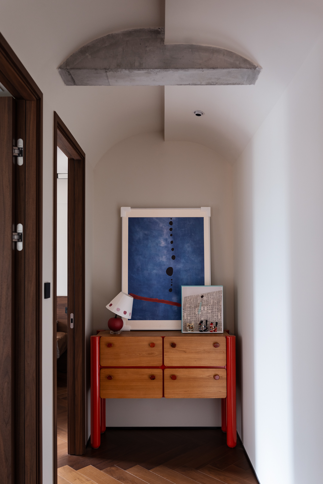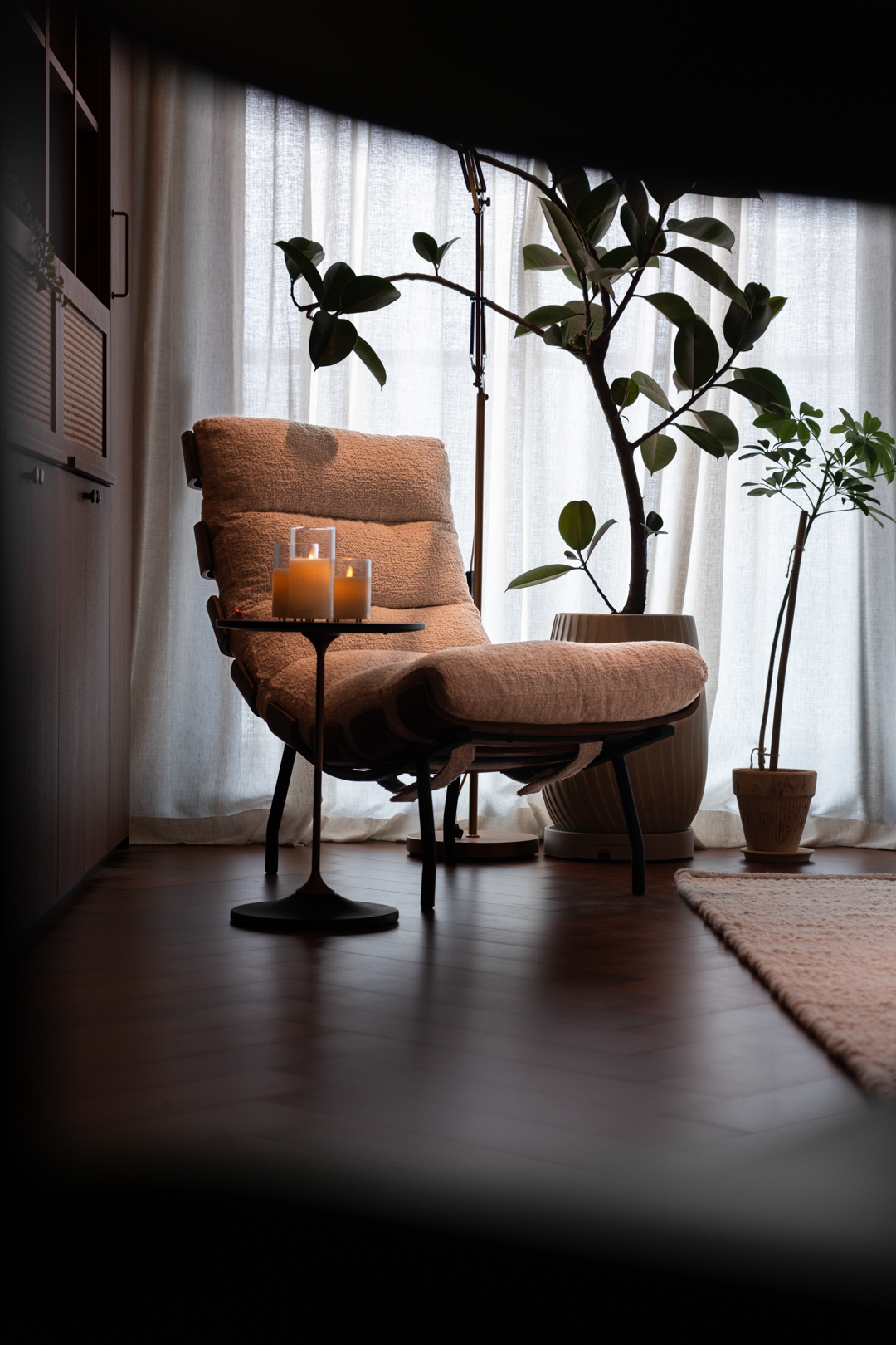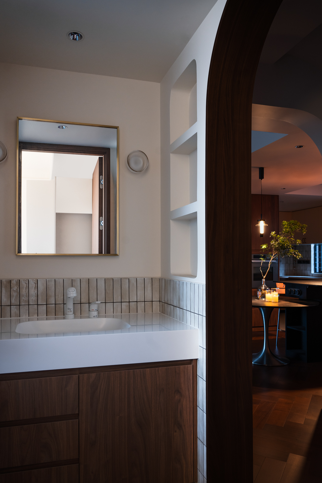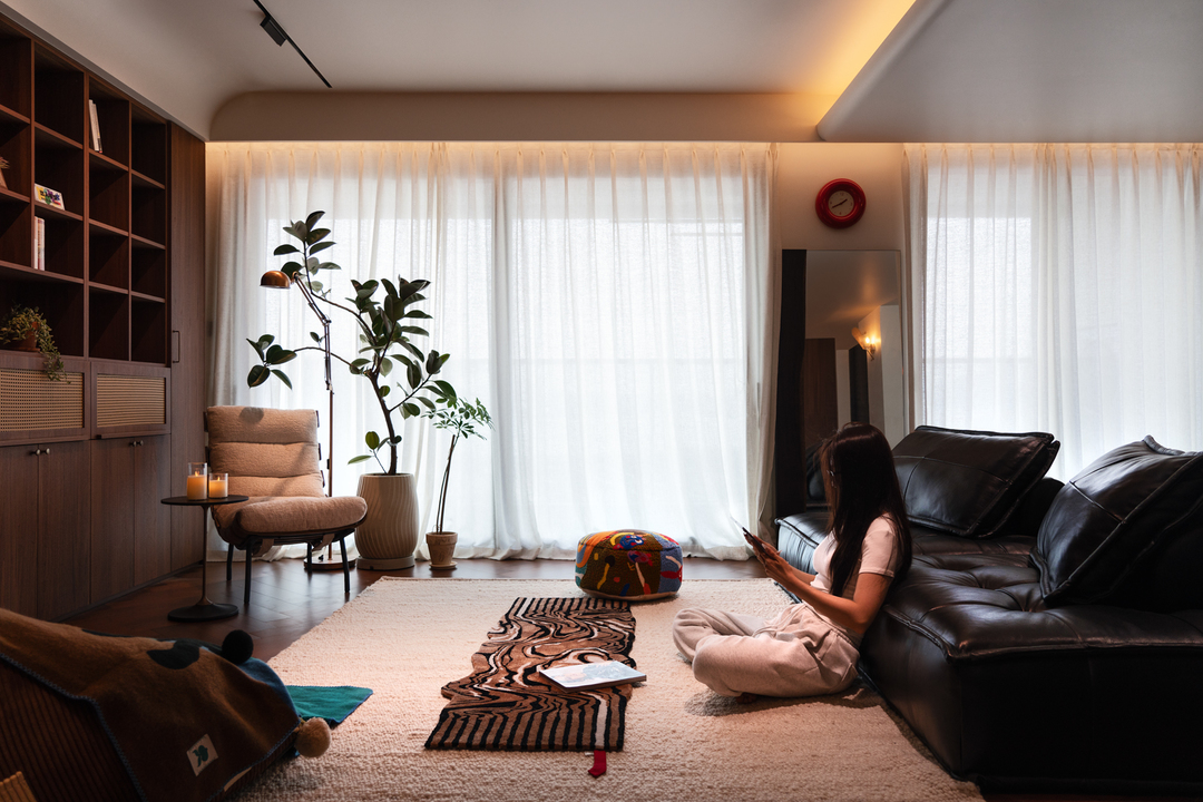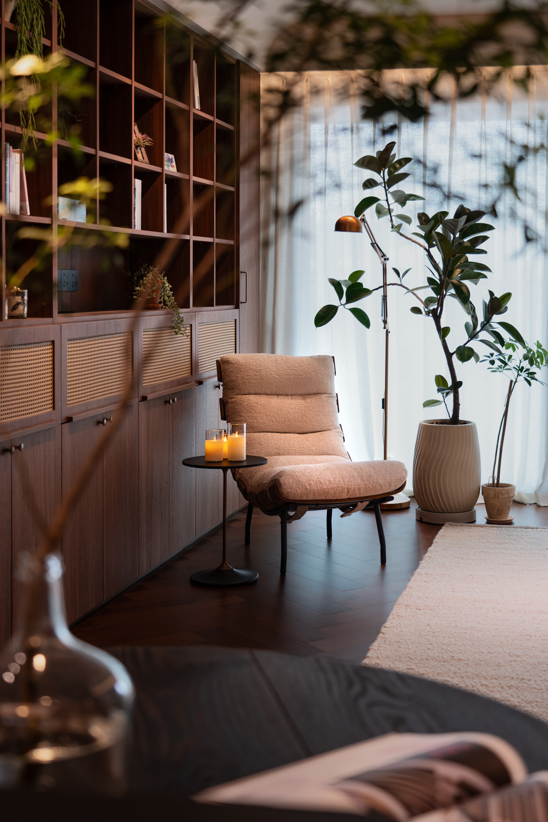 我们以“温暖治愈”为核心理念,通过材质、光影与自然元素的有机融合,构筑了一个兼具时光温度与现代呼吸感的居住场景。以低饱和的奶油色、陶土棕为底色,搭配胡桃木、藤编等中古元素,奠定沉稳而柔和的基调;而弧形线条、丰富的绿植与点缀灯光,赋予空间拥有更多的情绪及温暖的调性。绿植不仅是装饰,更是空间节奏的调节器。一棵高大的黄金榕在单椅上方伸展枝干,其摇曳的阴影成为白墙上的动态艺术,也形成了舒适的休闲角,餐桌上的马醉木及咖啡吧边上的蓝花楹,模糊了家具与自然的界限,实现空间、人与自然的有机共生形态。