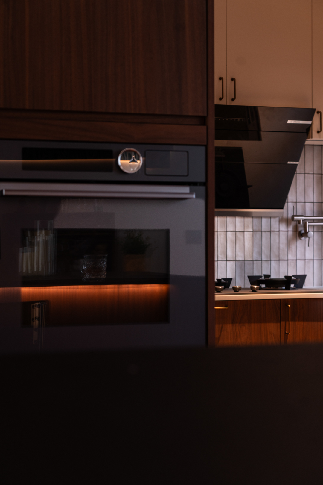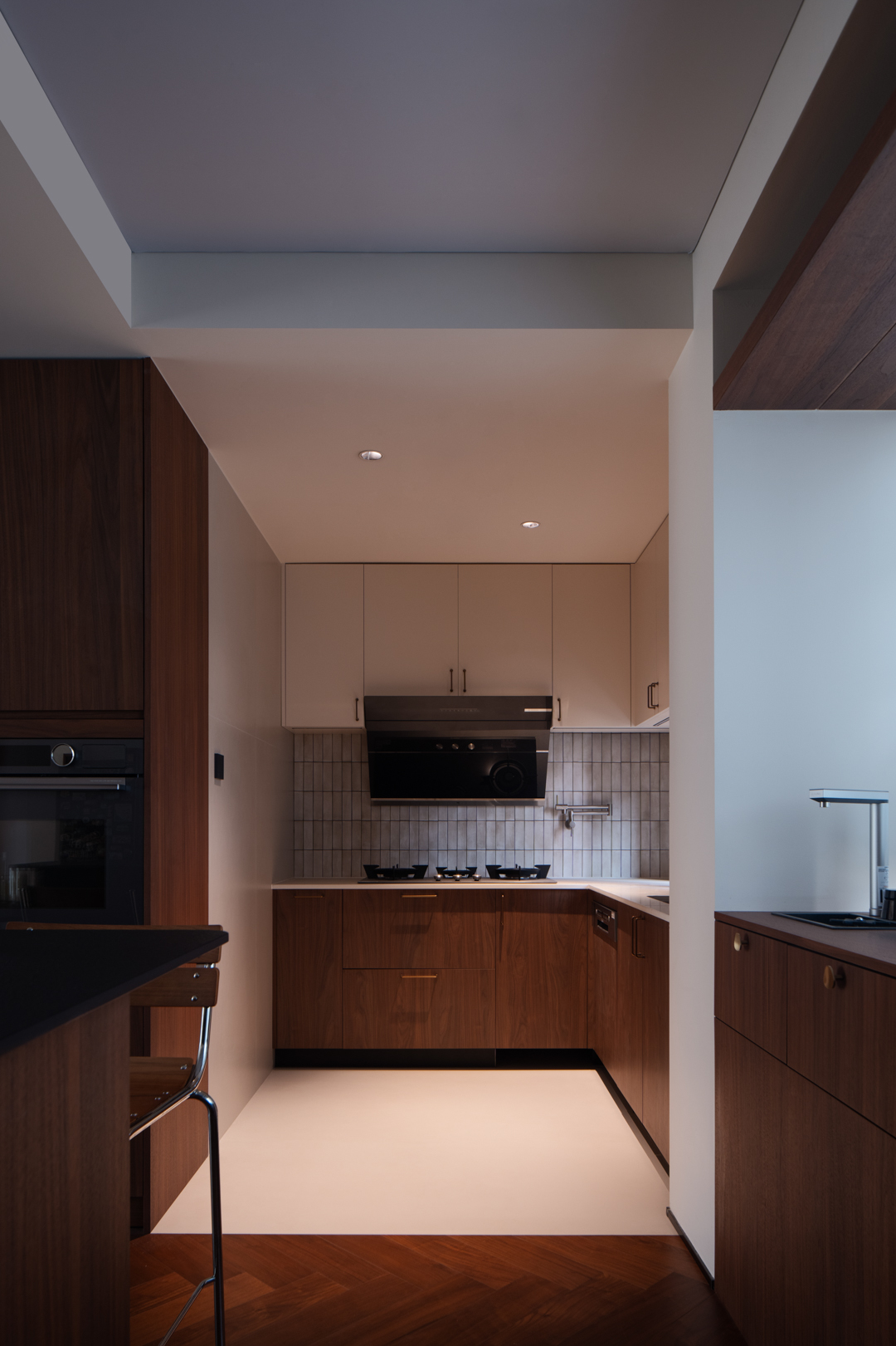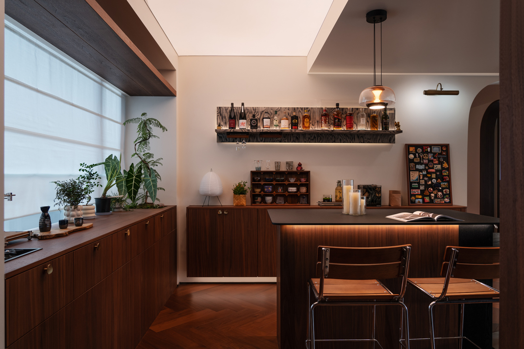 灵动地让空间具备更多的形态,满足不同生活场景的需求。原始入户鞋柜功能单一,我们巧借厨房空间增加了八百库,空间虽不大,但足以满足一家储物需求。餐厨区是整个家最具烟火气的区域,就餐区,西厨区与中厨区互动性强的同时,又保证了各空间的独立性,中古调性的色系混搭美式吧台的形式,空间毫无违和感,却营造了日咖夜酒的松弛氛围。融合丰富的绿植点缀,让整个餐厨区更具备生气及呼吸感,让家的“深夜食堂”治愈了一切疲惫情绪。