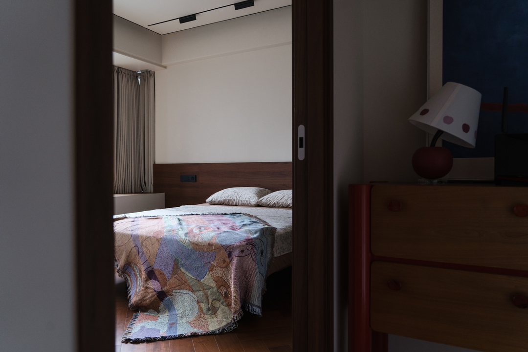 设计师将原始四房敲掉了入户的一个房间,将空间打开,将客厅与书房的使用功能进行了合并,客厅没有中规中矩的功能布局,摒弃传统电视背景墙及沙发摆放方式,而是留有足够的空间允许生活带来的可变性,可以是儿童友好的亲子活动天地,亦可以是自由随性的书吧。