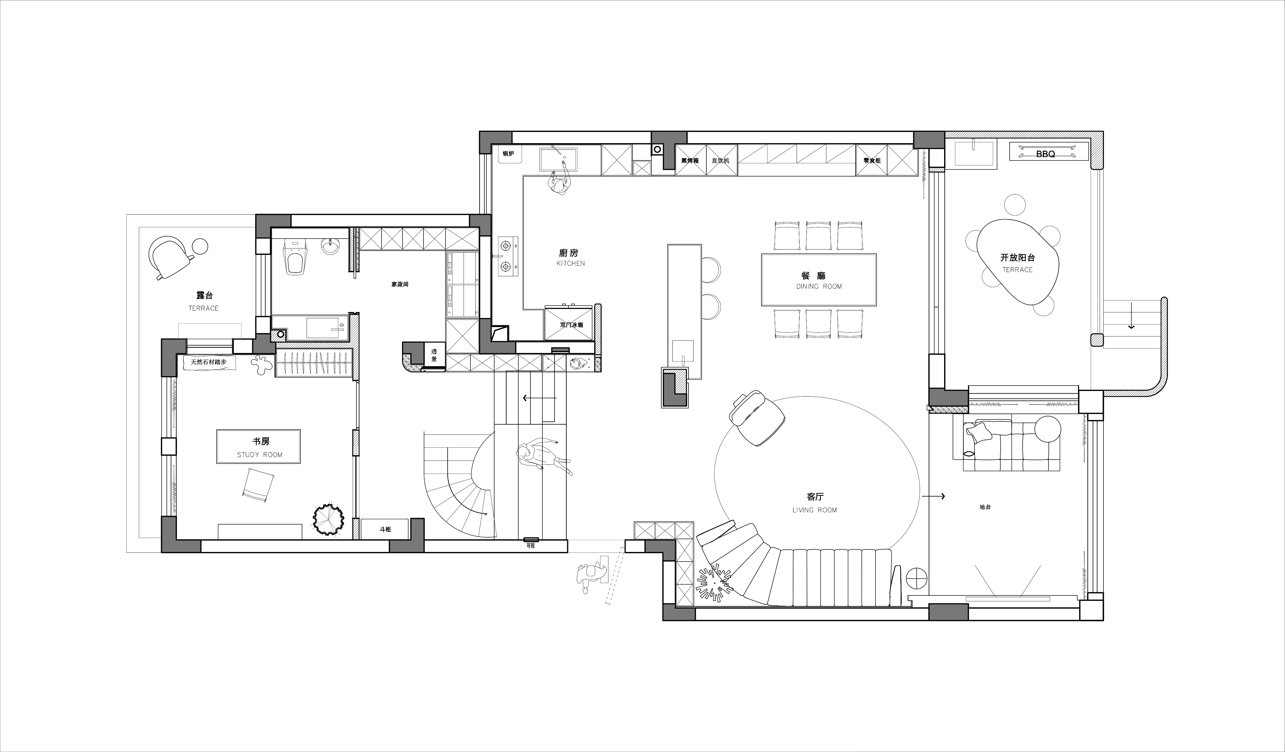 通过原石踏步连接工作区与东侧露台,为大脑提供自然的呼吸空间。