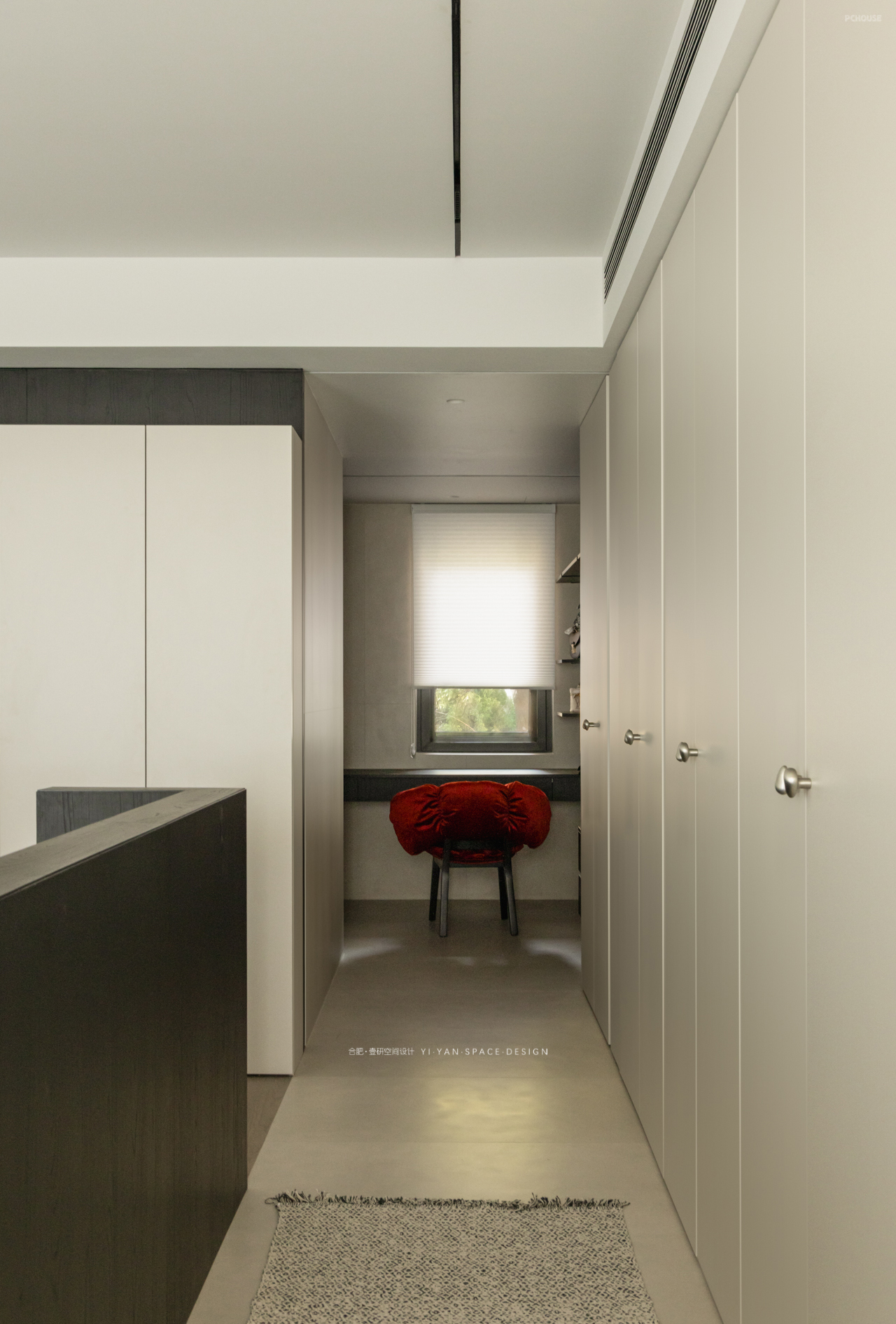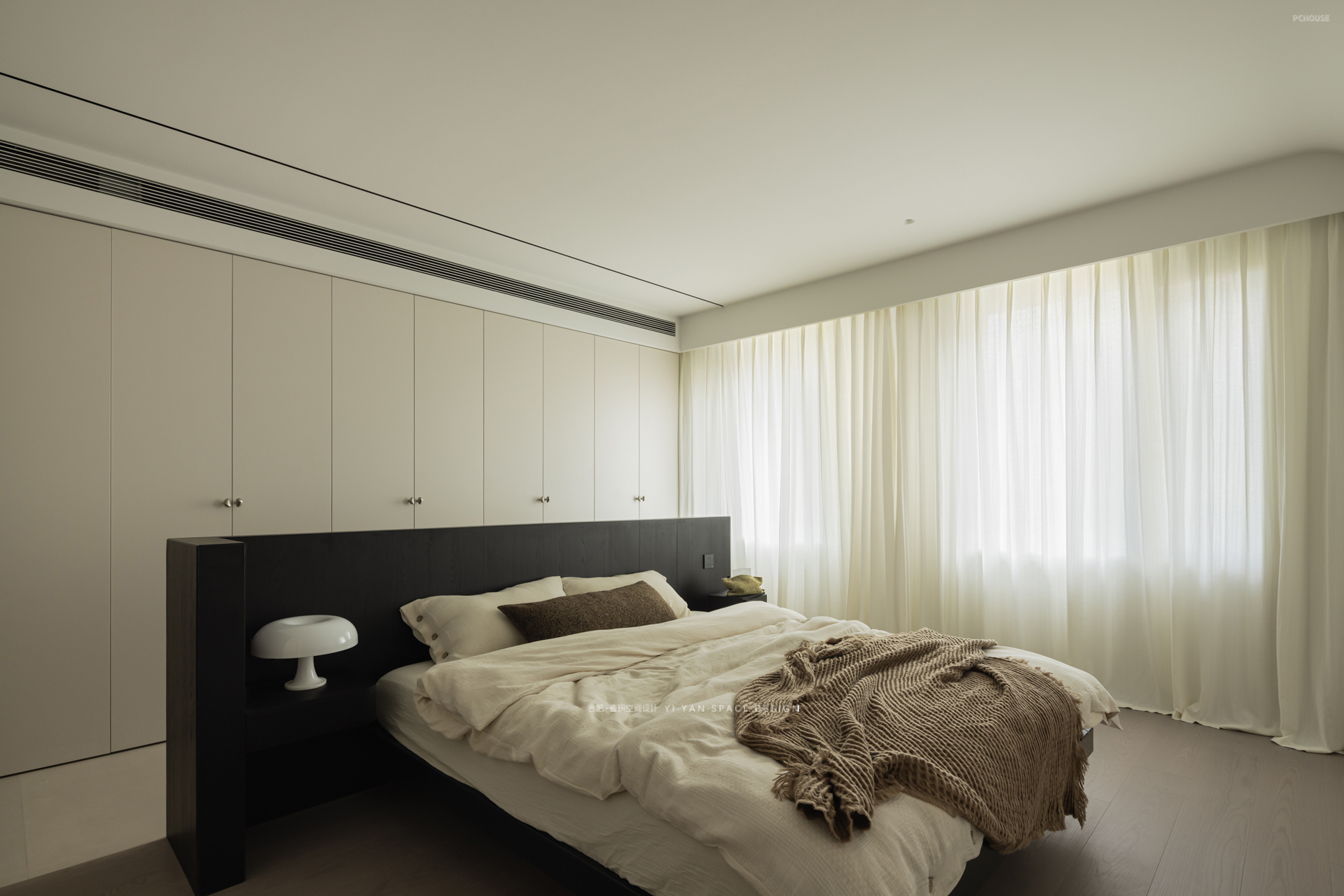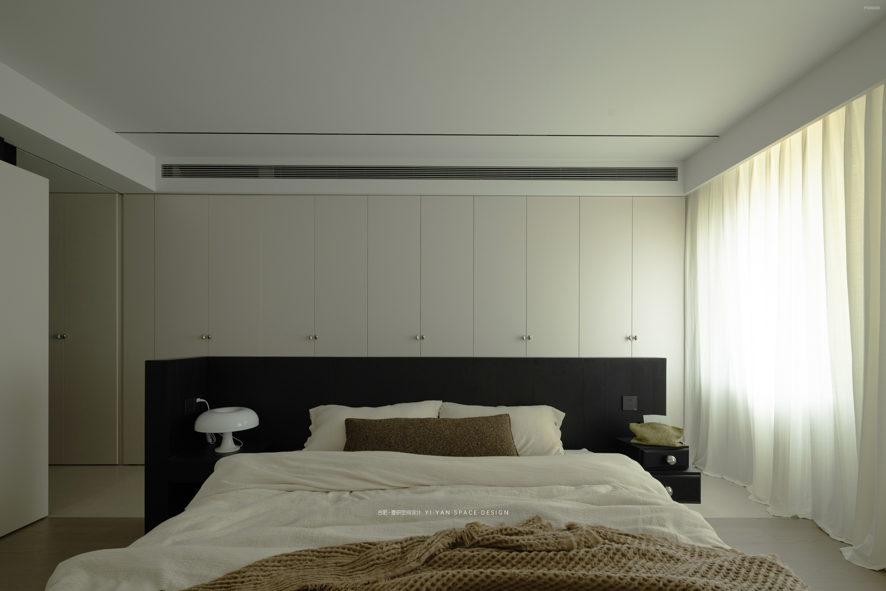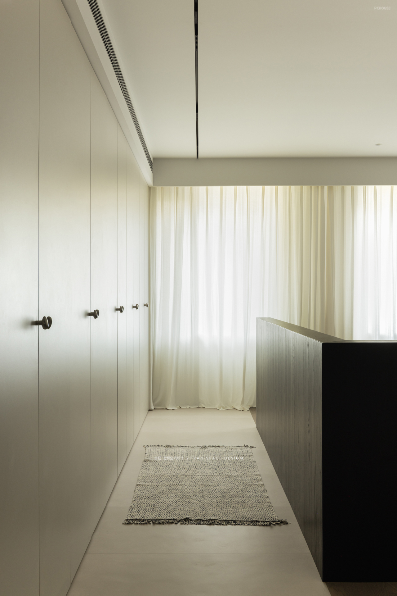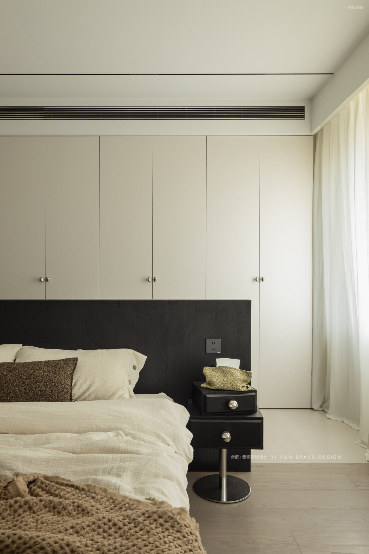 原本的主卧被墙体割裂,收纳零散、动线迂回。而我们以「床为核心」重塑格局——洄游动线激活空间:床体居中形成环形通道,串联整排衣柜与卫生间入口,动线缩短,收纳翻倍;