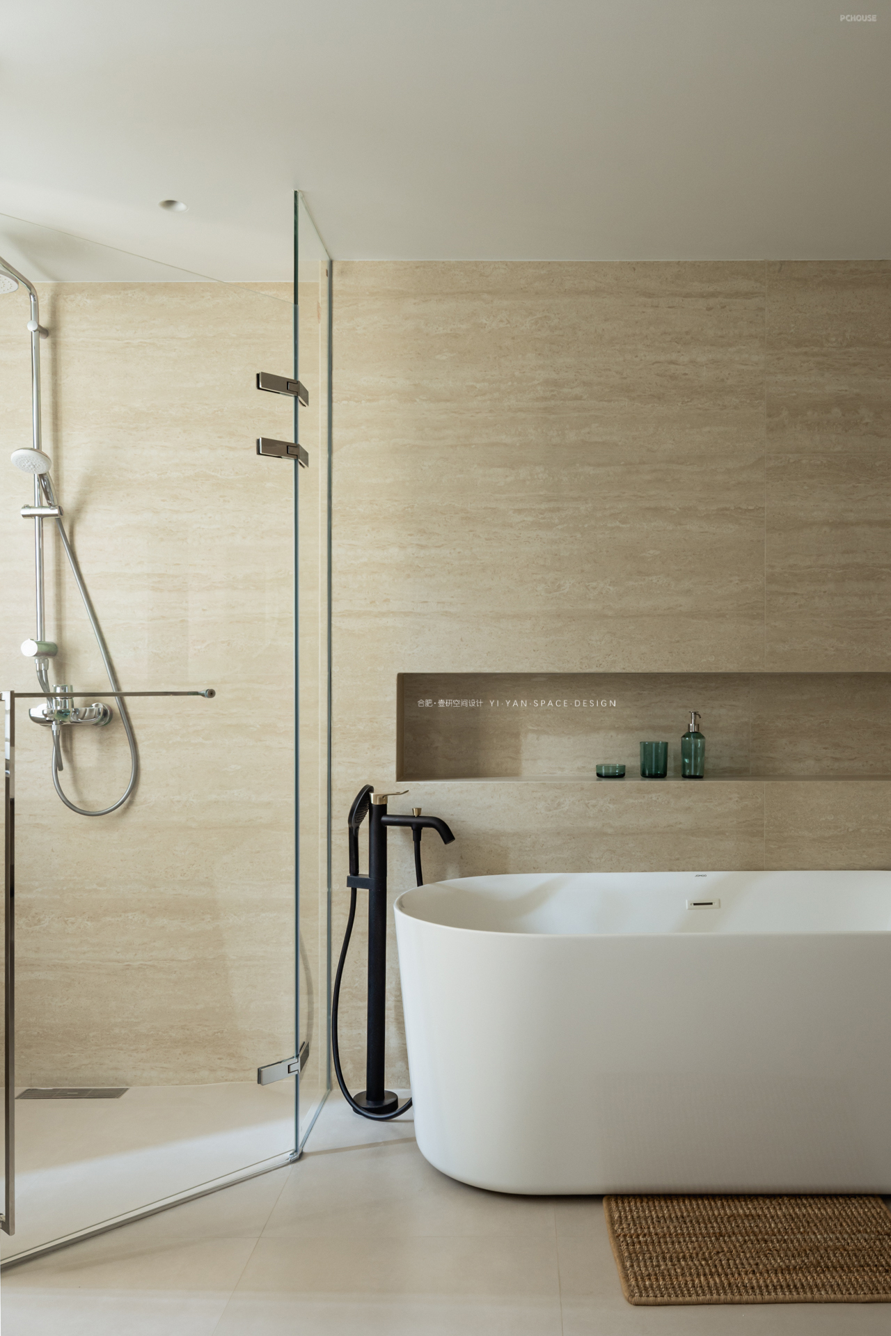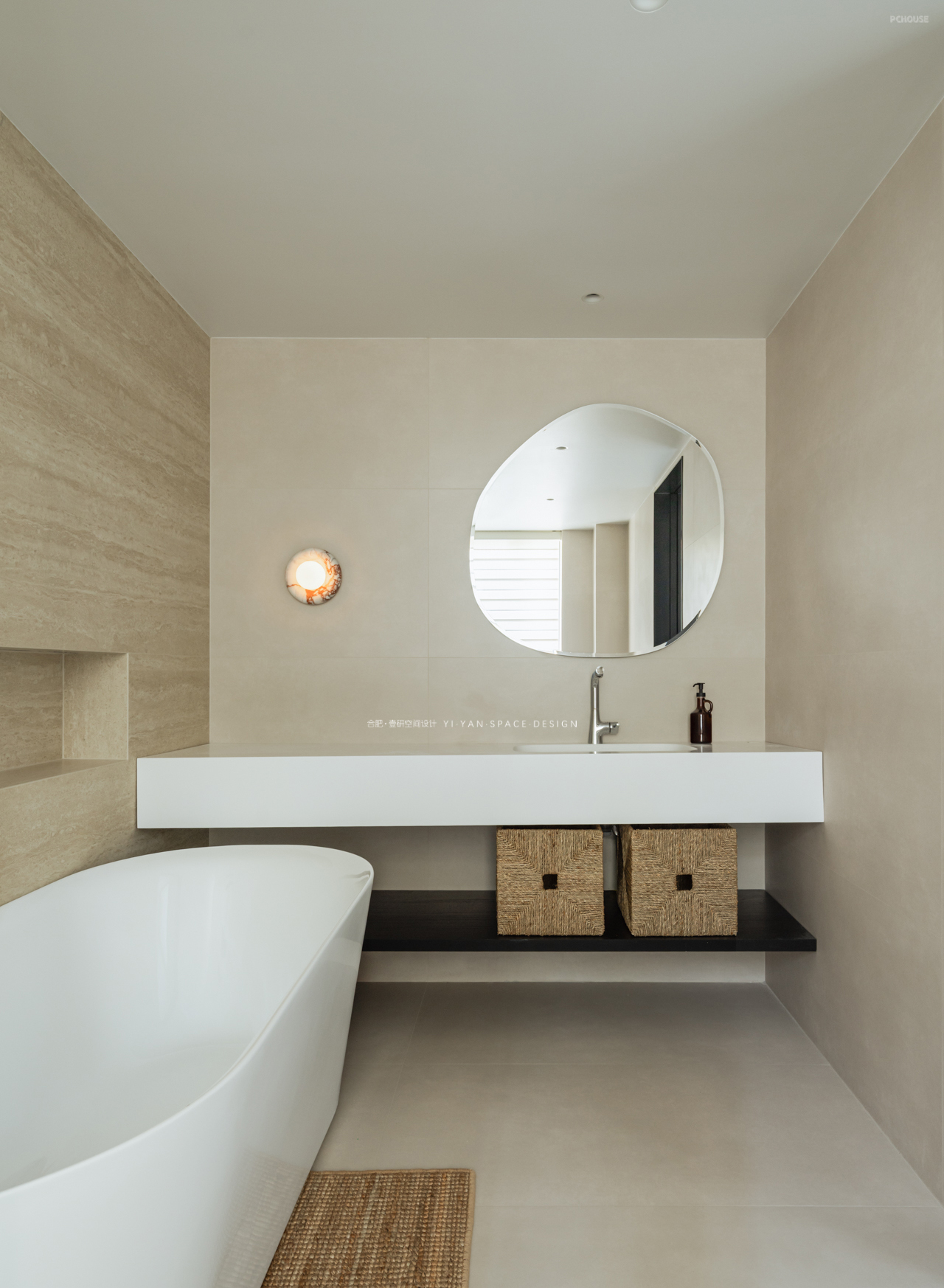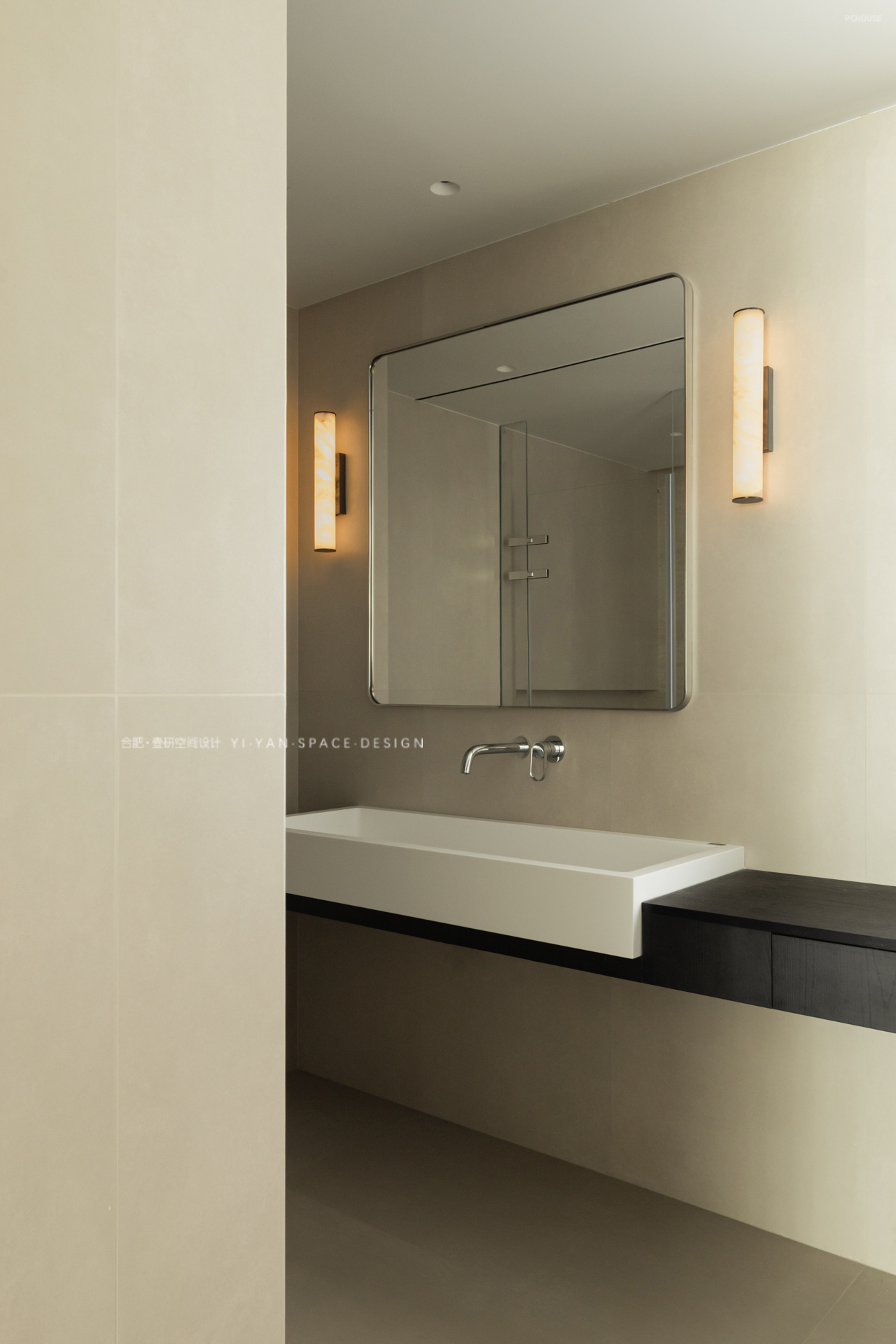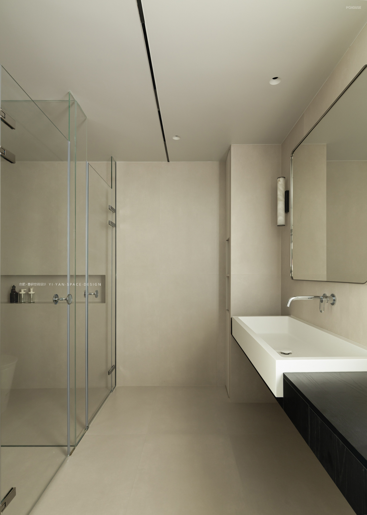 卫浴三分离+功能延伸:衣柜延伸至卫浴区,黑色口袋门藏于护墙,开启关闭皆无形;卫生间三分离,长桌兼顾洗漱梳妆,高效且私密;人性化细节:开放式衣架收纳隔夜衣,口袋门后嵌穿衣镜,更衣梳洗一气呵成——设计终需回归生活本真。