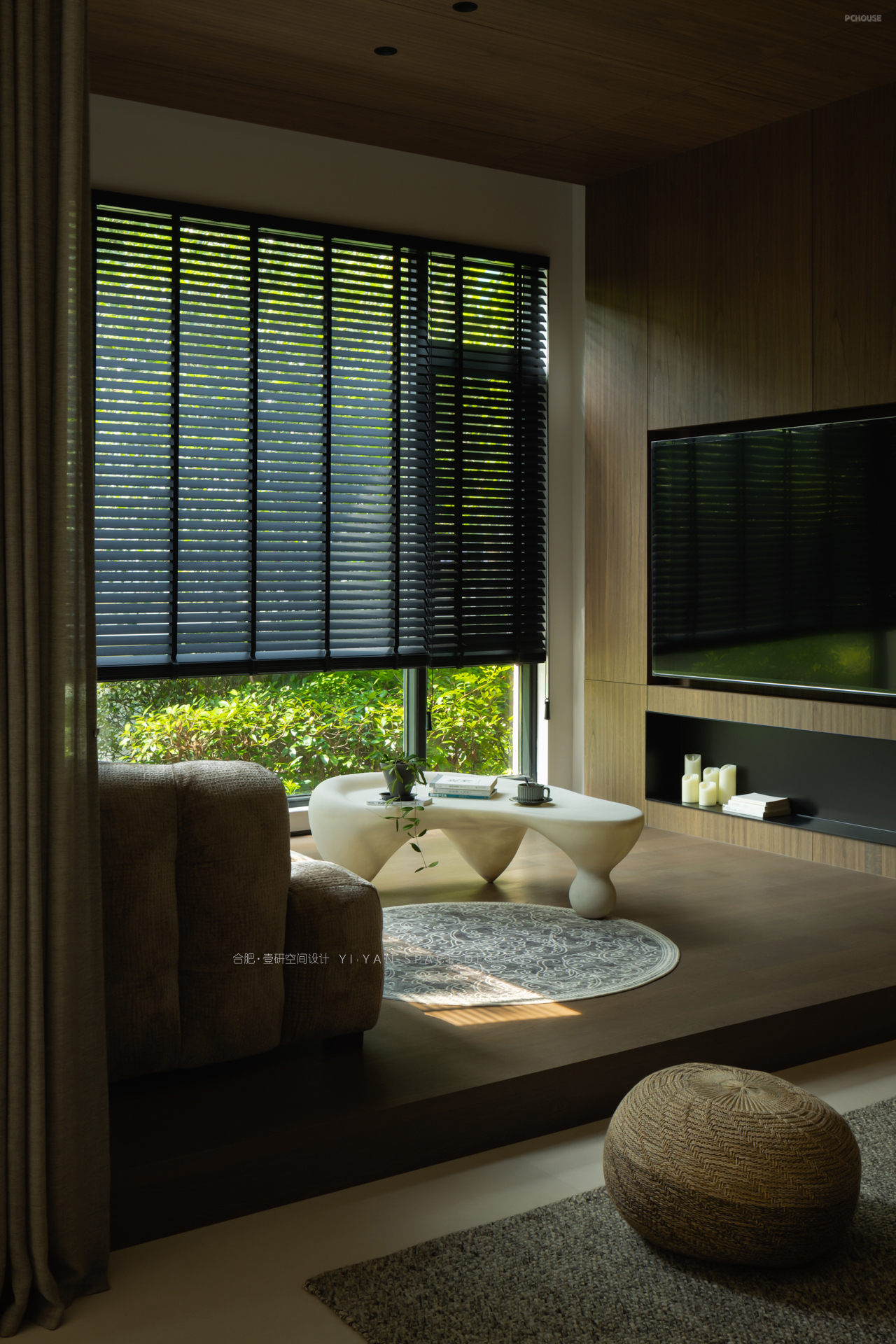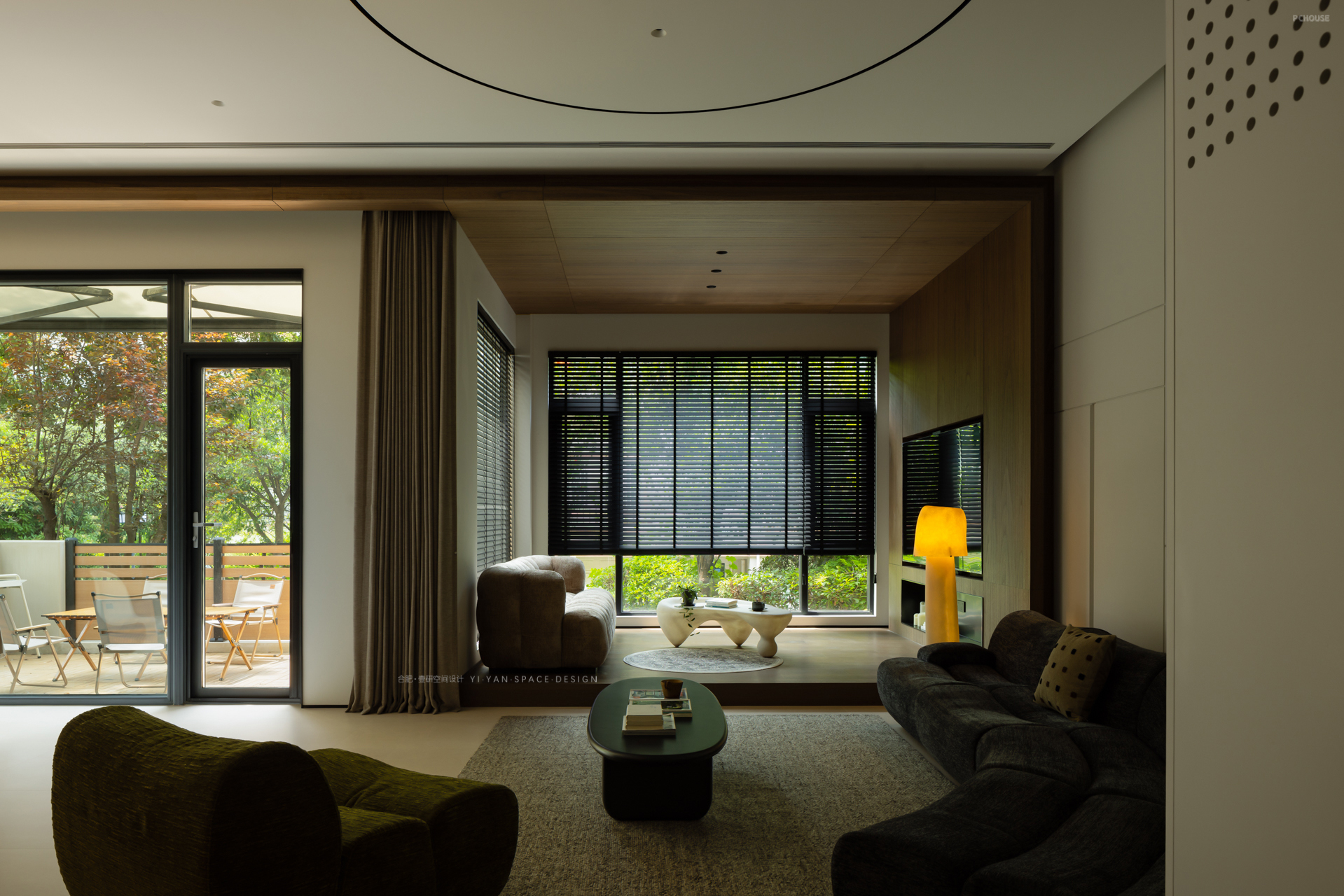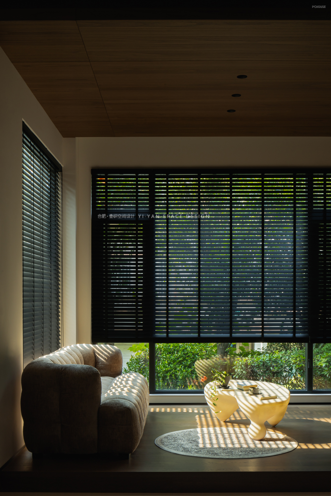 家,是人与光的容器,亦是自然与生活的联结。一楼朝南区域用天然木饰面围合,结合大面落地窗+百叶帘的设计,将室外绿植引入视野,模糊室内外界限。