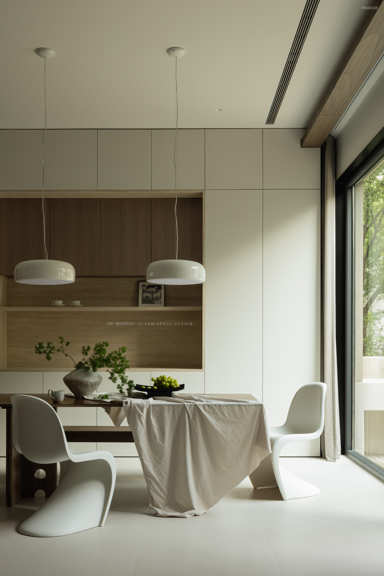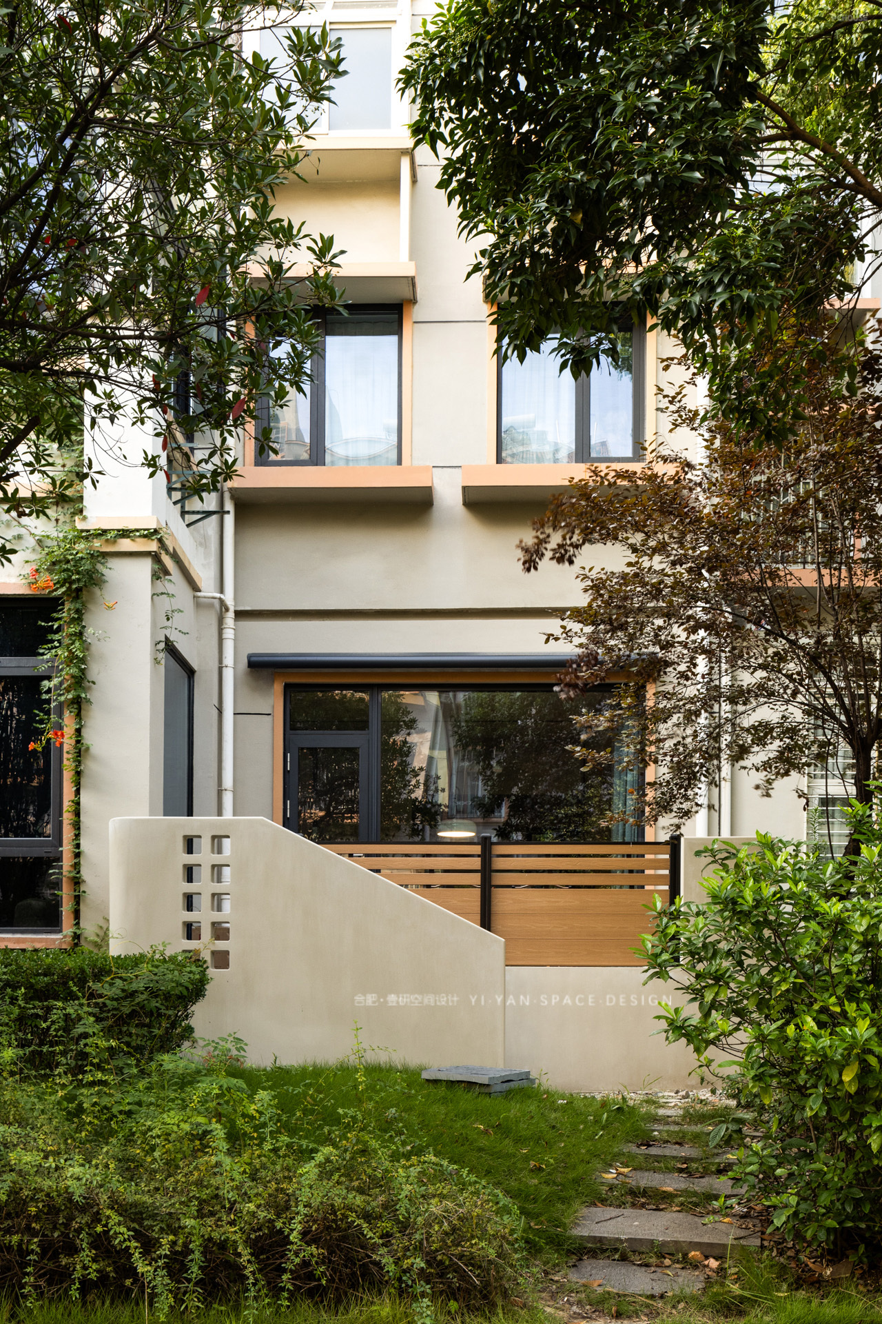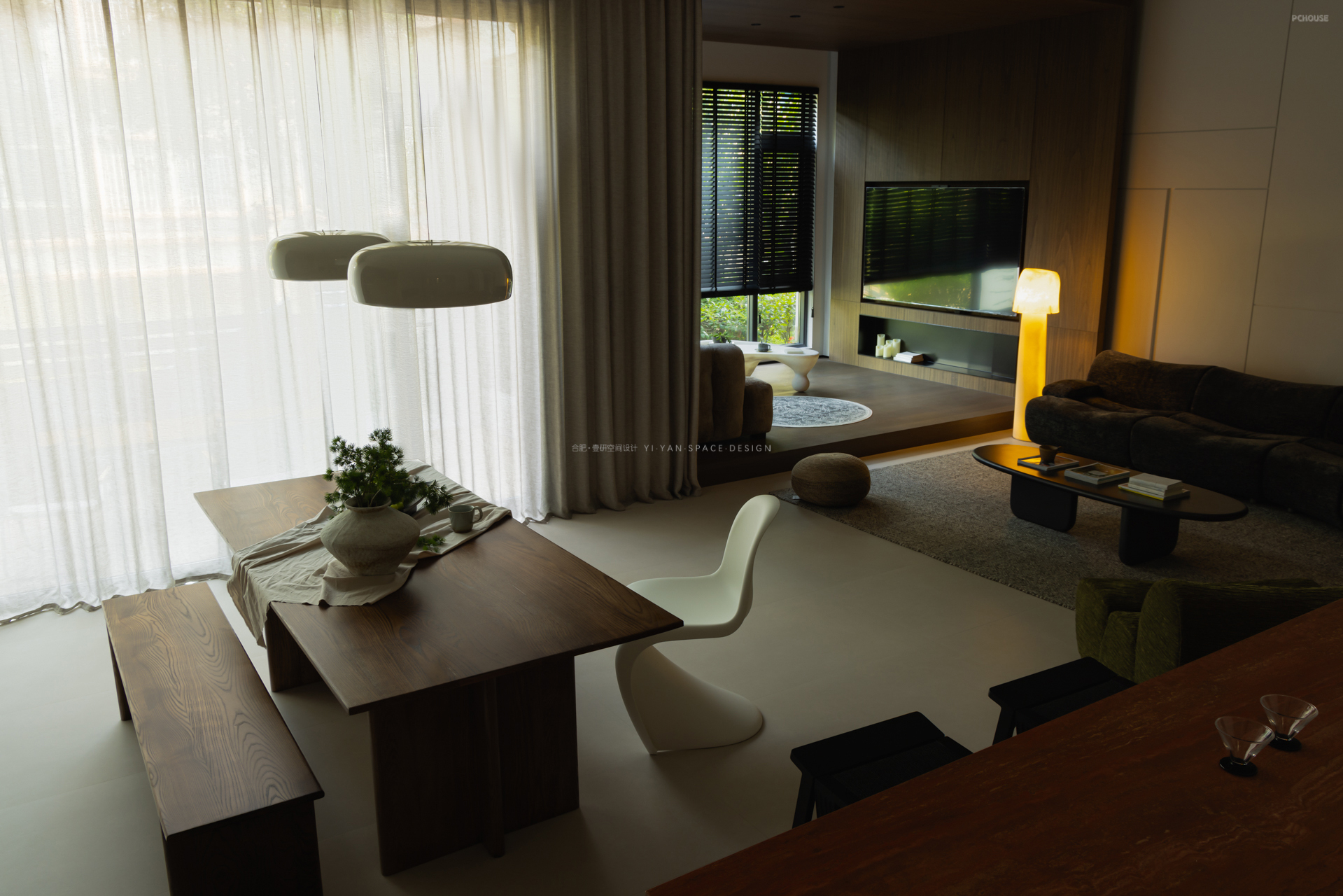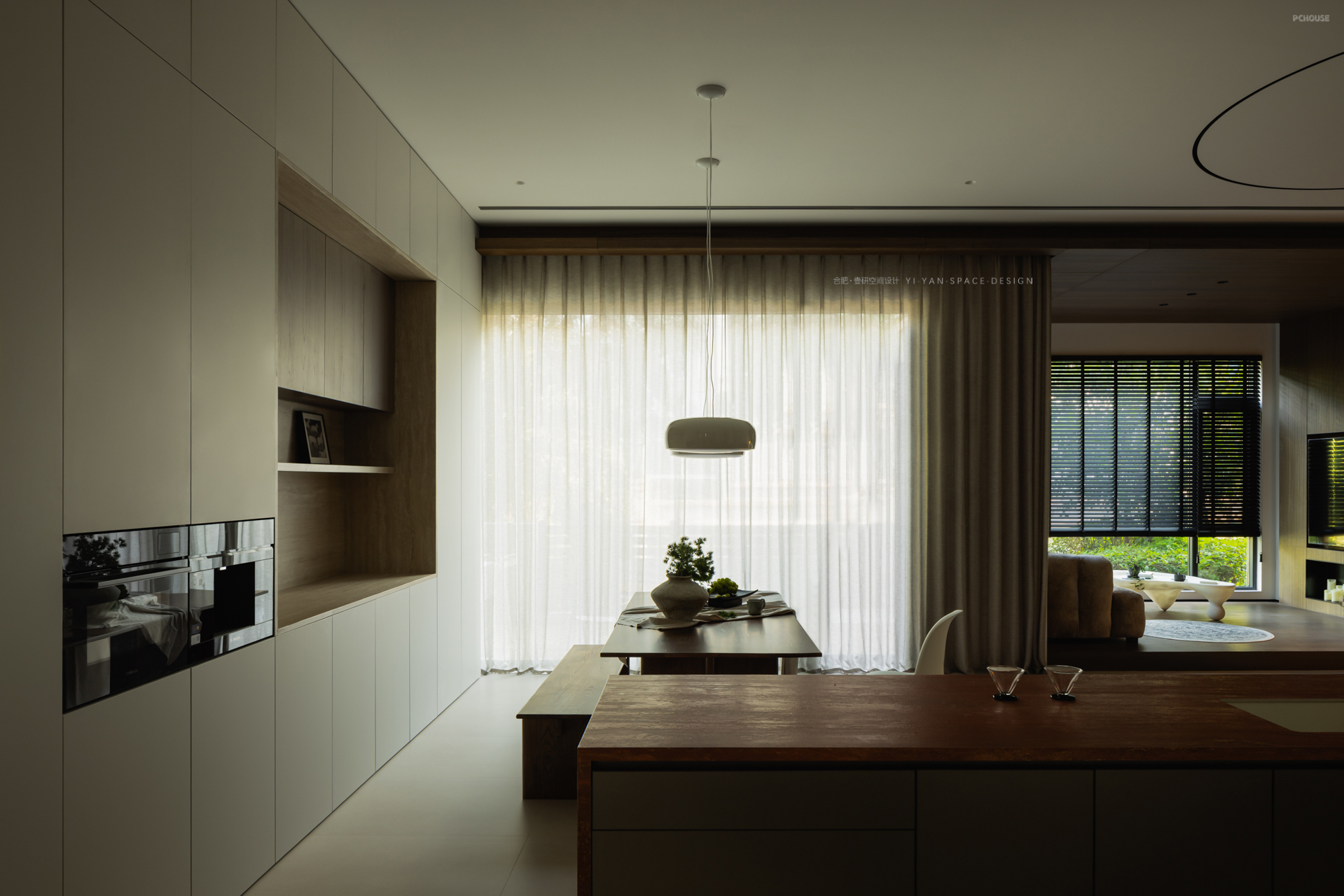 家,是人与光的容器,亦是自然与生活的联结。一楼朝南区域用天然木饰面围合,结合大面落地窗+百叶帘的设计,将室外绿植引入视野,模糊室内外界限。