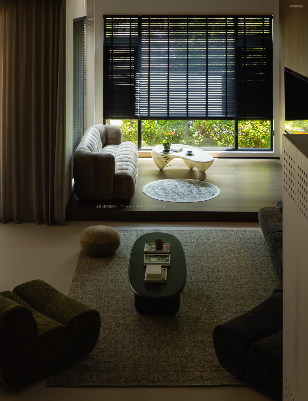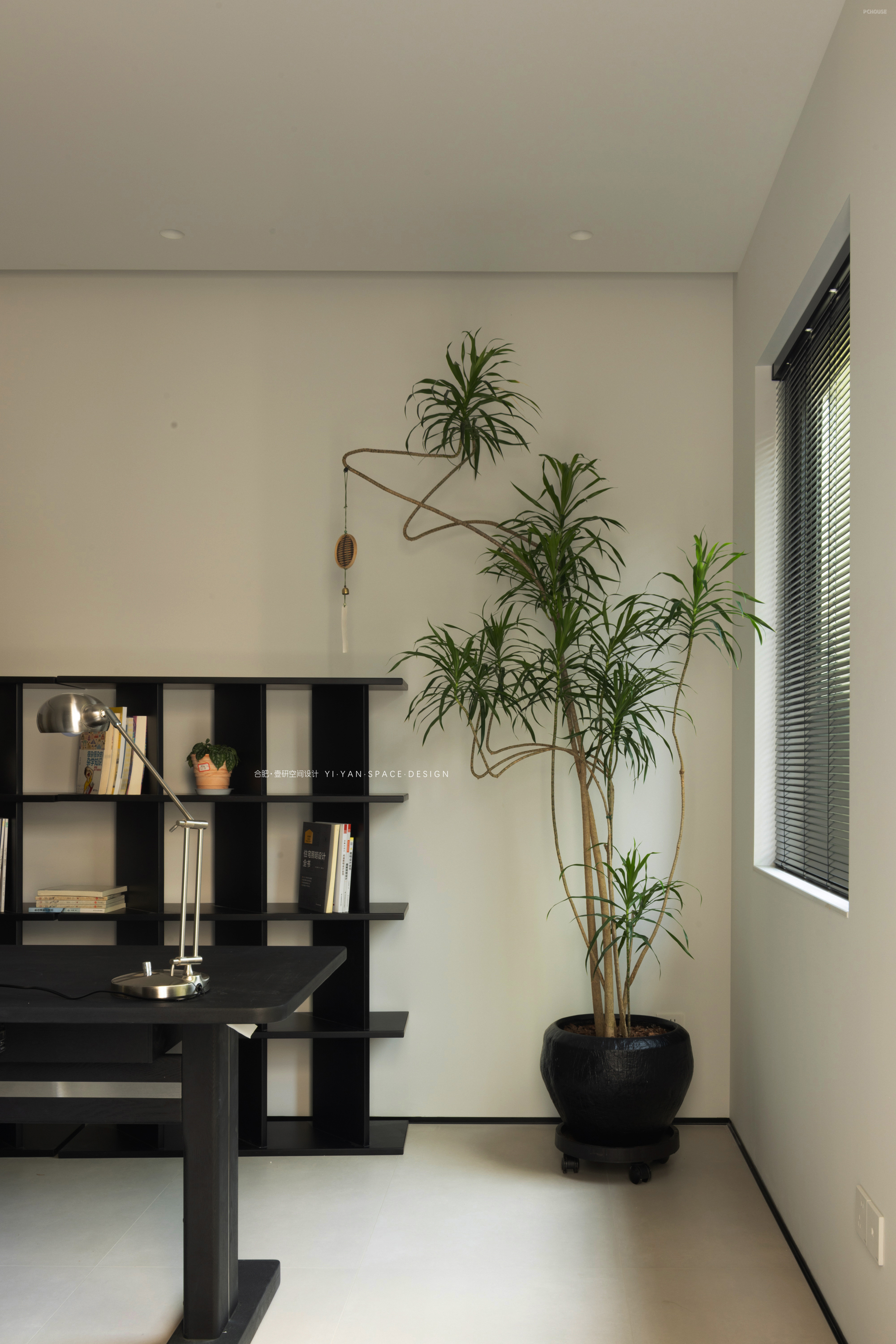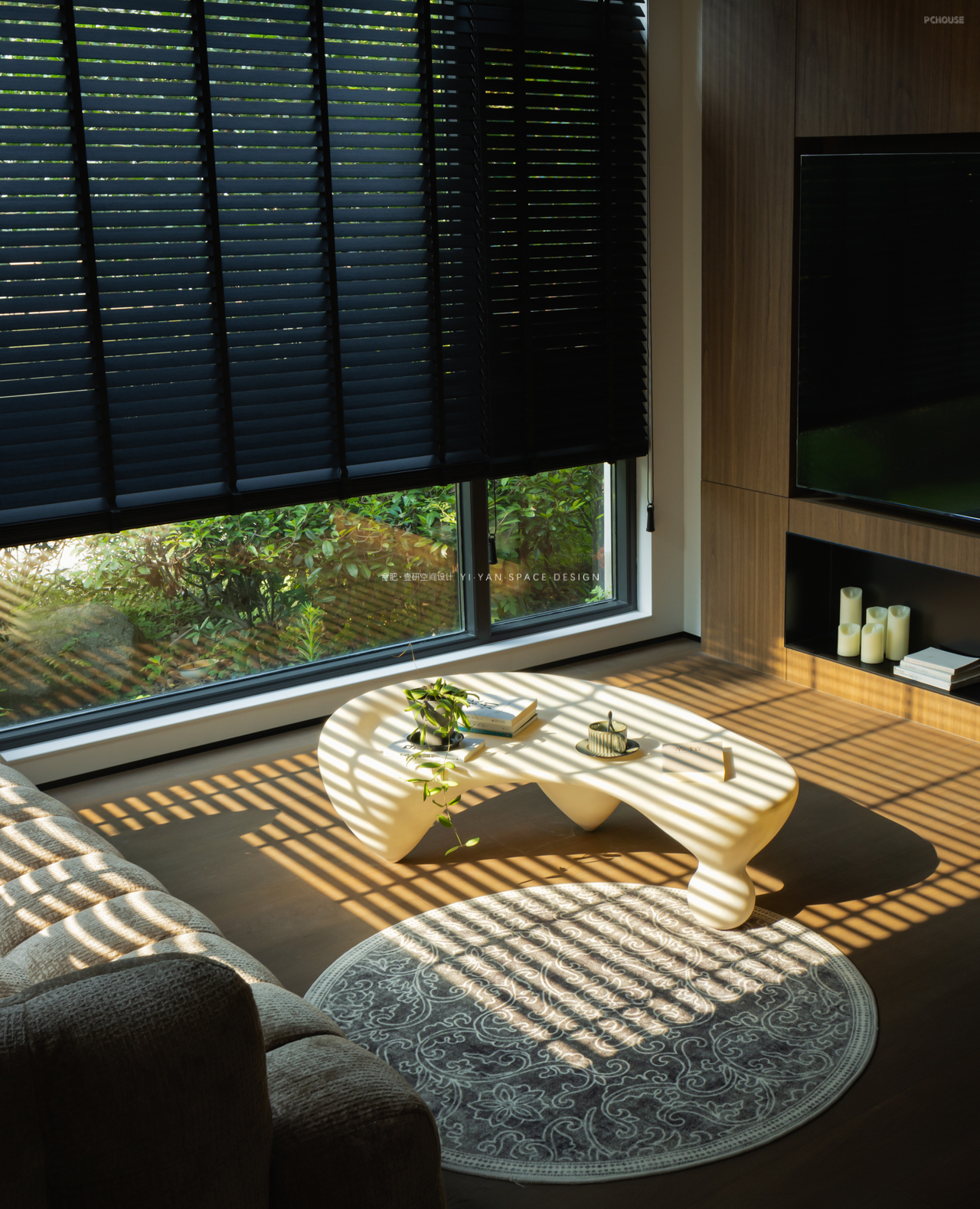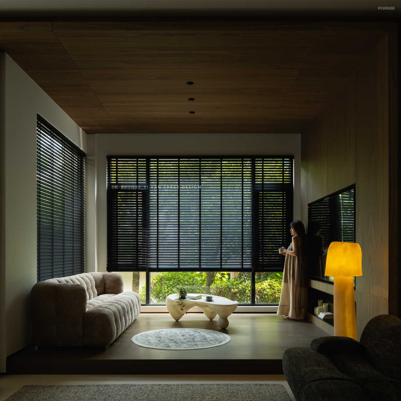 黑色百叶帘切割出的光影,白色茶几上的半杯余温,深色沙发旁的落地灯…每一处细节都在诉说:生活不必喧哗,宁静自有力量。