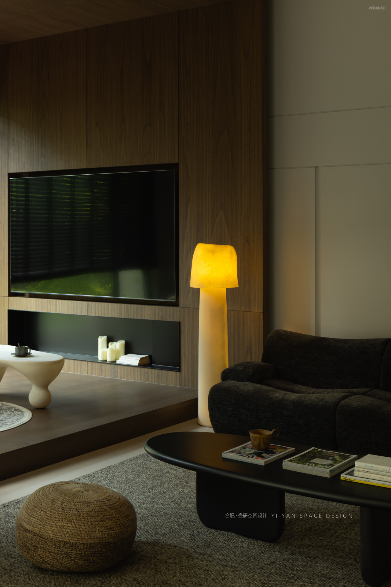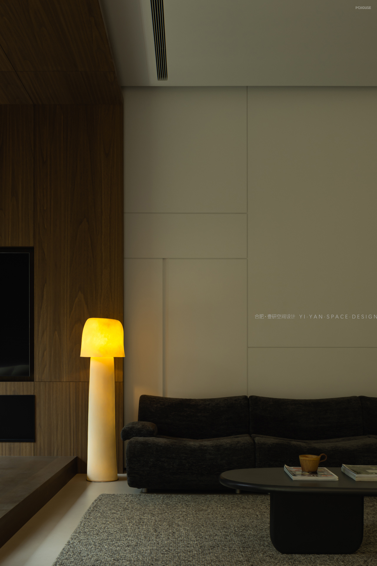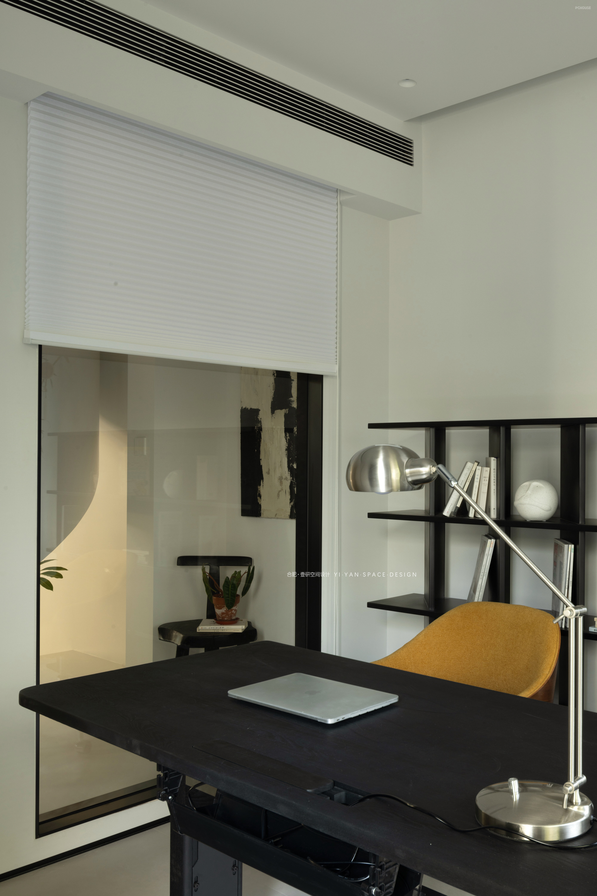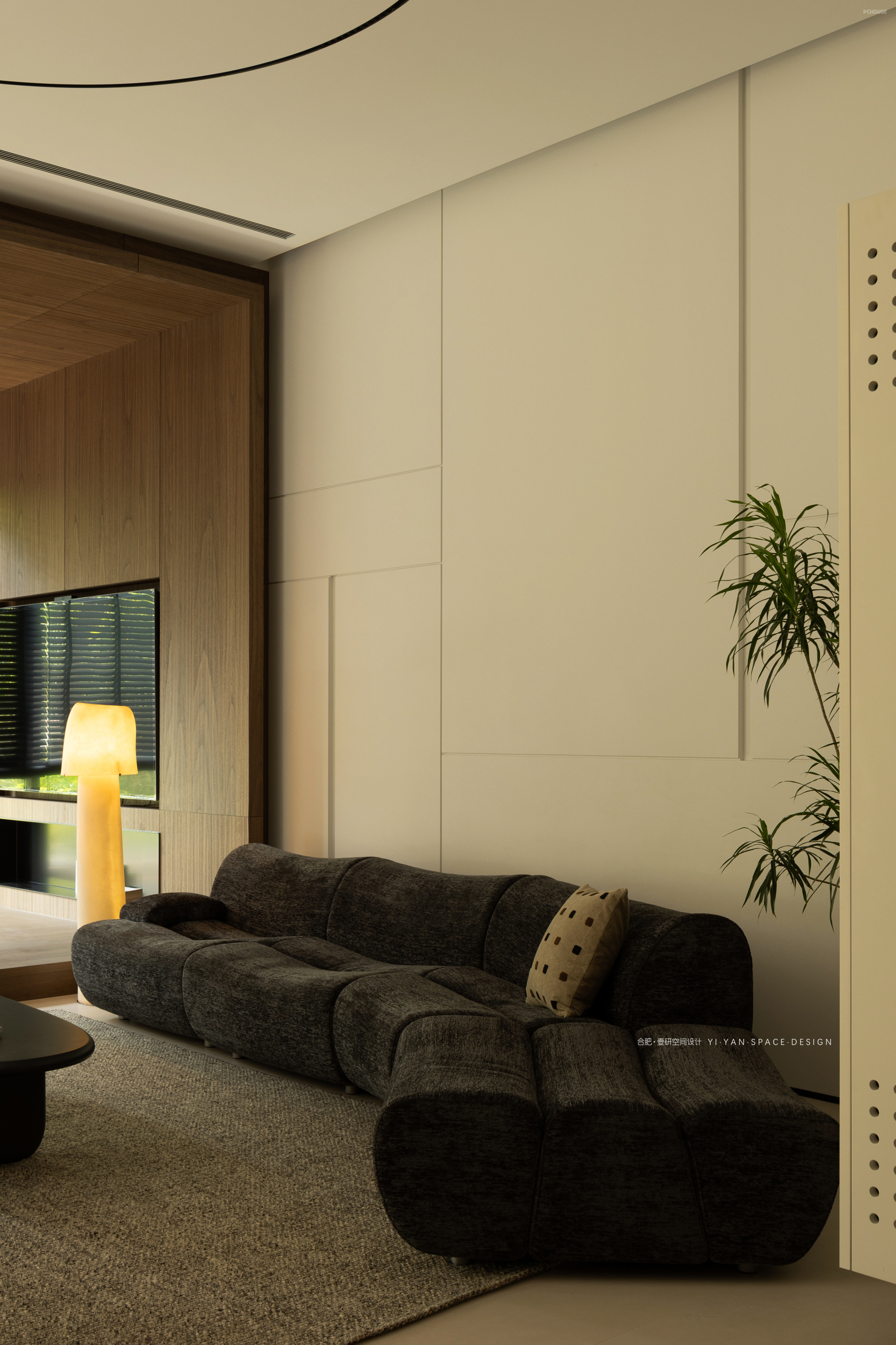 黑色百叶帘切割出的光影,白色茶几上的半杯余温,深色沙发旁的落地灯…每一处细节都在诉说:生活不必喧哗,宁静自有力量。