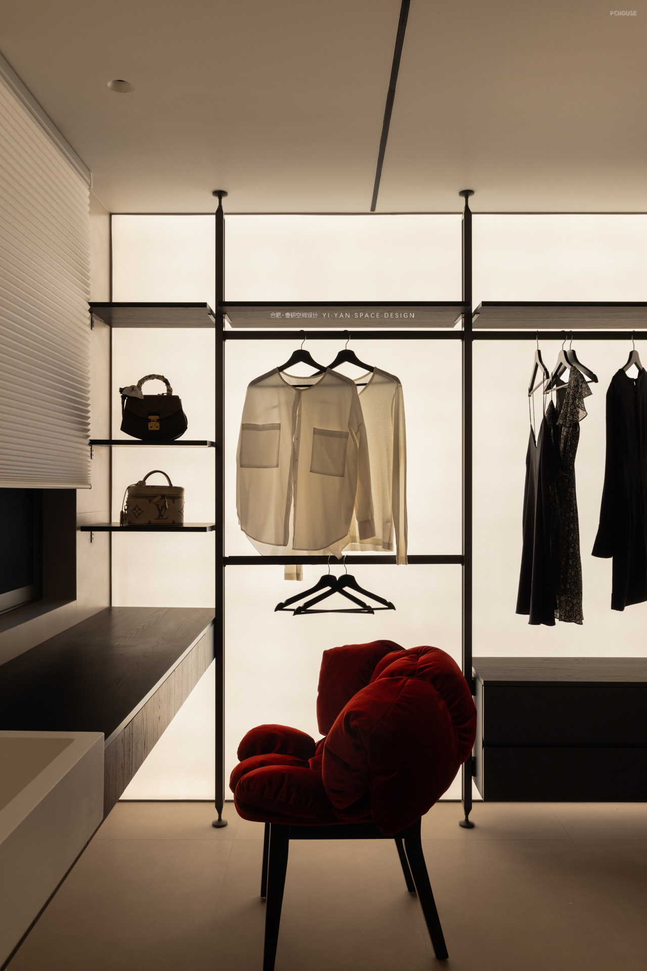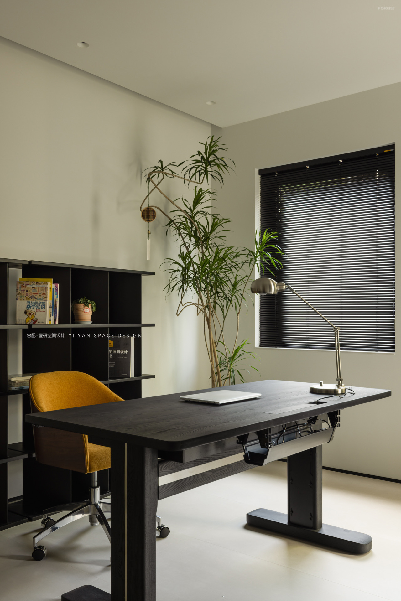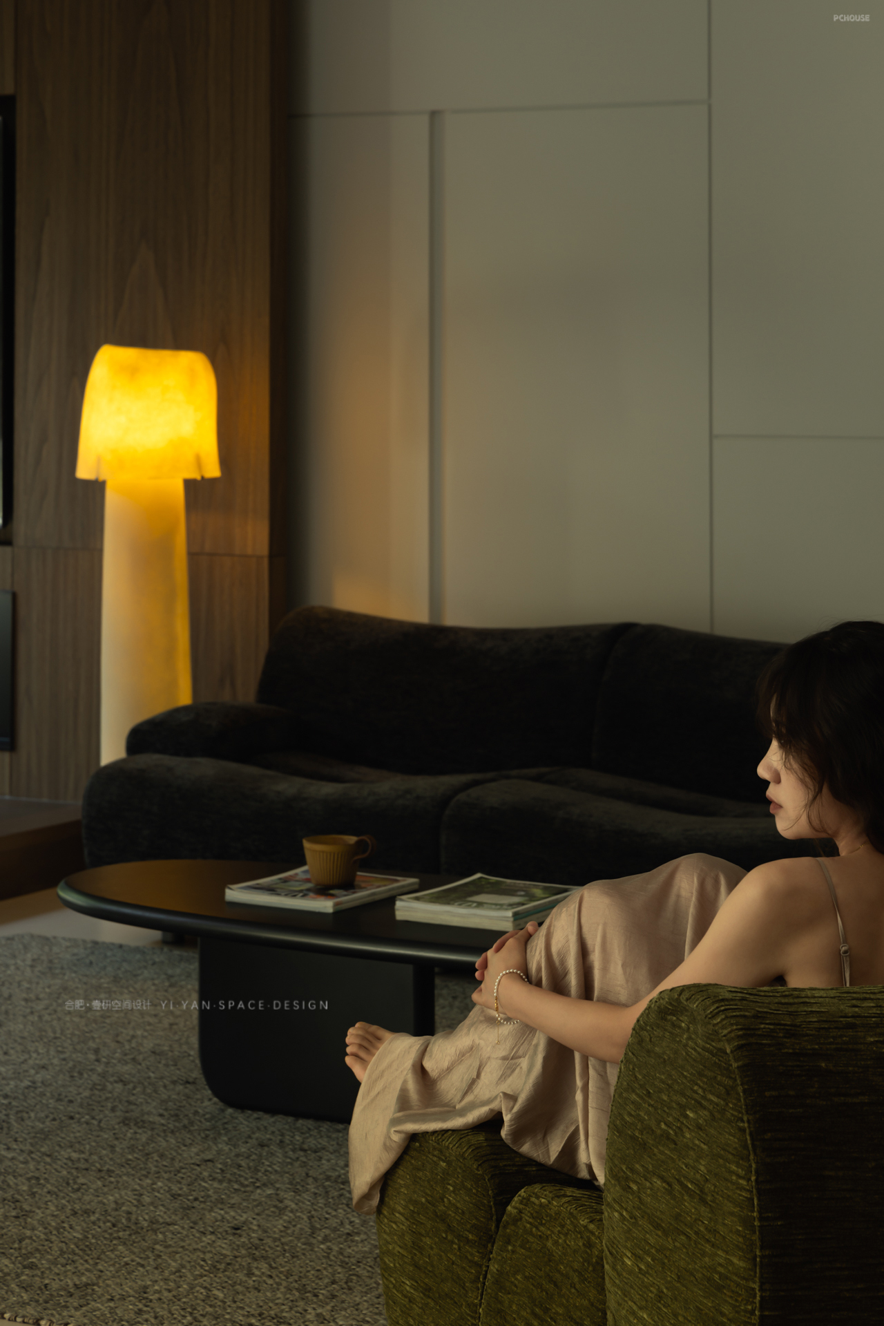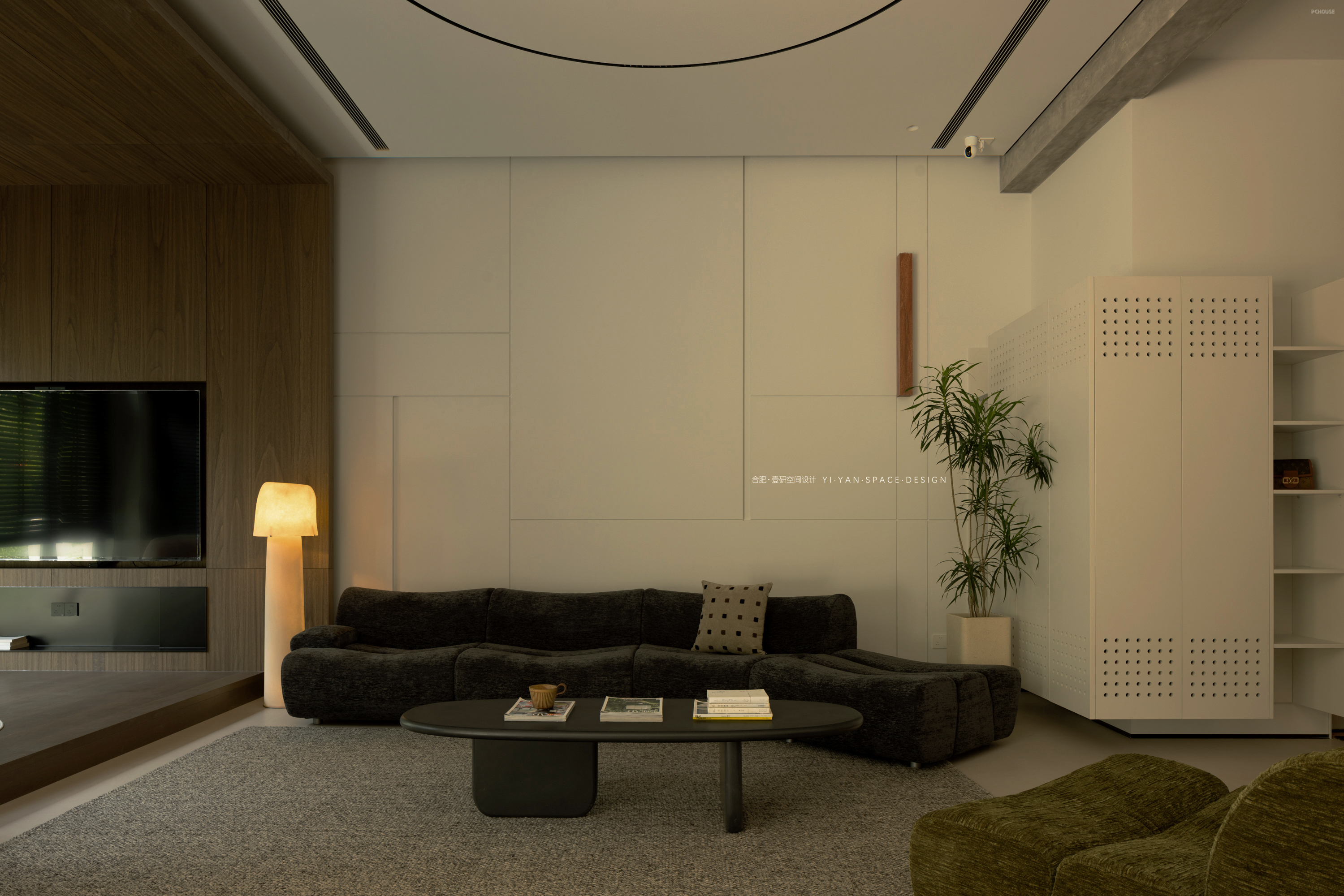 黑色百叶帘切割出的光影,白色茶几上的半杯余温,深色沙发旁的落地灯…每一处细节都在诉说:生活不必喧哗,宁静自有力量。