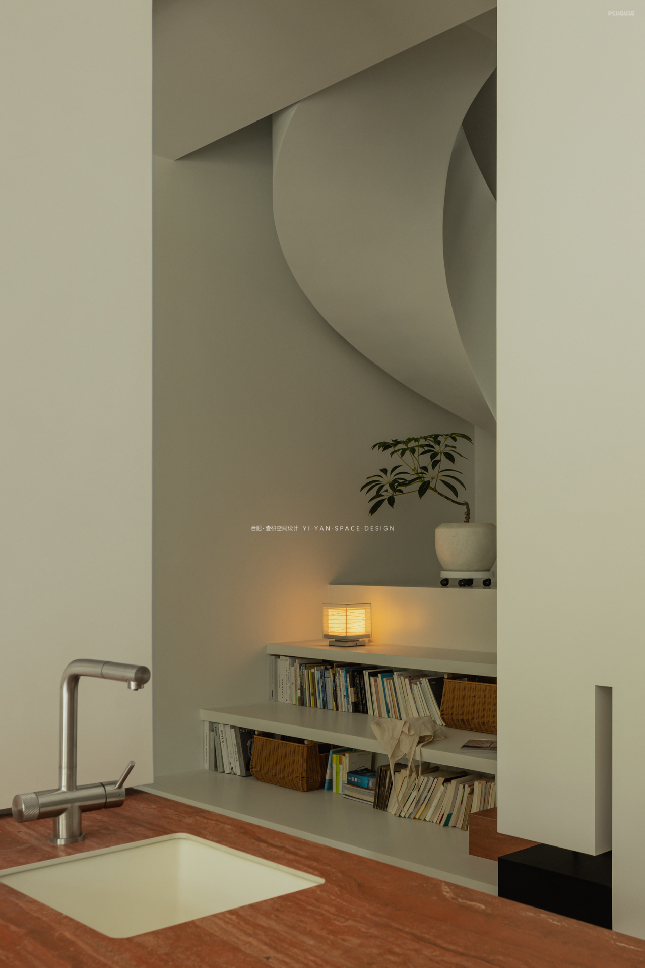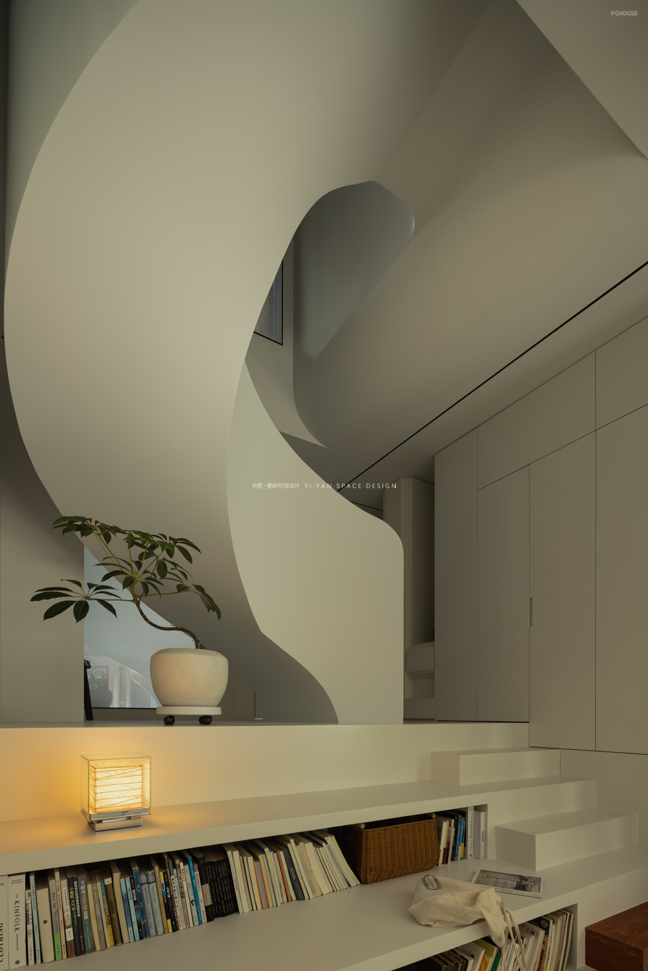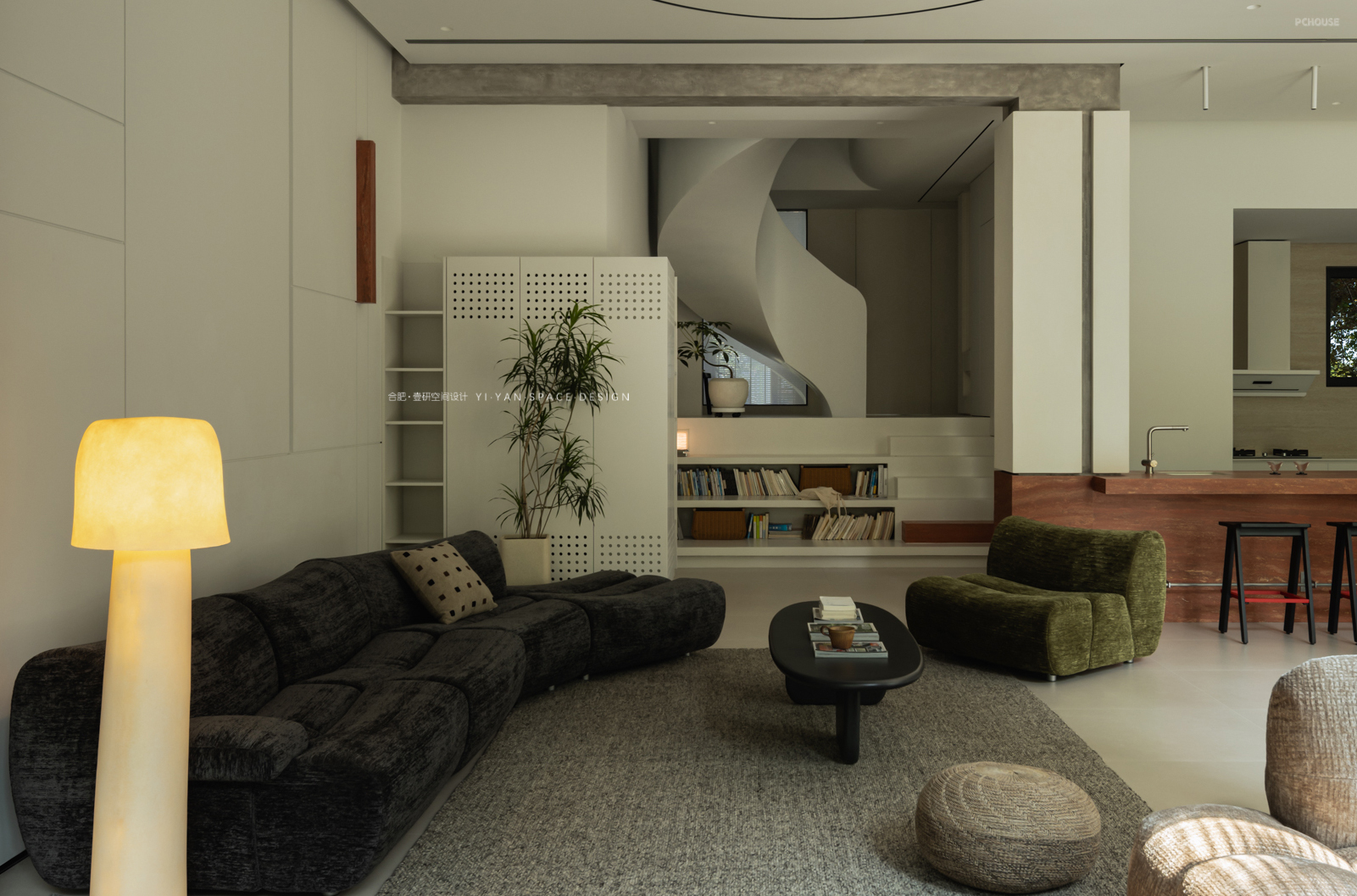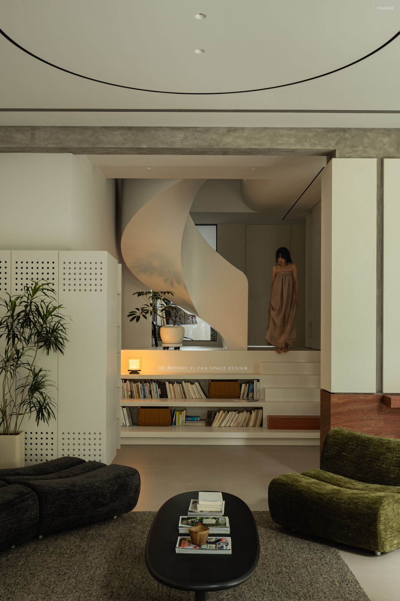 踏步延伸至休闲区,兼具坐榻与展示功能;楼梯下方则是嵌入镂空书架,既解决储物需求(书籍、绿植、日常物品),又通过镂空结构保持视线穿透,避免压抑感,另外错层踏步作为坐榻,结合书架亦可形成小型阅读角;而书架与旋转楼梯的造型呼应,形成「与功能共生」的艺术装置。
