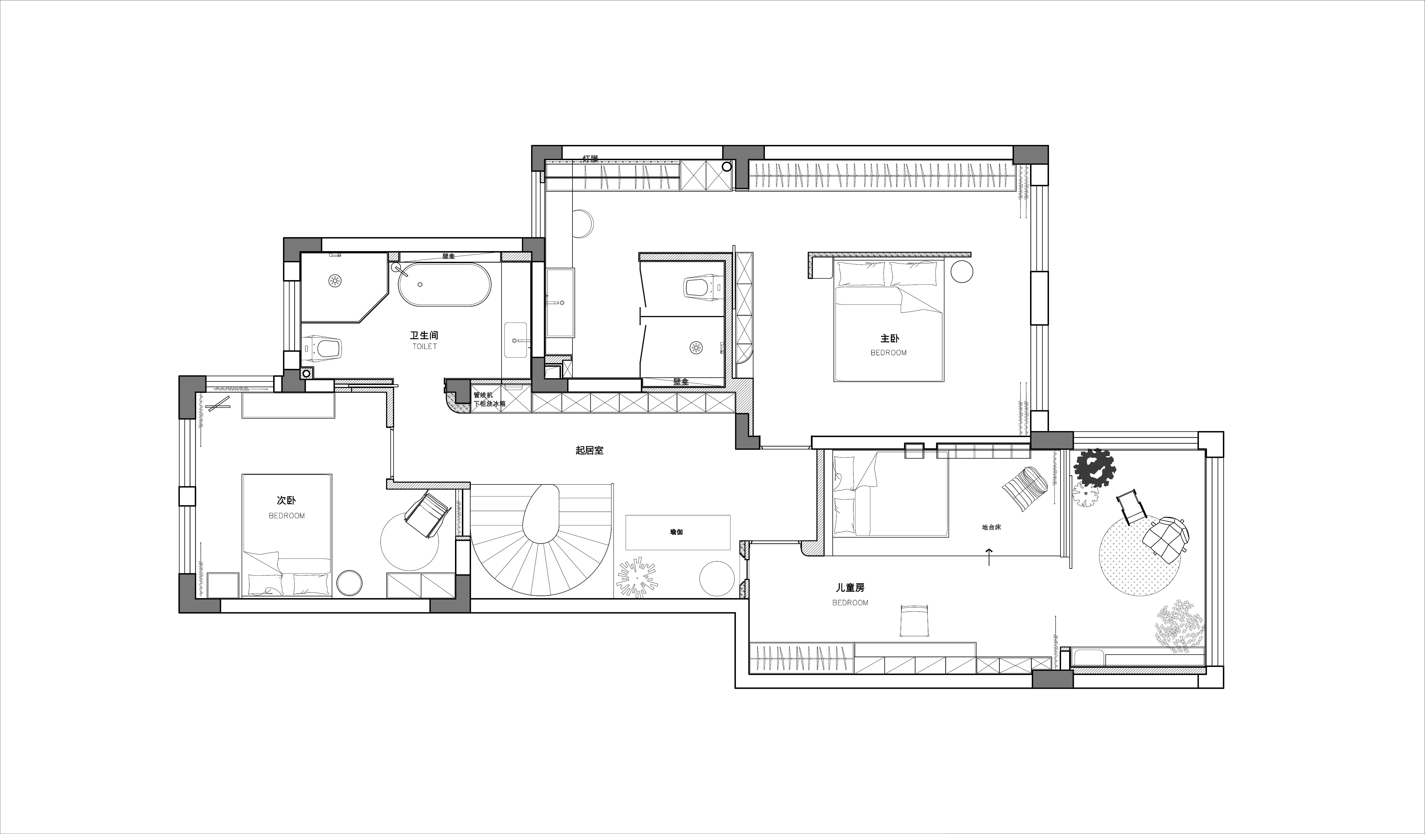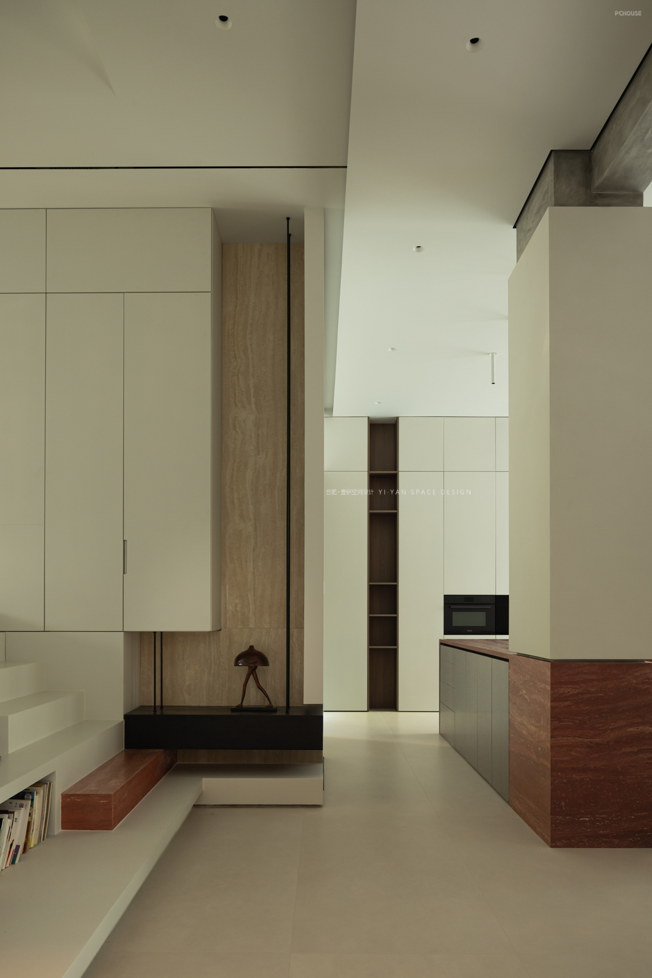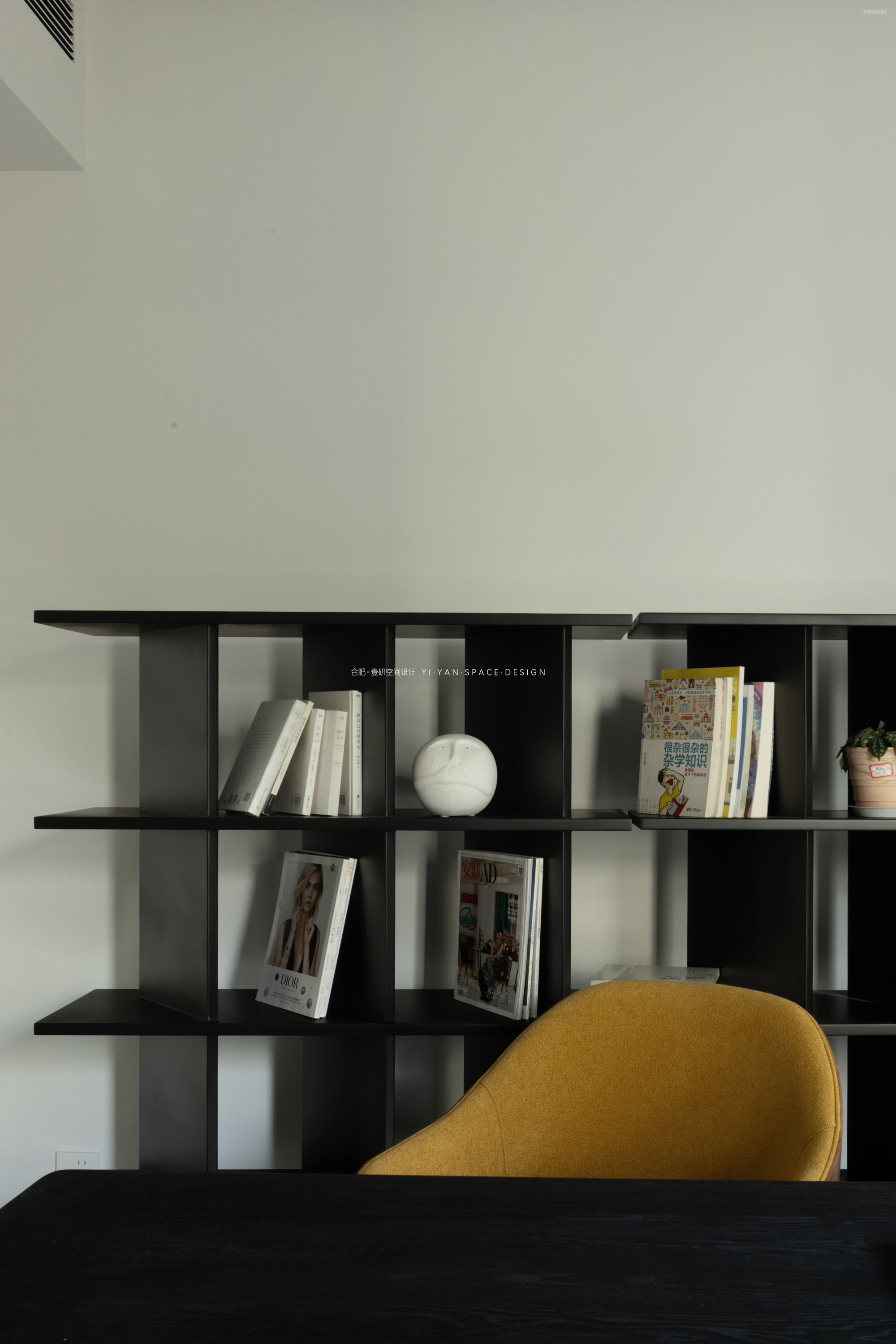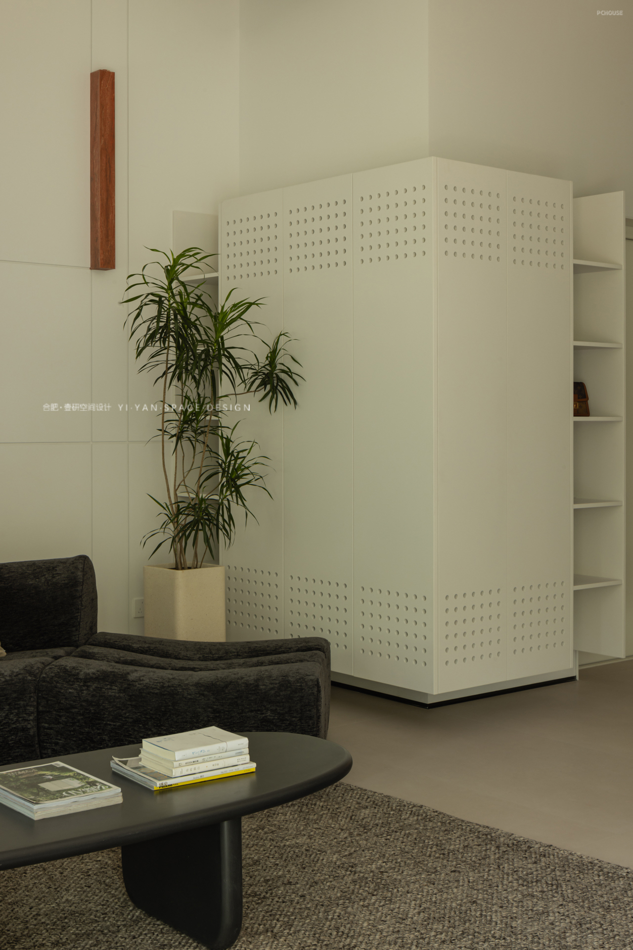 踏步延伸至休闲区,兼具坐榻与展示功能;楼梯下方则是嵌入镂空书架,既解决储物需求(书籍、绿植、日常物品),又通过镂空结构保持视线穿透,避免压抑感,另外错层踏步作为坐榻,结合书架亦可形成小型阅读角;而书架与旋转楼梯的造型呼应,形成「与功能共生」的艺术装置。
