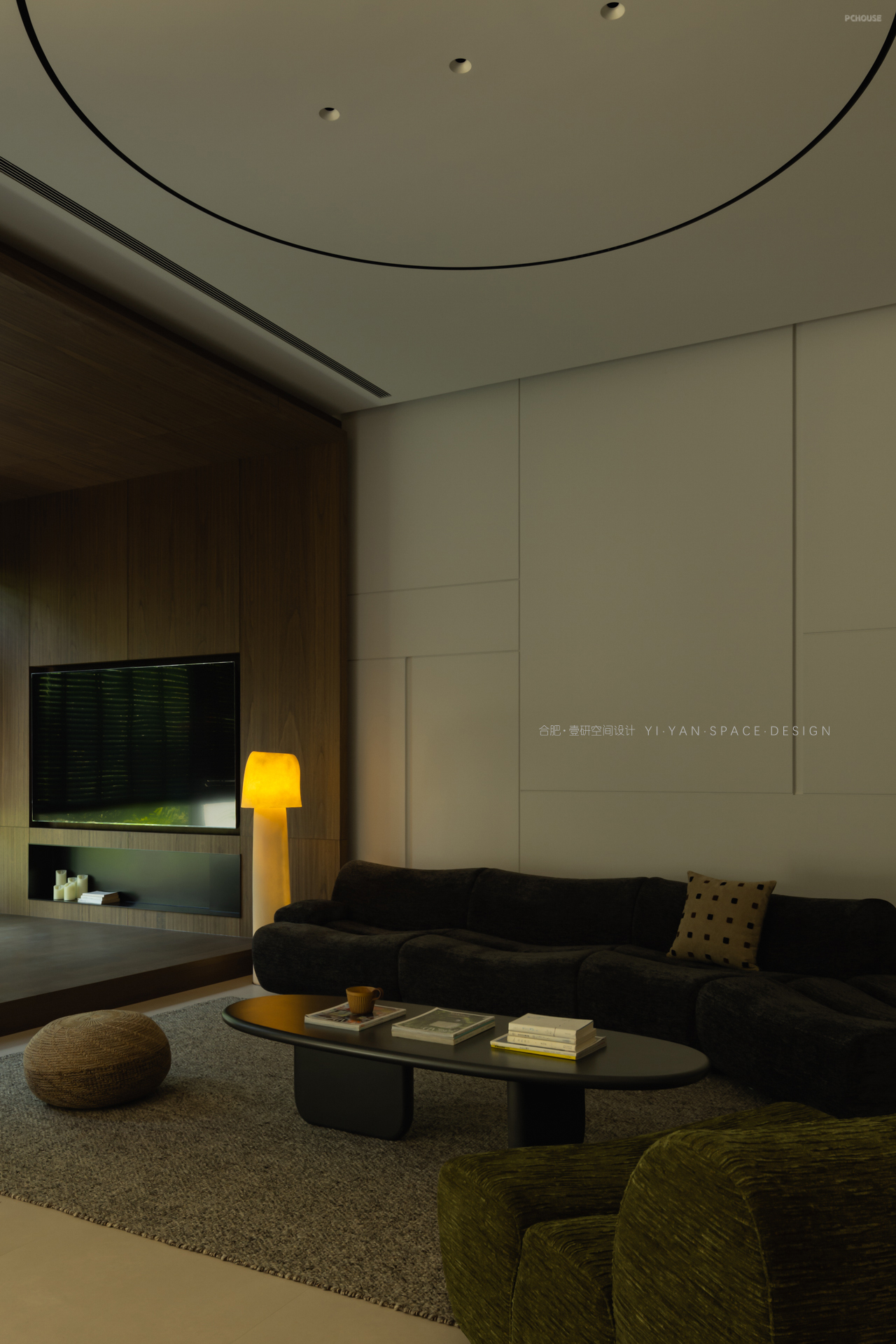客厅以微弧形组合沙发为原点,向外延伸出与地台休闲区、露台景观角、餐厅与吧台的互动脉络。