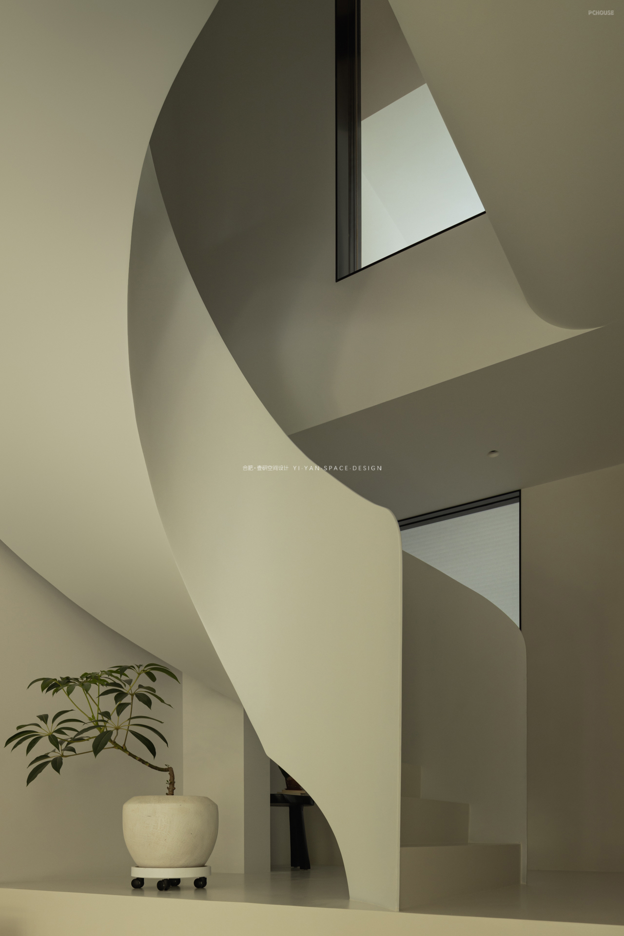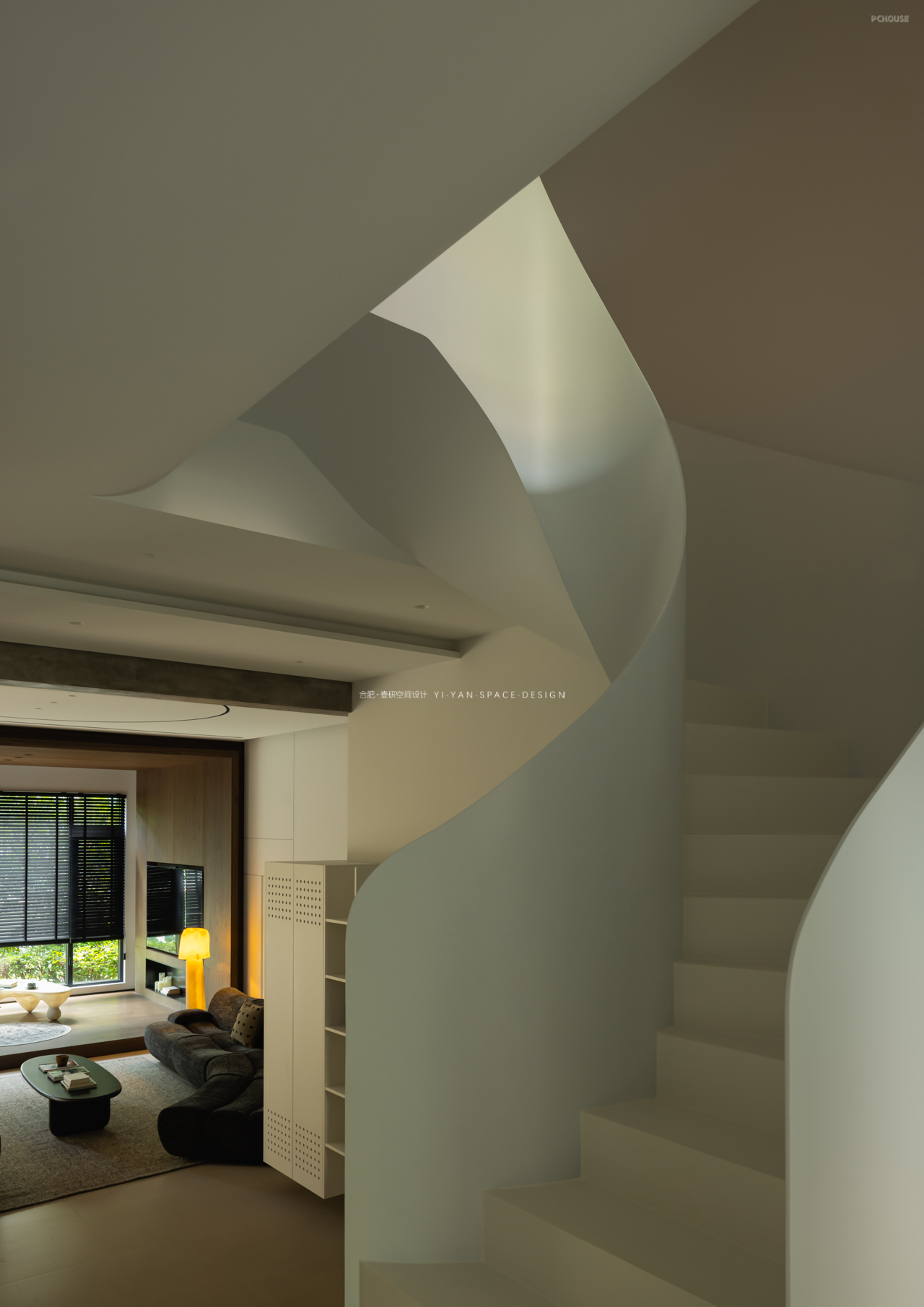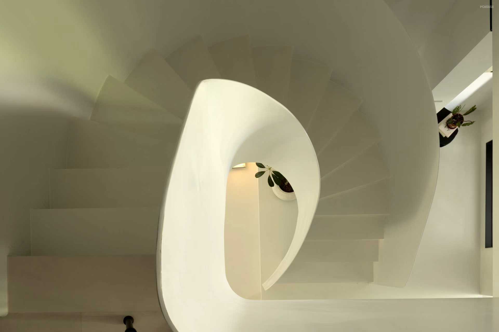 拆除笨重楼梯,以白色旋转楼梯替代,通过曲线形态打破呆板格局,成为空间中的艺术焦点。