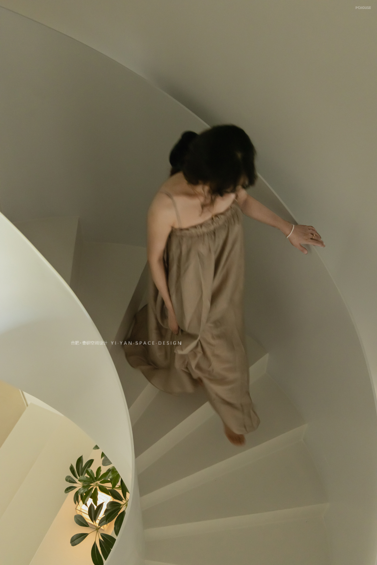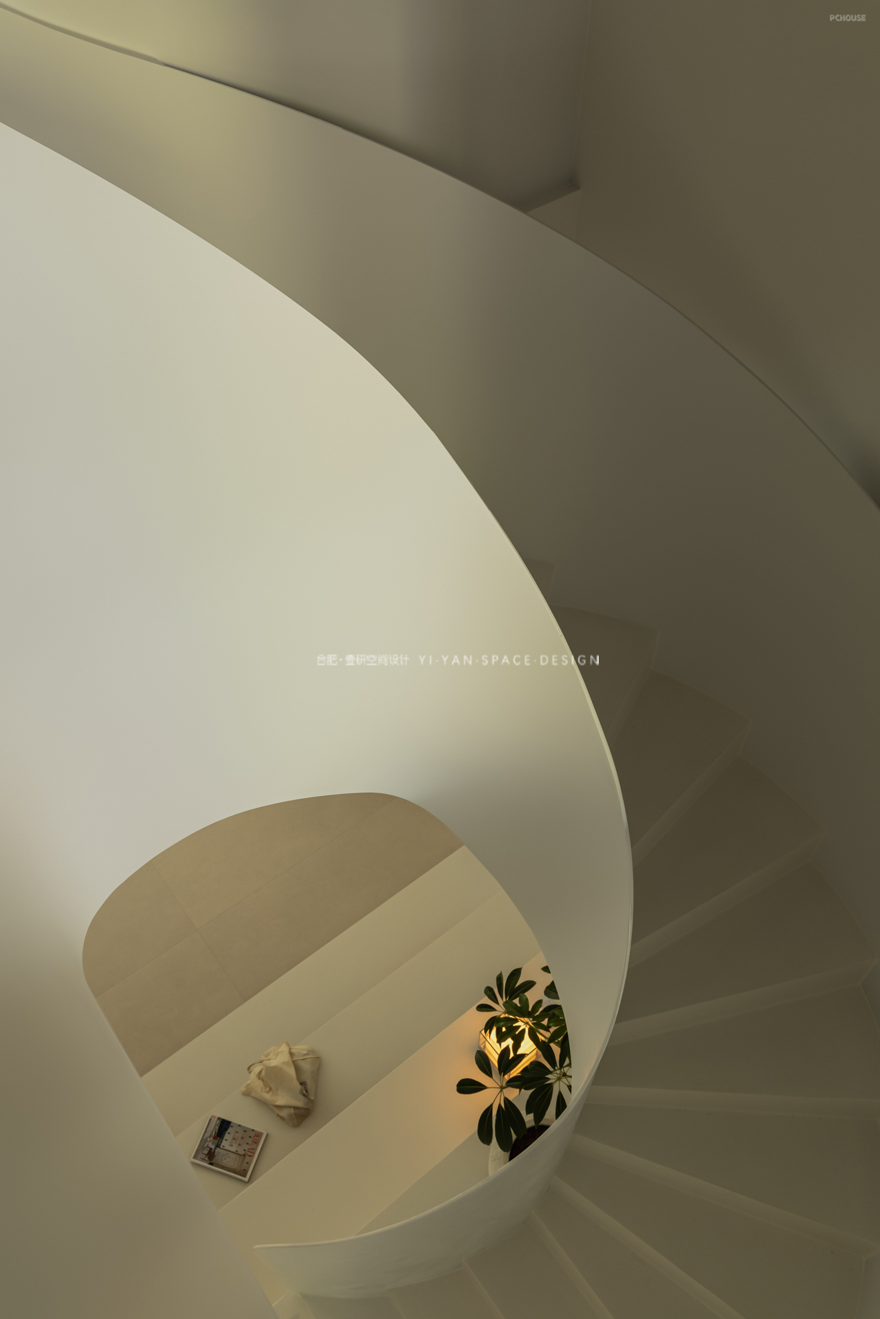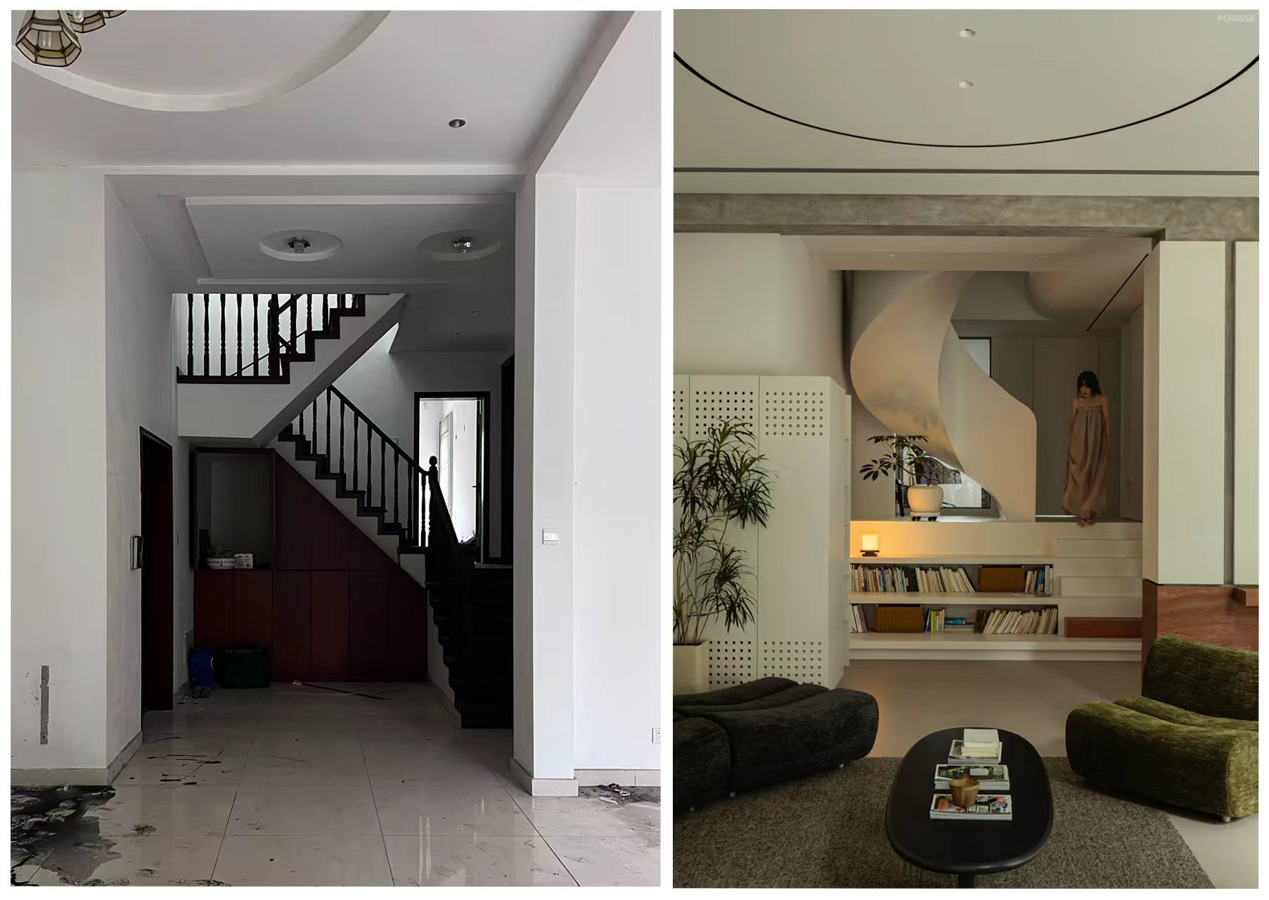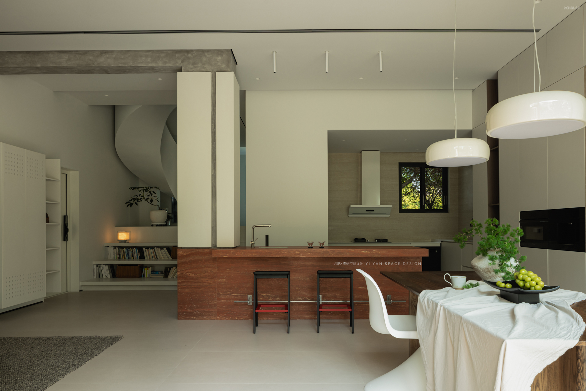 拆除笨重楼梯,以白色旋转楼梯替代,通过曲线形态打破呆板格局,成为空间中的艺术焦点。