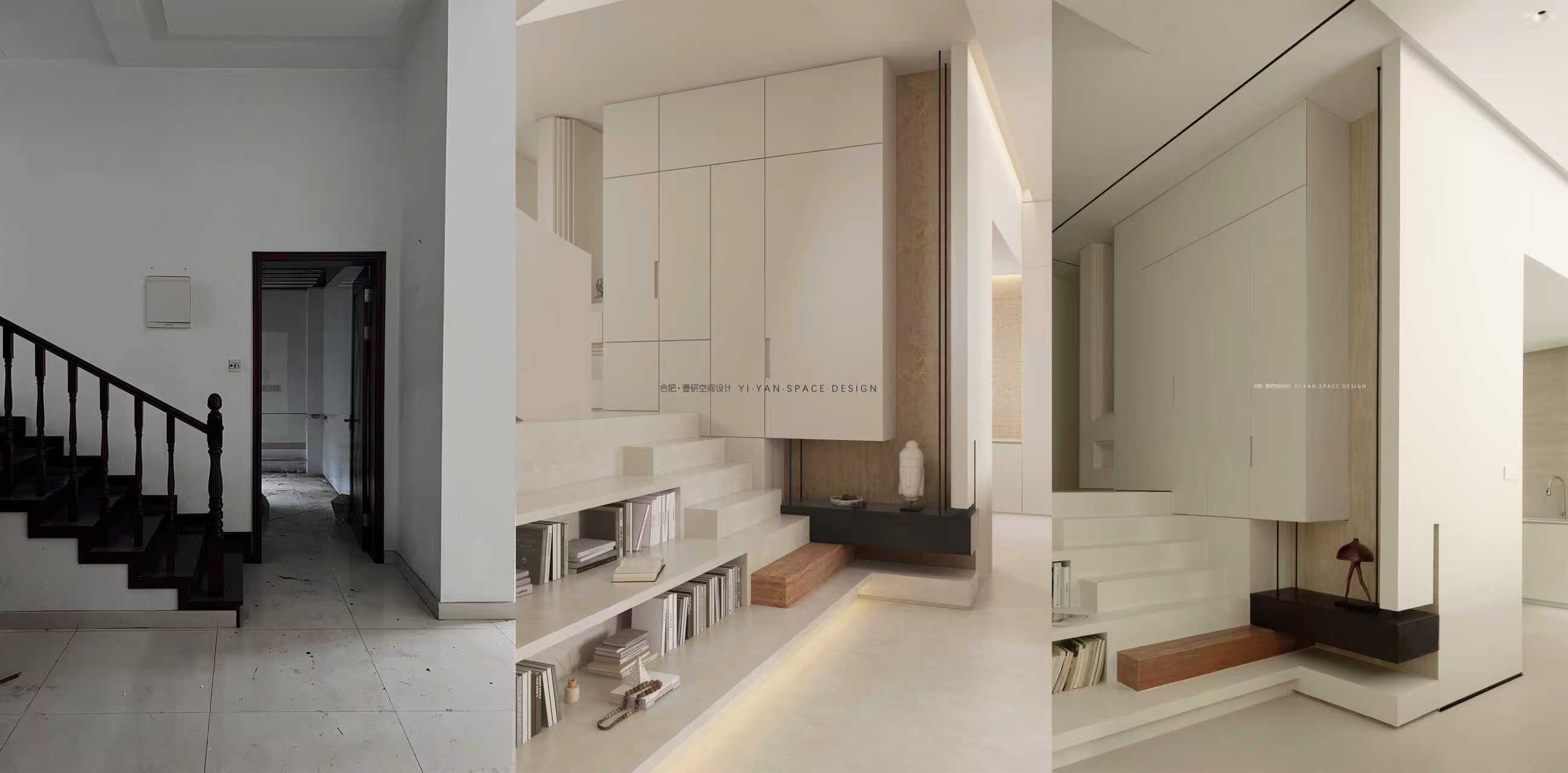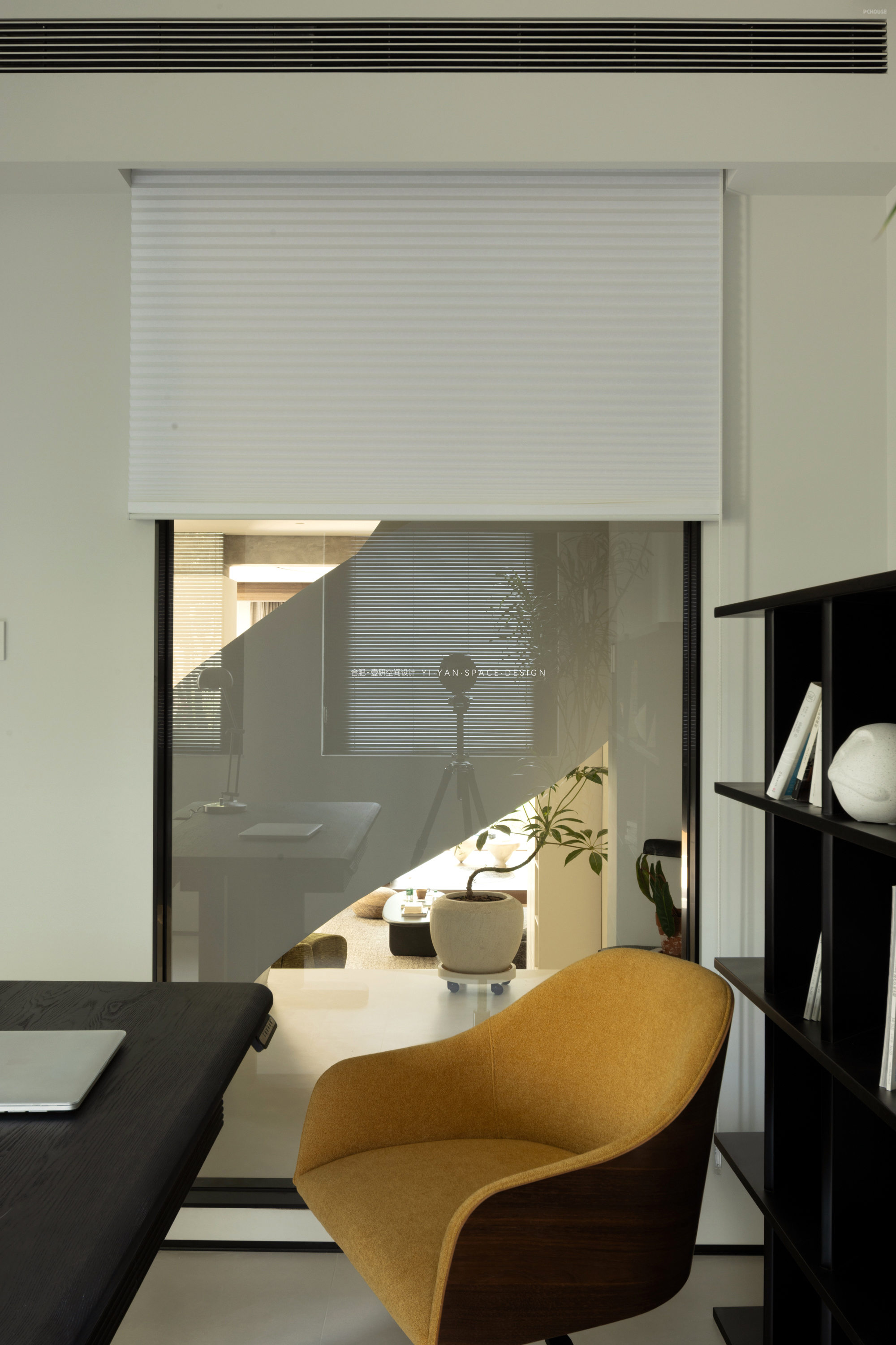 将后方书房墙体改为玻璃隔断,为楼梯平台区域引入充足光线,解决原结构昏暗的问题。光线透过玻璃与镂空书架形成光影层次,增强空间灵动性。