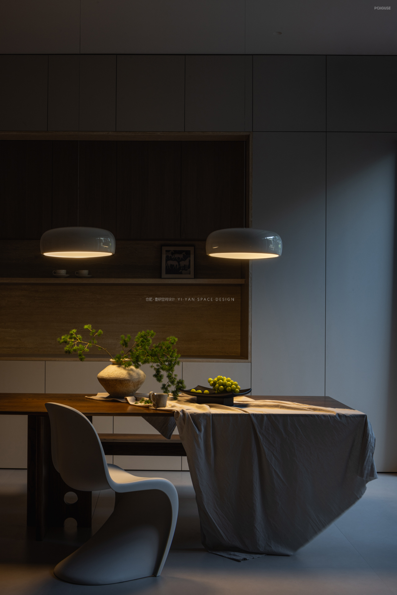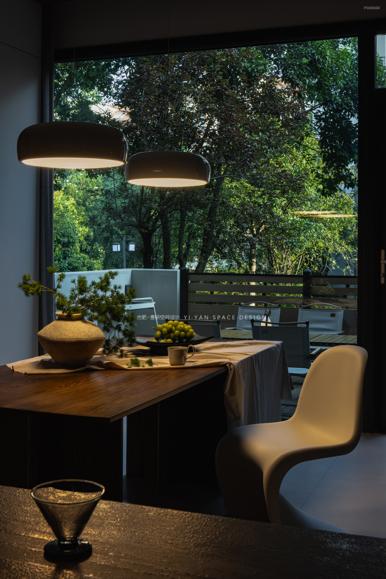 当夜幕降临,餐厅便成为家中最温暖的叙事场。低悬吊灯圈定温馨光域,深木桌、白陶罐、蓬莱松勾勒出自然质感,窗外绿林在夜色中化为朦胧背景。