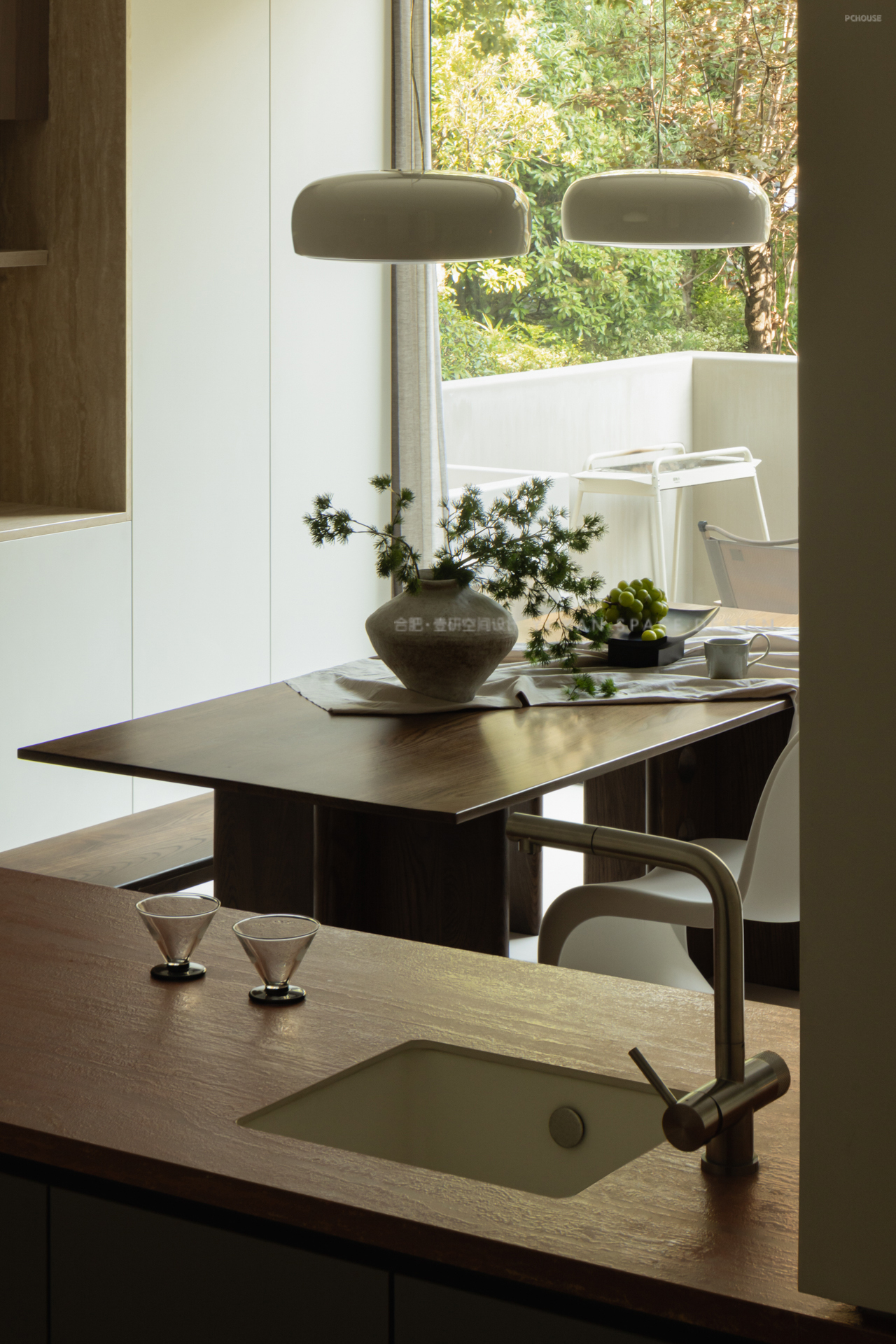 胡桃木餐桌与白陶花瓶碰撞出静谧质感,落地窗将四季之景纳入日常,当吊灯亮起,光线洒落于果盘与书页之间,餐桌便不再是孤立的家具,而成为情感与记忆的载体。