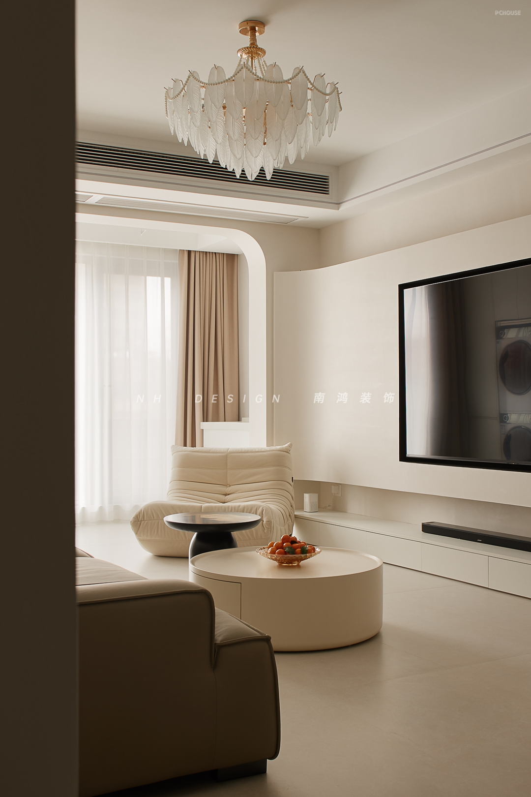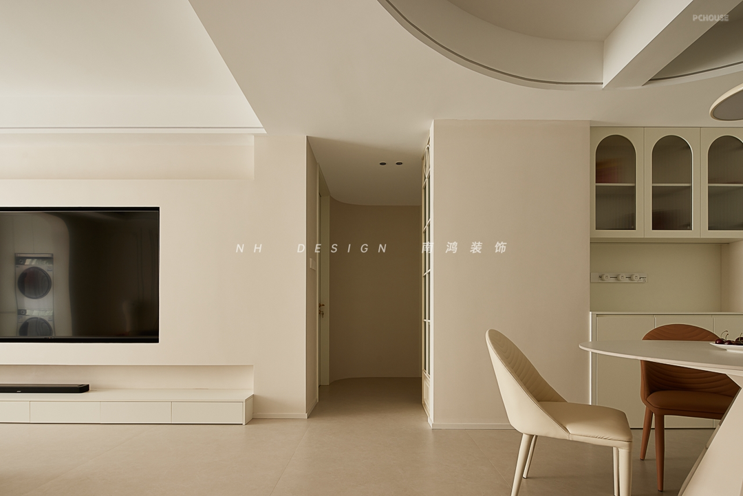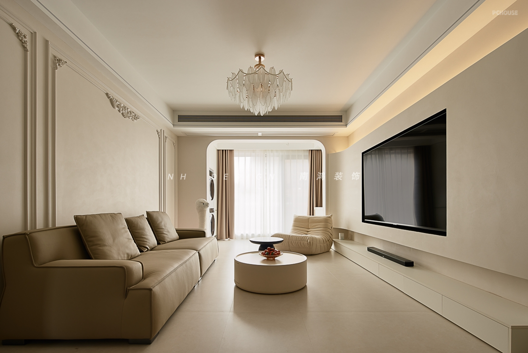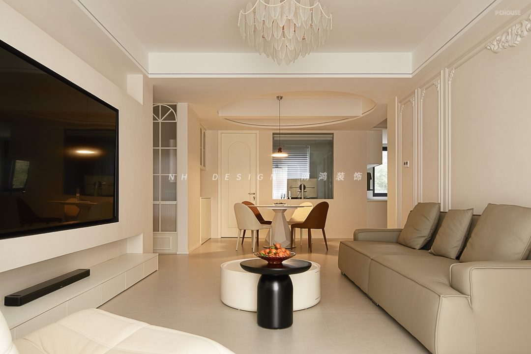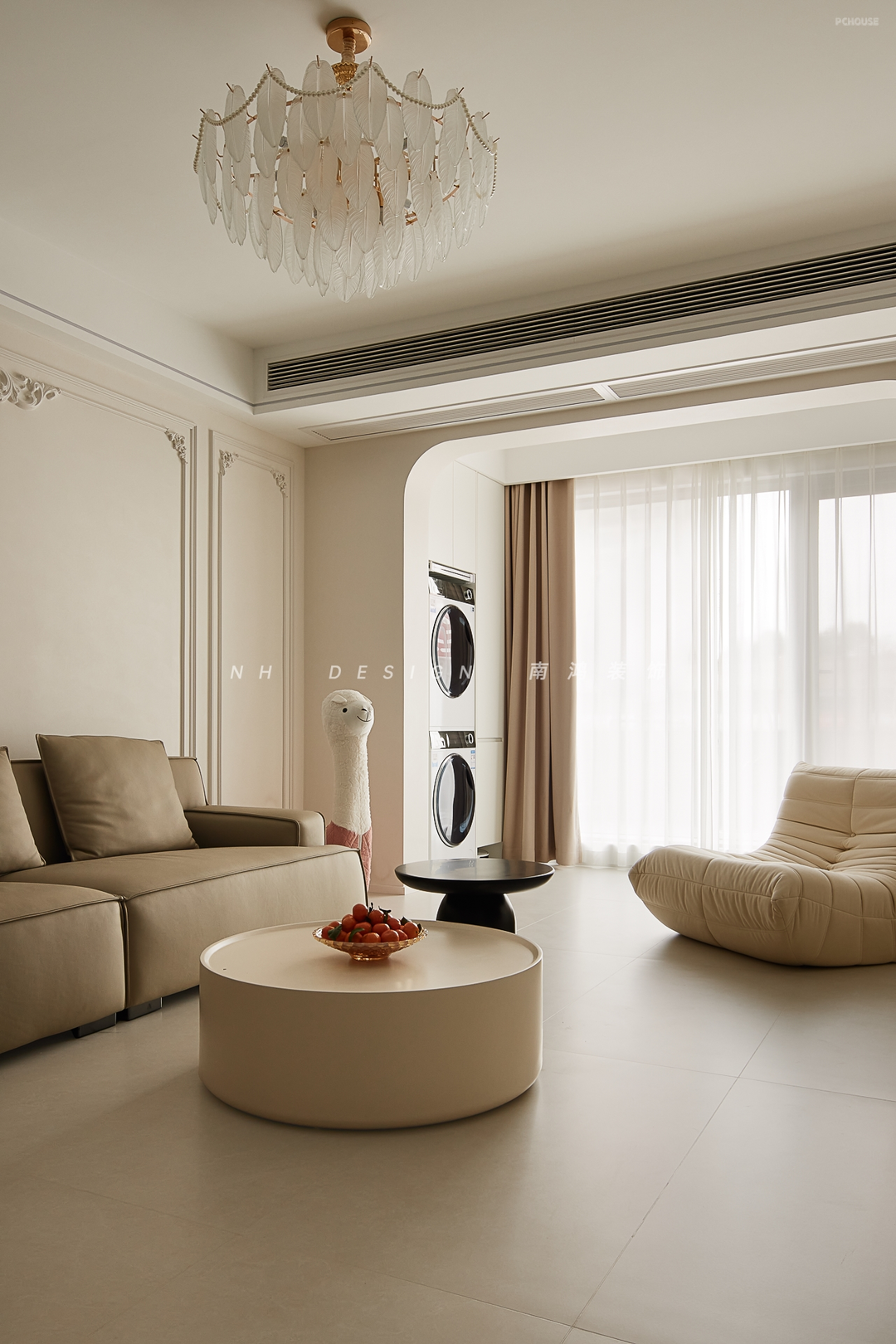 前言: 本案使用温馨的奶油色调,简净通透,屋内采光通风俱佳,营造宜居生活氛围。空间在风格上实现巧妙的混搭,既维持了现代简约的清爽,又通过石膏线条,注入了法式的浪漫情调。