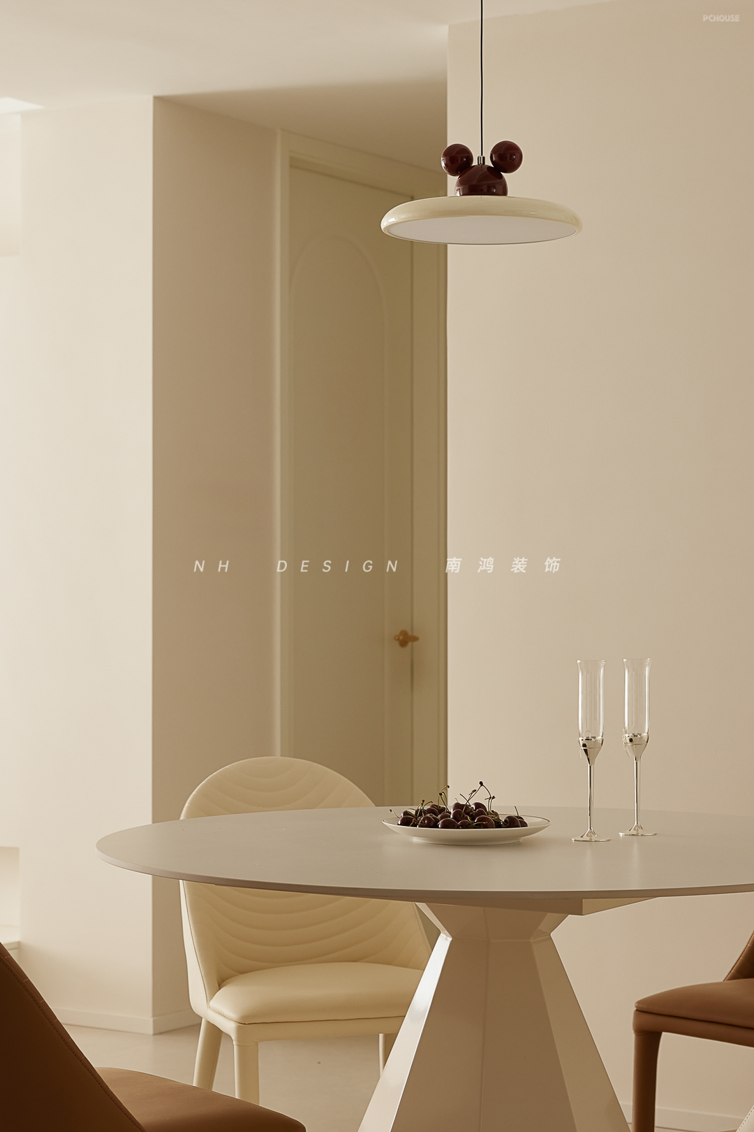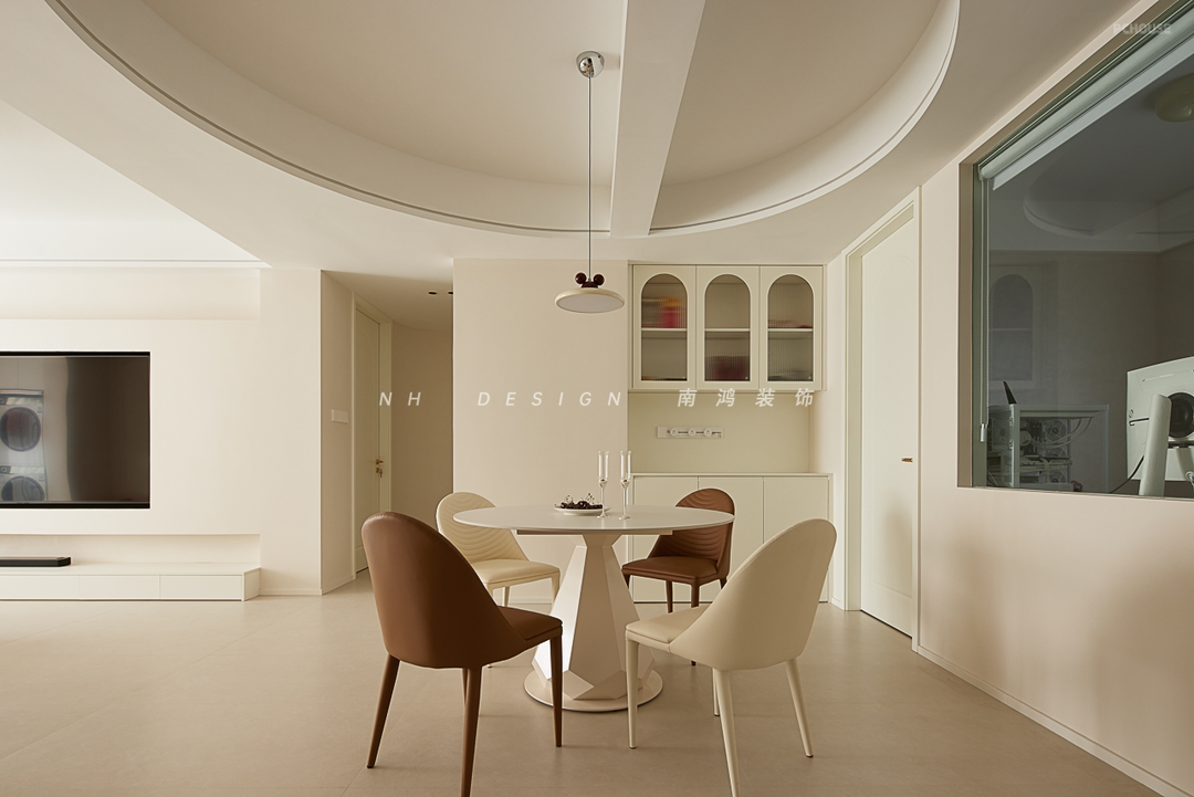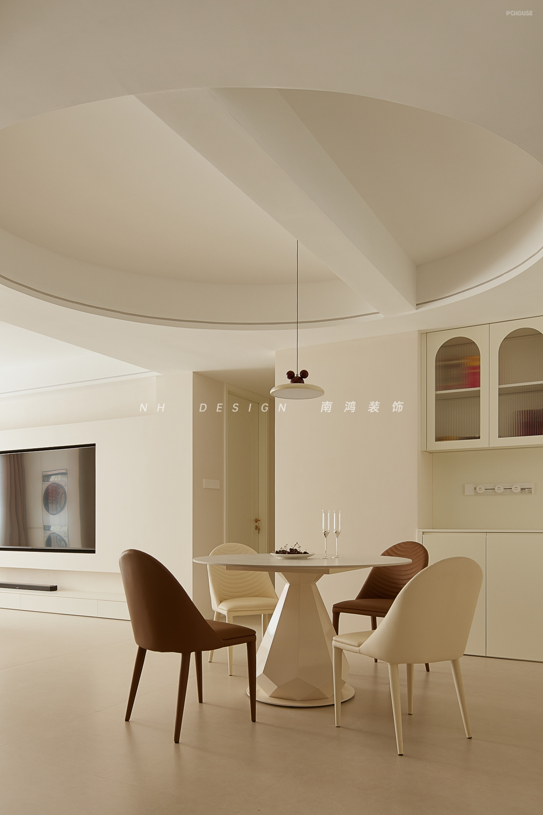 餐厅顶部巧妙划开一道圆形“界面”,用以弱化横梁,同时几何形态构成视觉上的张力,反衬出空间艺术感。中央悬落一盏奶油风吊灯,为区域定下中心。