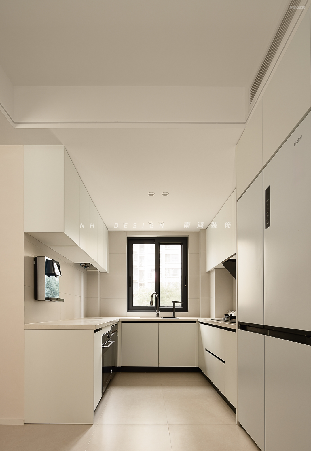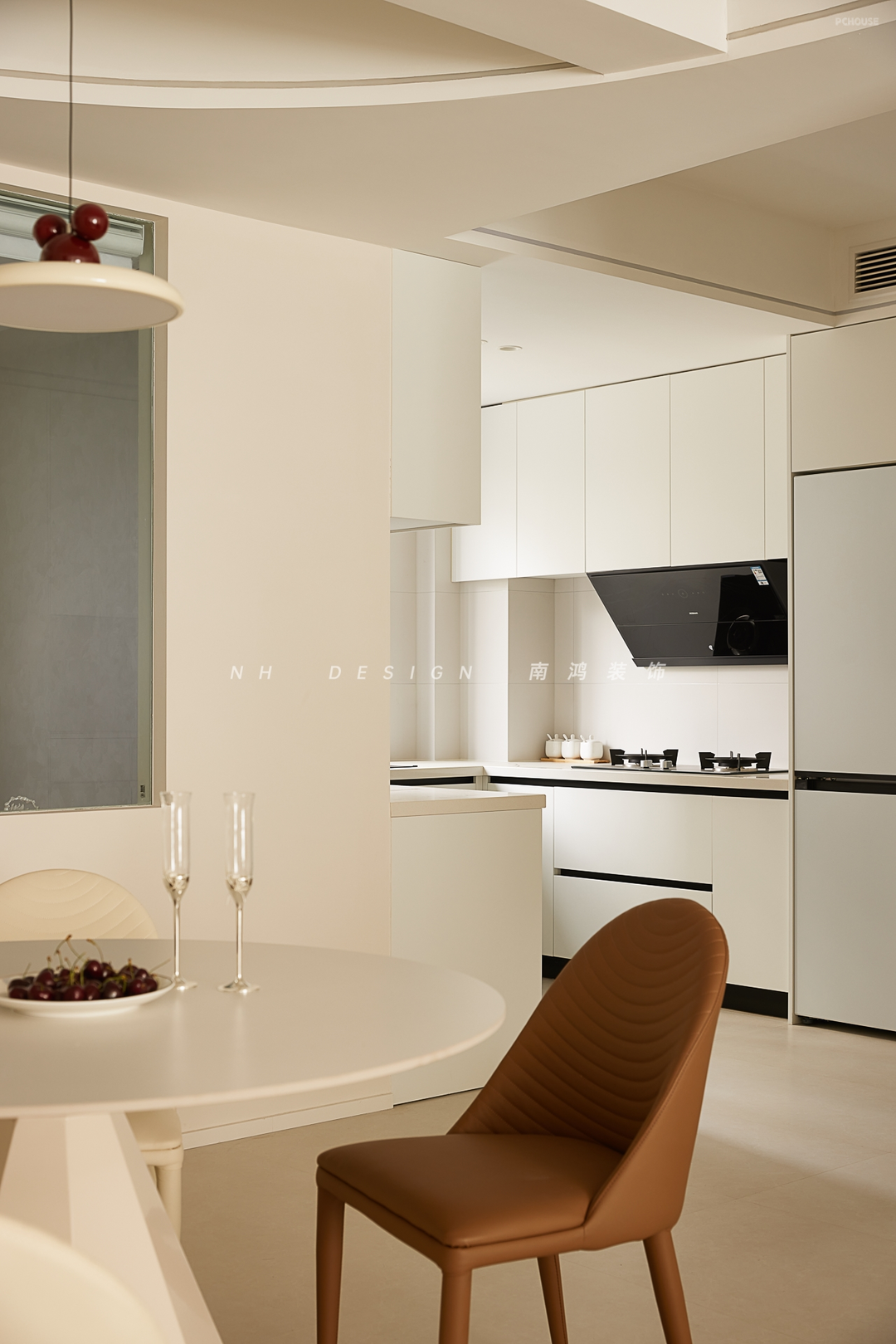 开放式厨房采用统一的白色橱柜与内嵌式拉手,冰箱等电器嵌入柜体,保持视觉清爽整洁。餐厨相邻布局,优化日常动线,不仅操作便捷,更显著提升了空间利用率。