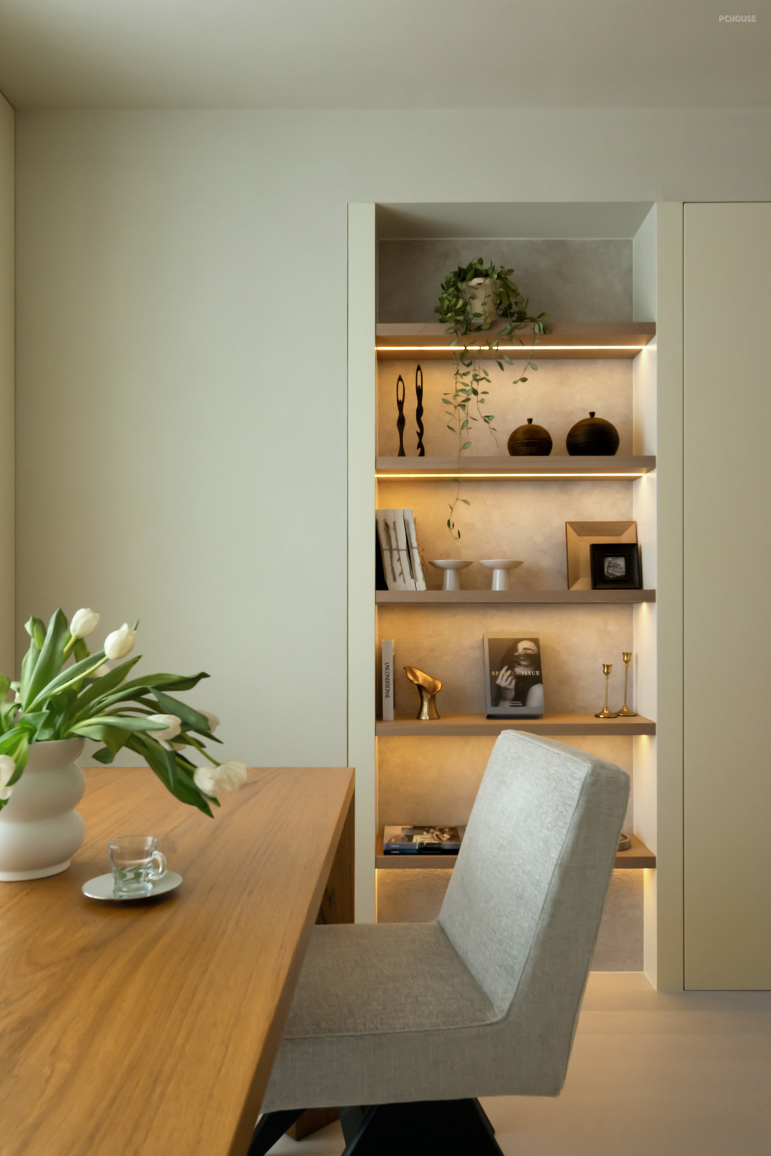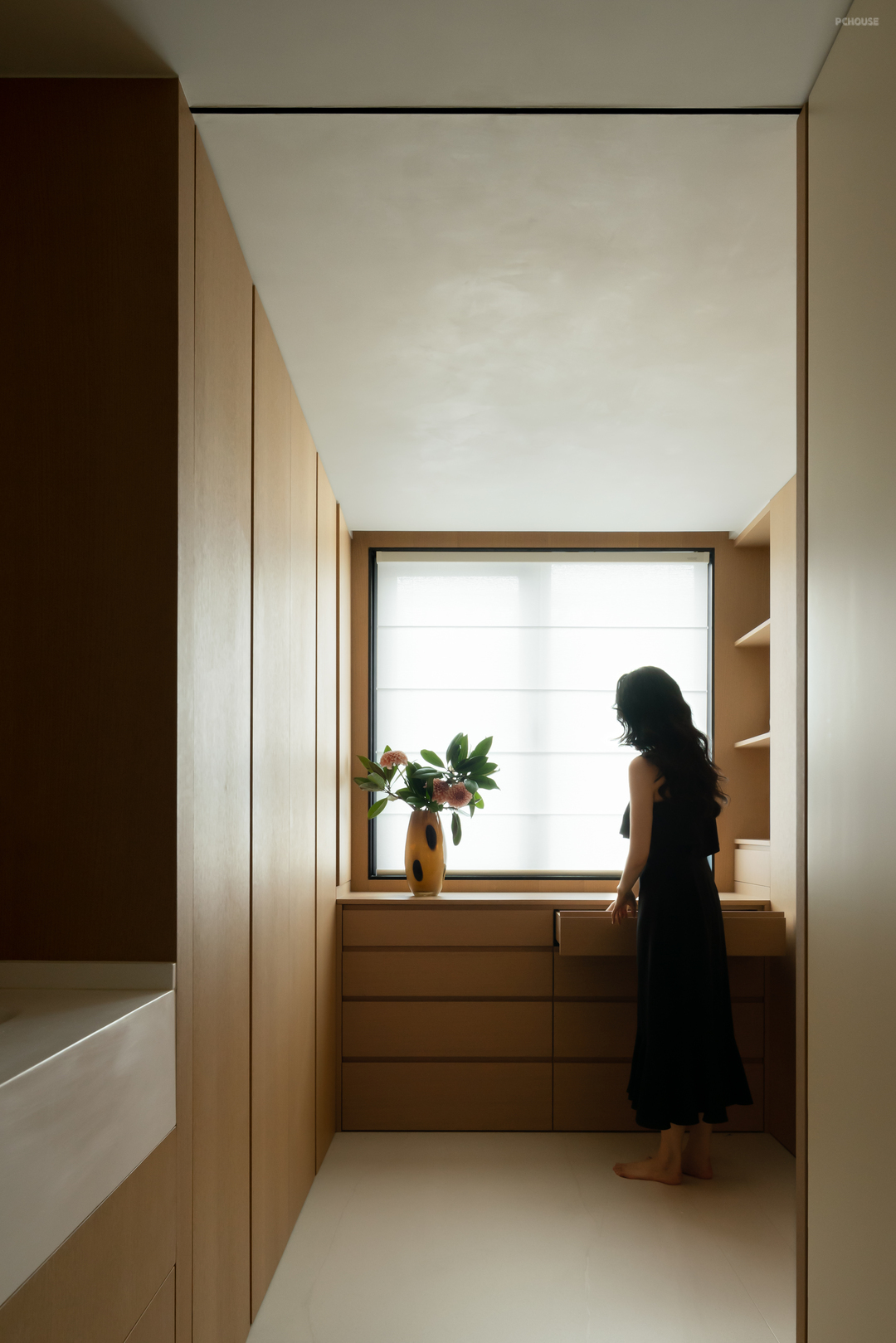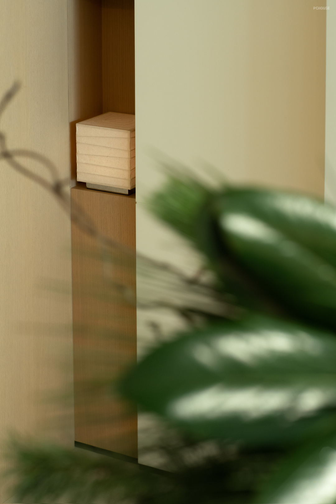 将收纳升华至艺术化的秩序感,功能被优雅地隐于无形。木饰面柜体,宛如建筑结构的一部分,线条笔直利落,表面温润细腻。生活的痕迹悄然隐入精密的木作之后,只留下空间的呼吸感与令人心安的秩序美学。