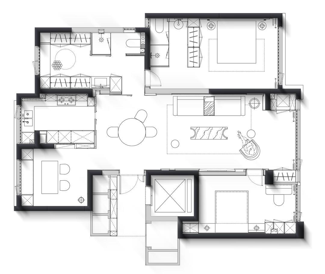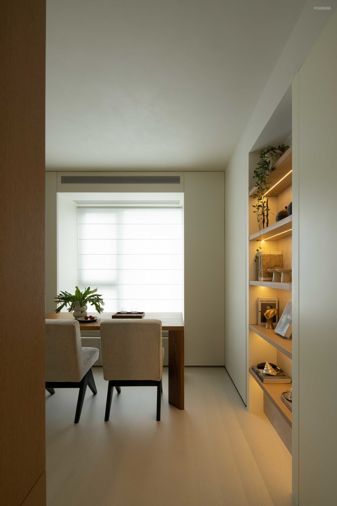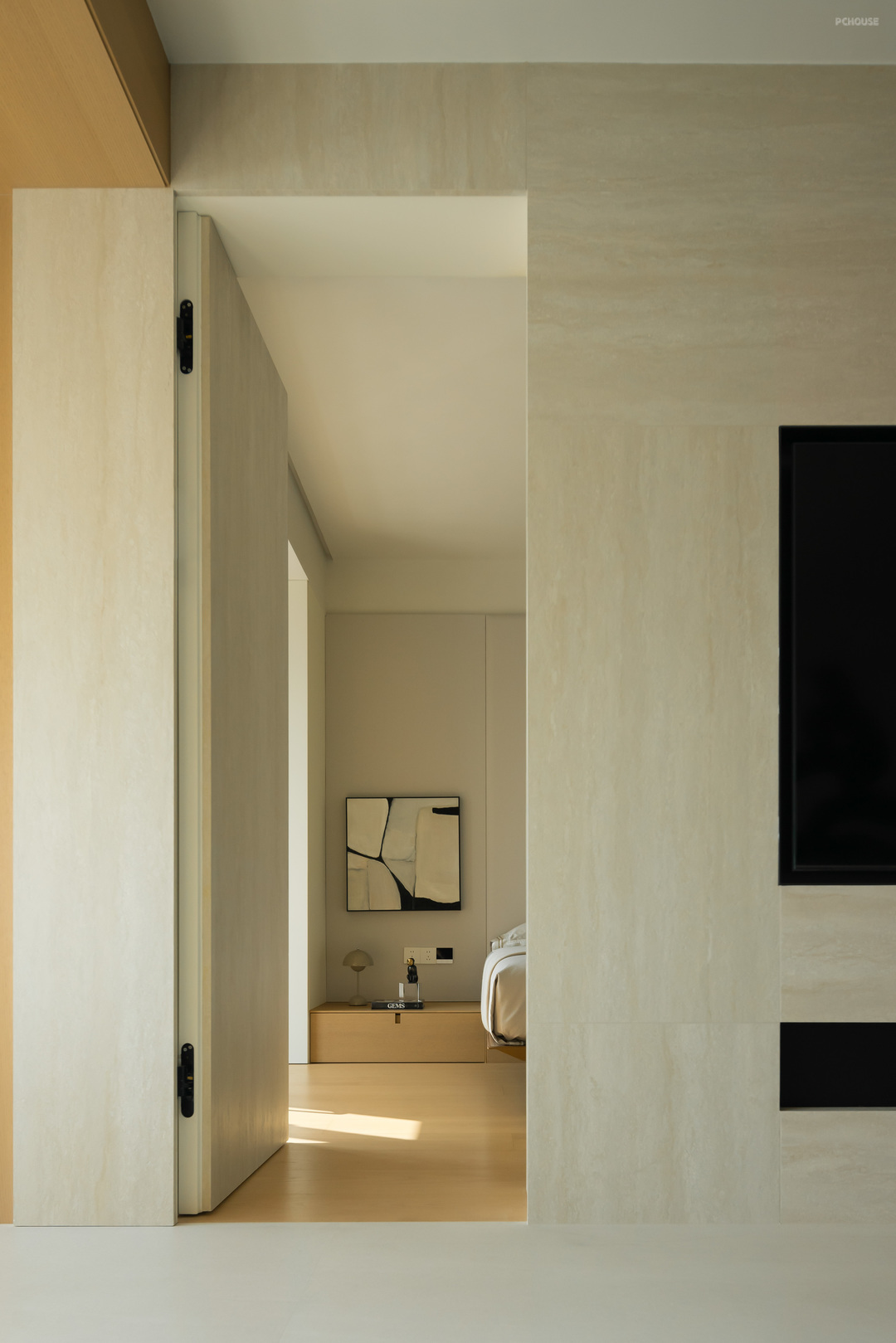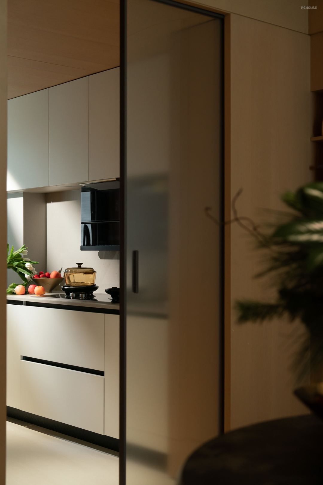 将收纳升华至艺术化的秩序感,功能被优雅地隐于无形。木饰面柜体,宛如建筑结构的一部分,线条笔直利落,表面温润细腻。生活的痕迹悄然隐入精密的木作之后,只留下空间的呼吸感与令人心安的秩序美学。