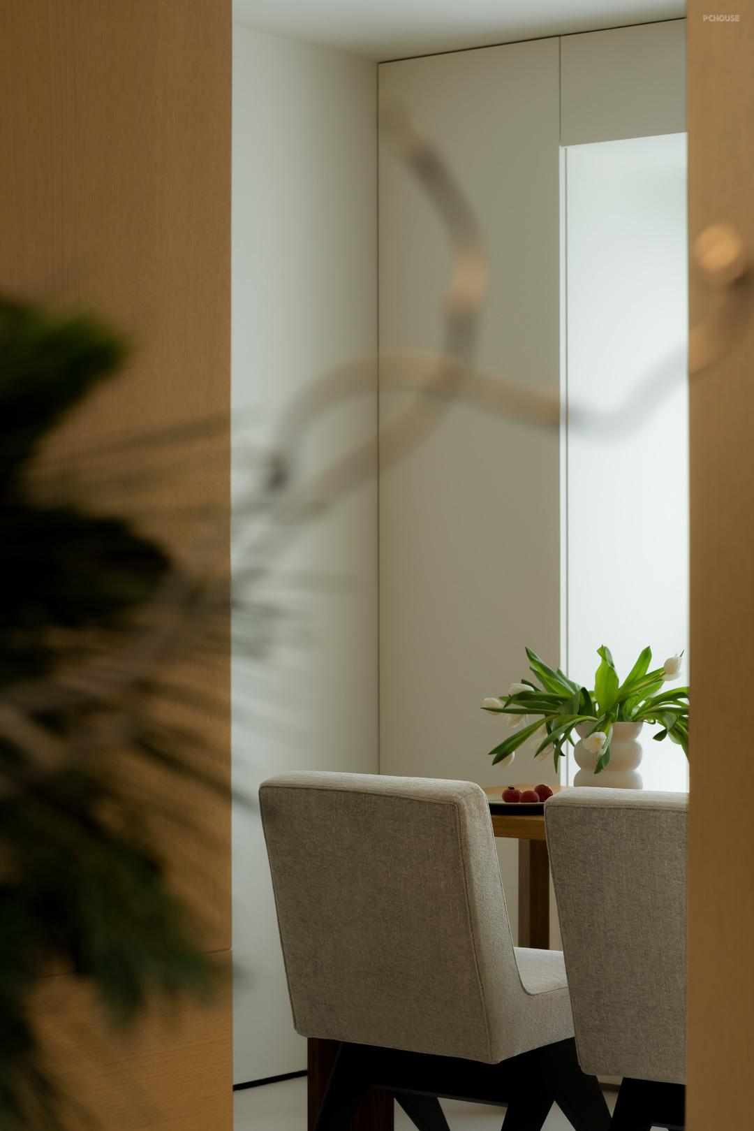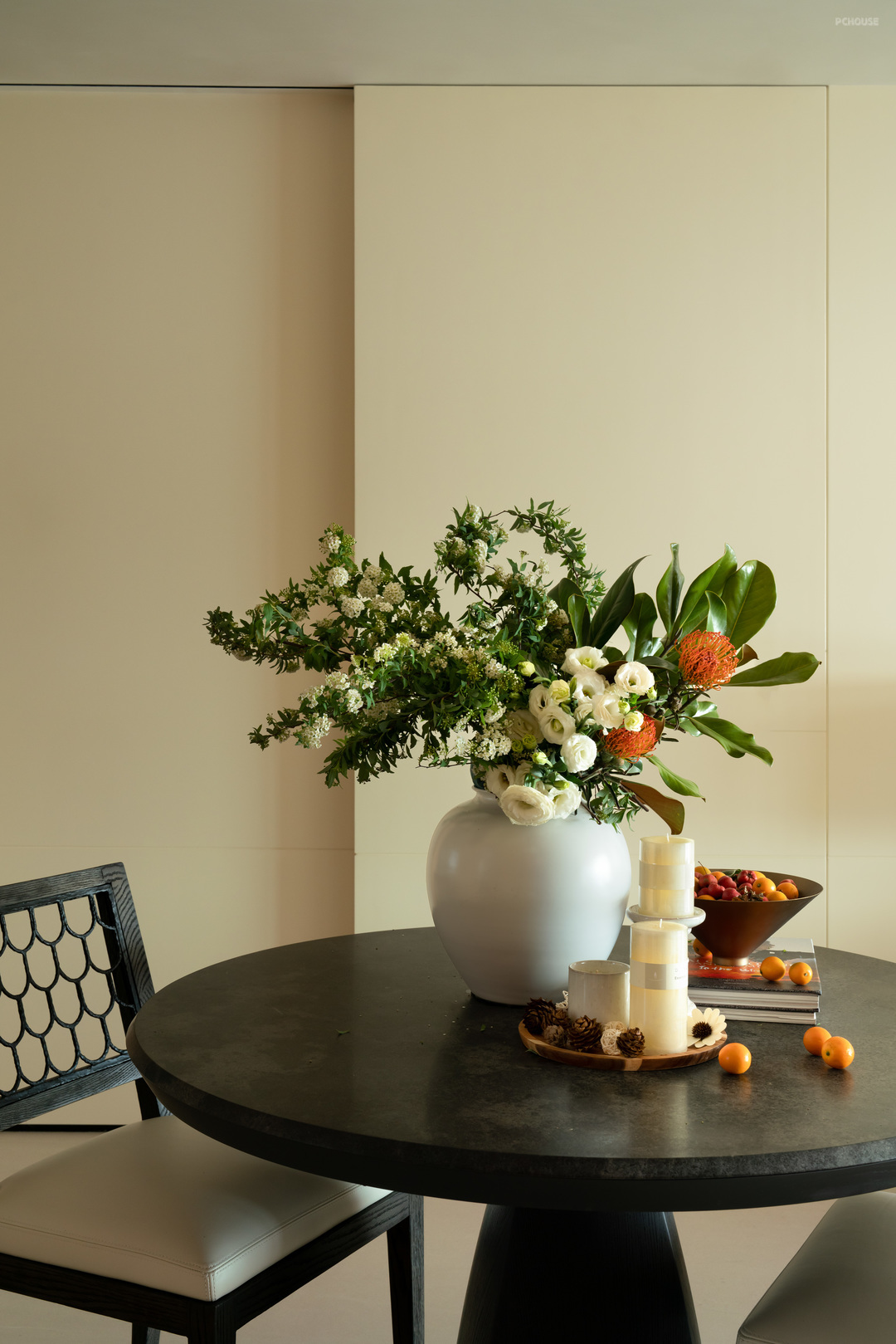 光点跳跃于Cassina椅的缝线细节,也流淌过木桌的年轮。独坐此境,指尖抚过温润木纹,东方的沉静与西方的精妙,在生活的气息中悄然对话。裁花取势,又在大中见小,小中见大,虚中有实,实中有虚,或藏或露,或浅或深。