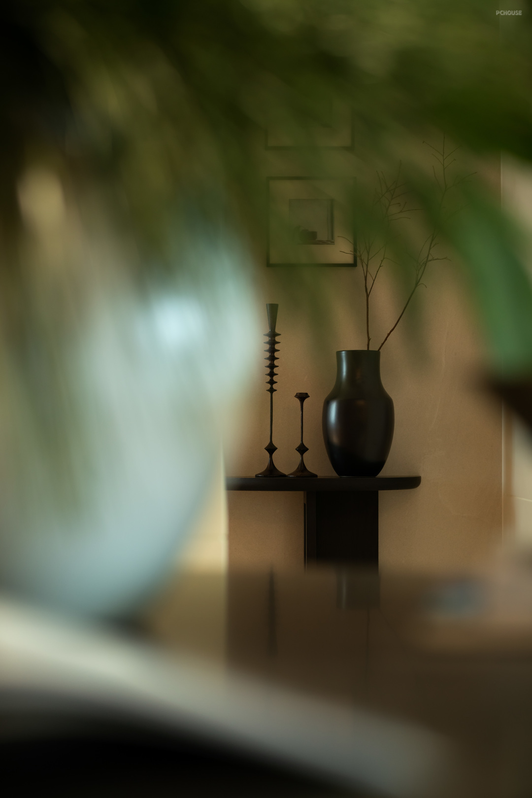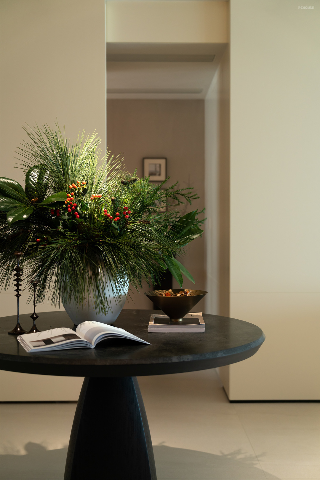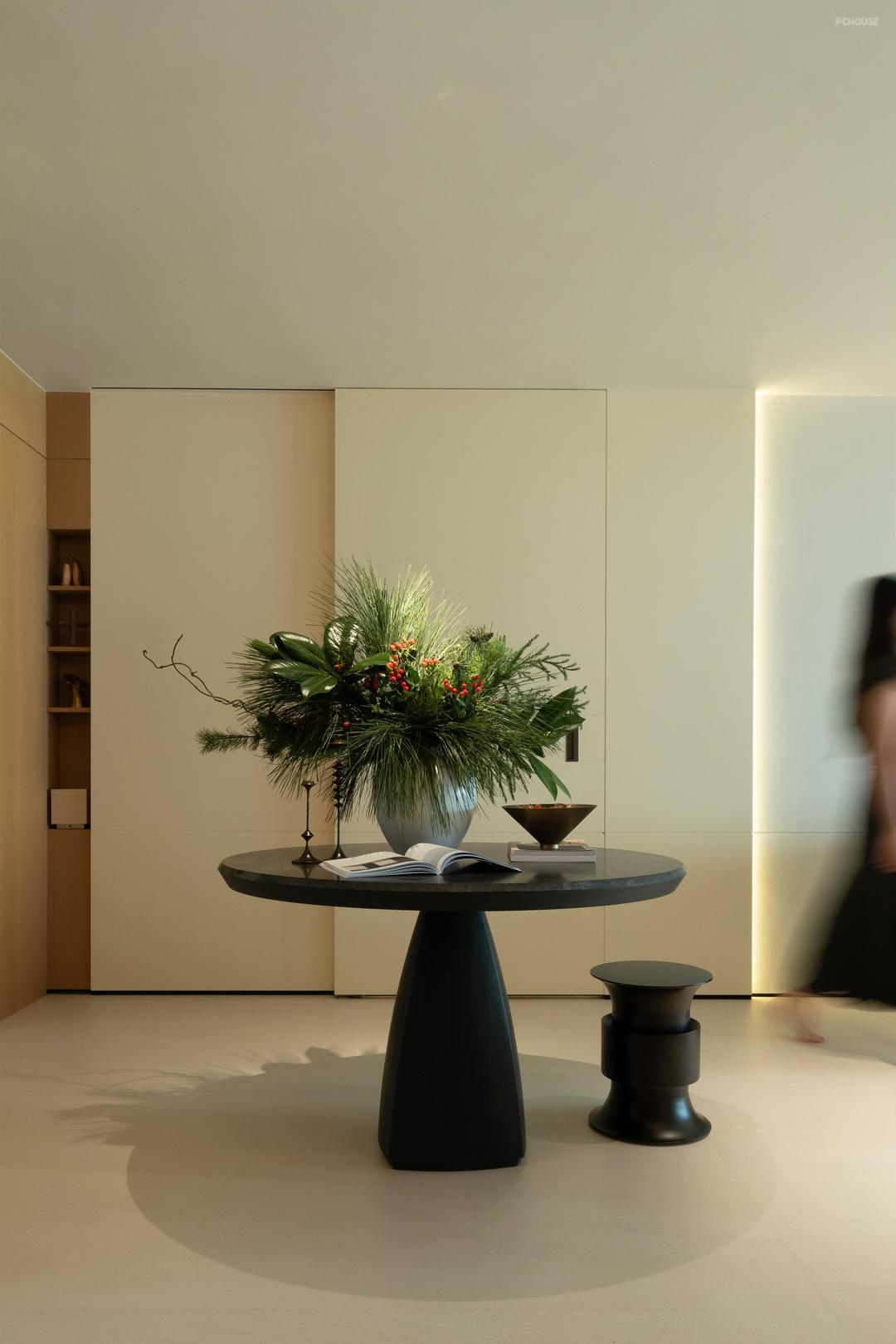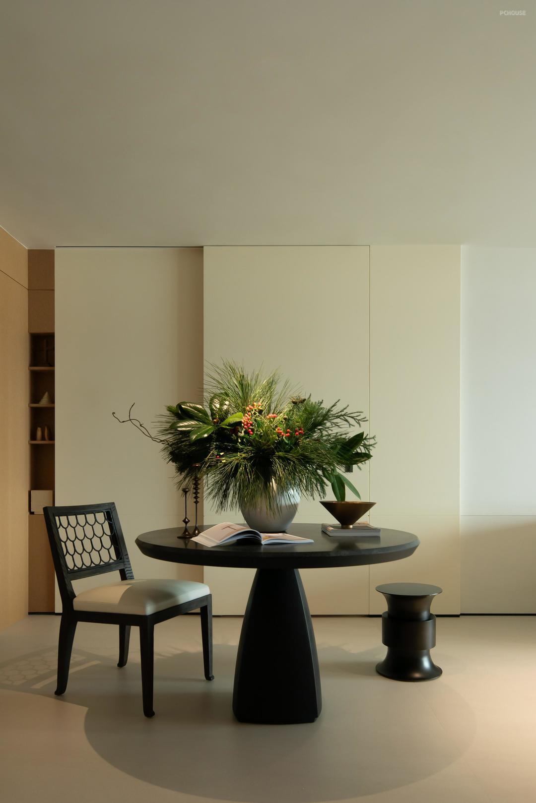 玄关处一方花瓶造型悬空而立,树枝植物让空间更具温度,充满生机。目光所至都有自然变化的美。转身步入,整张黑色圆桌桌厚重温朴,搭配Liaigre Maritime Chair。平衡,和谐。