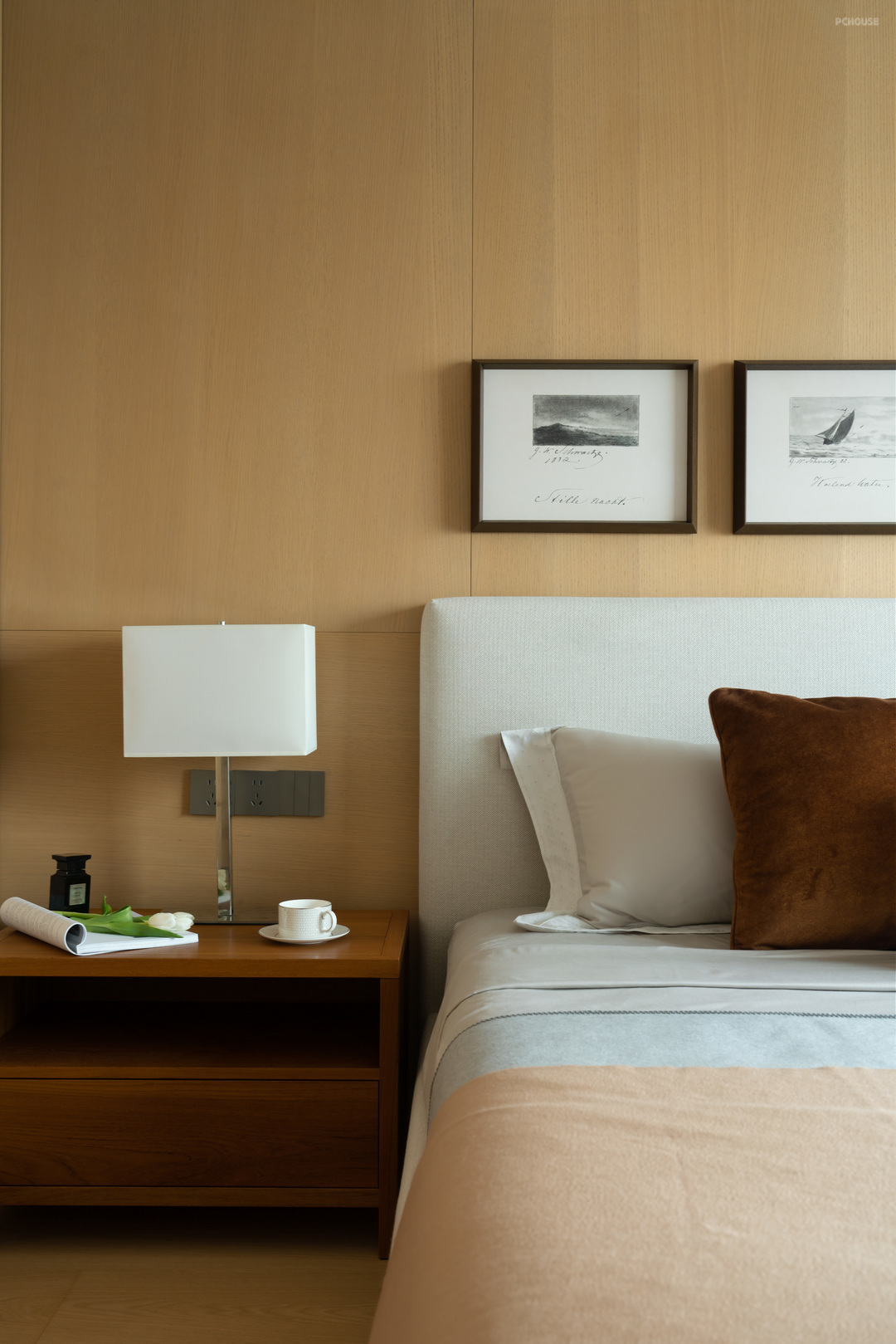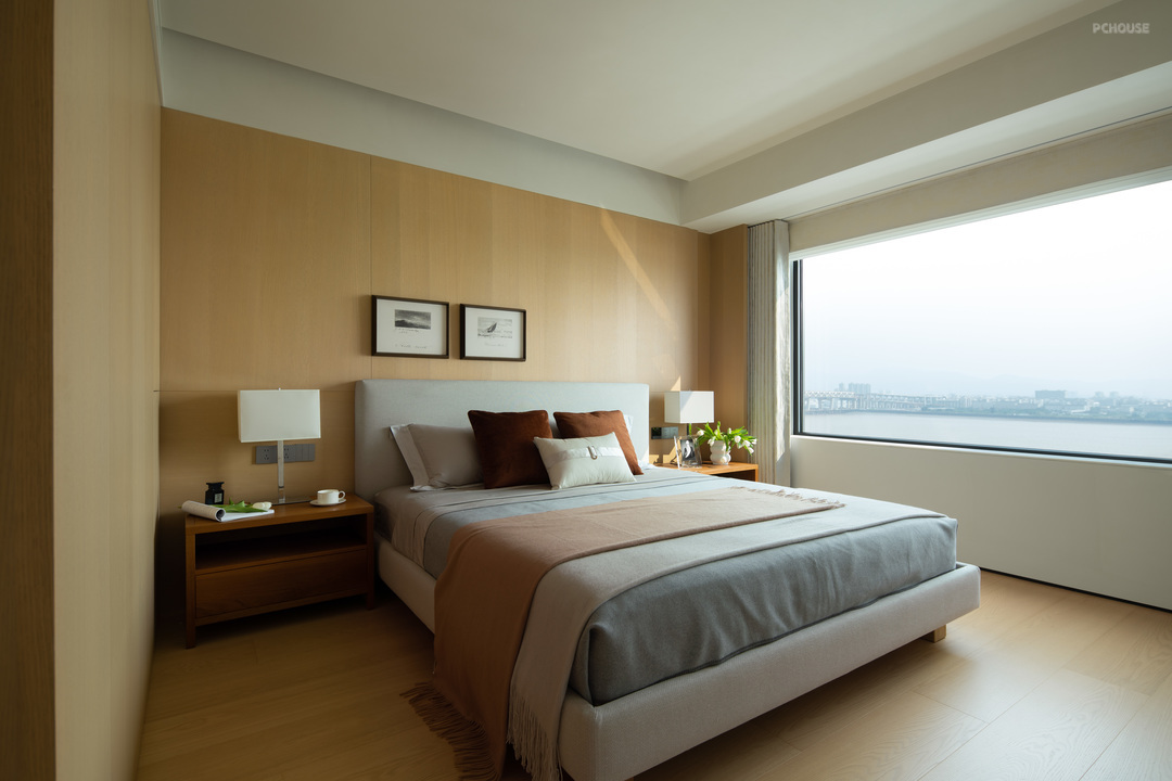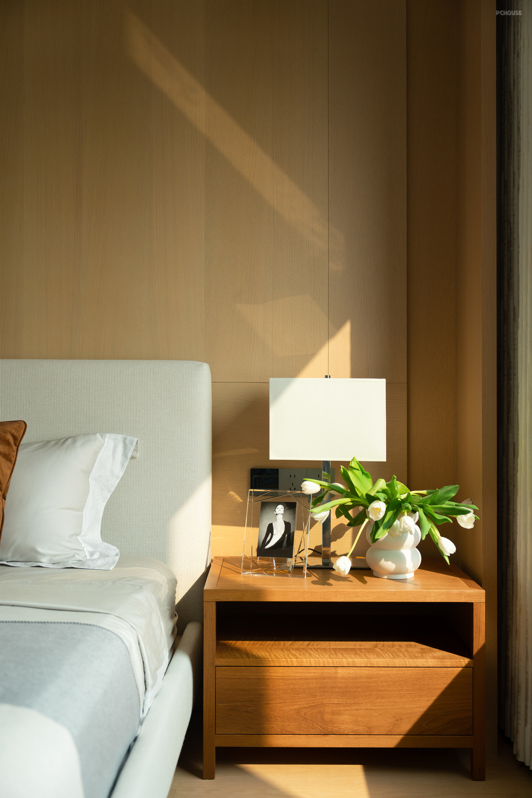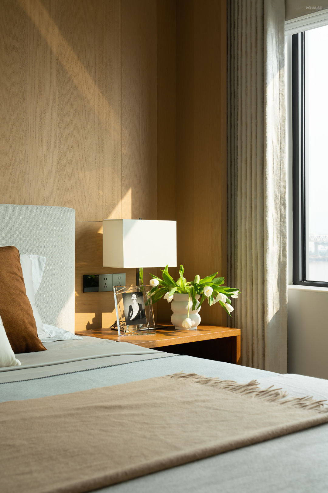 整幅木格延伸至顶,床头暗藏暖光,如晨曦微透林间。素锦床品铺陈于床上,摒弃繁复。床头散落,在卷帘滤过的柔光中静默生长。窗外见景,室内外木与江景交融,栖居谧境,梦有木香。