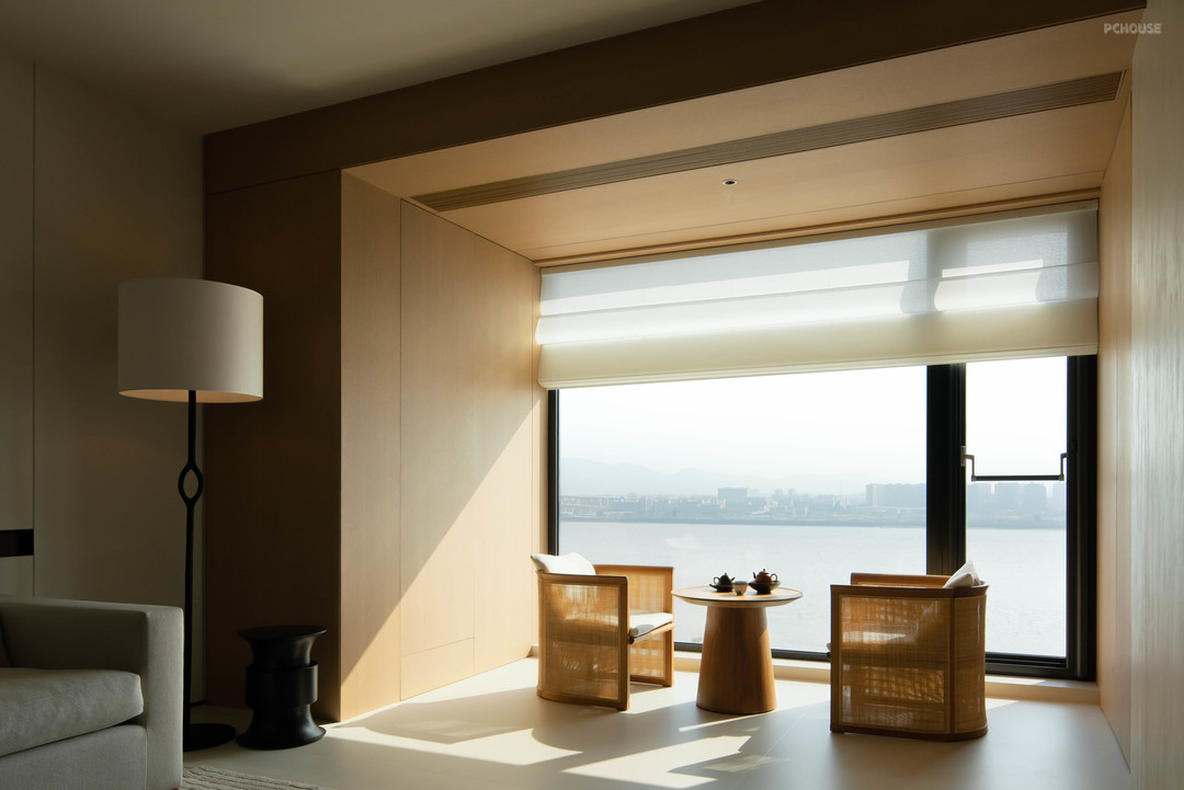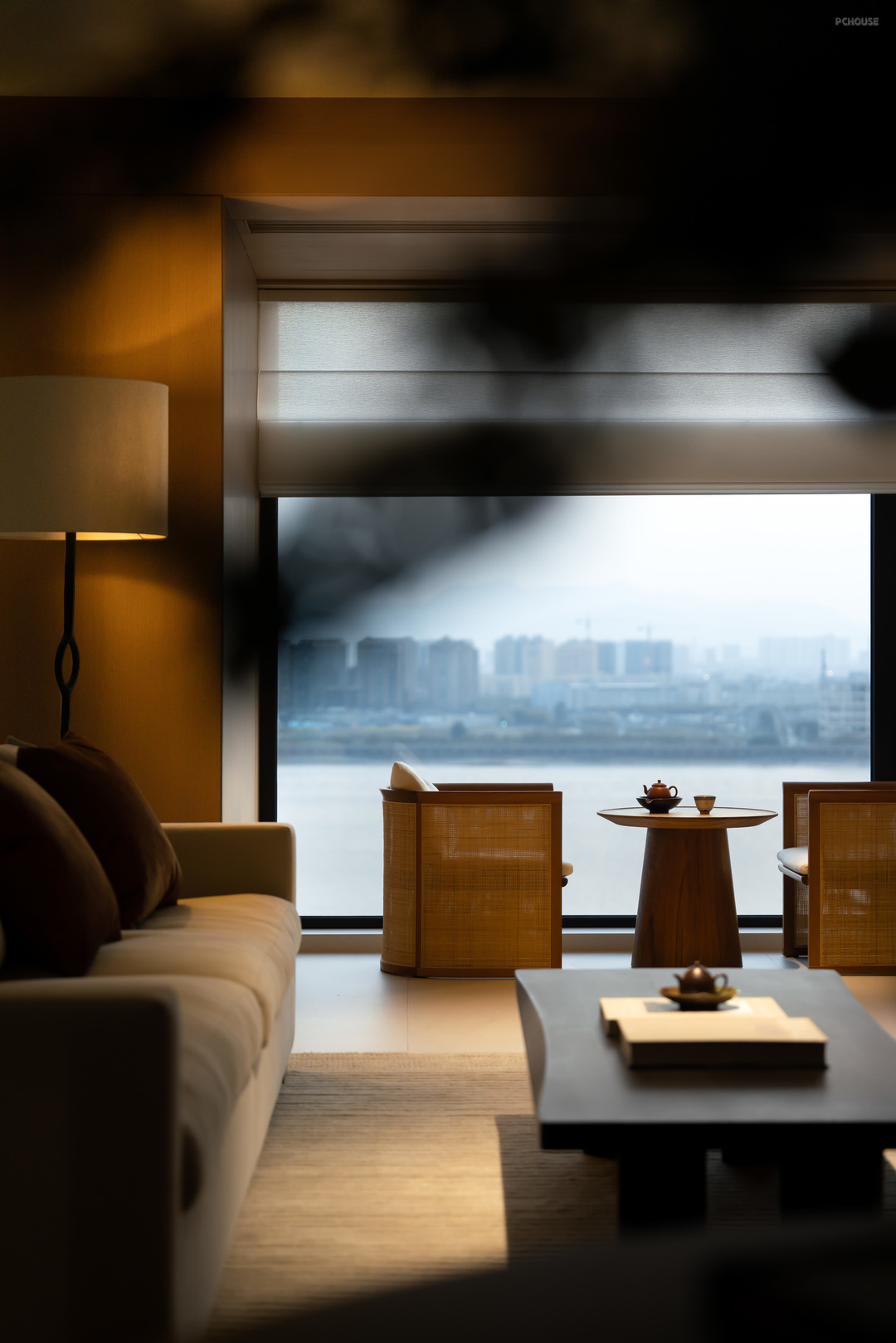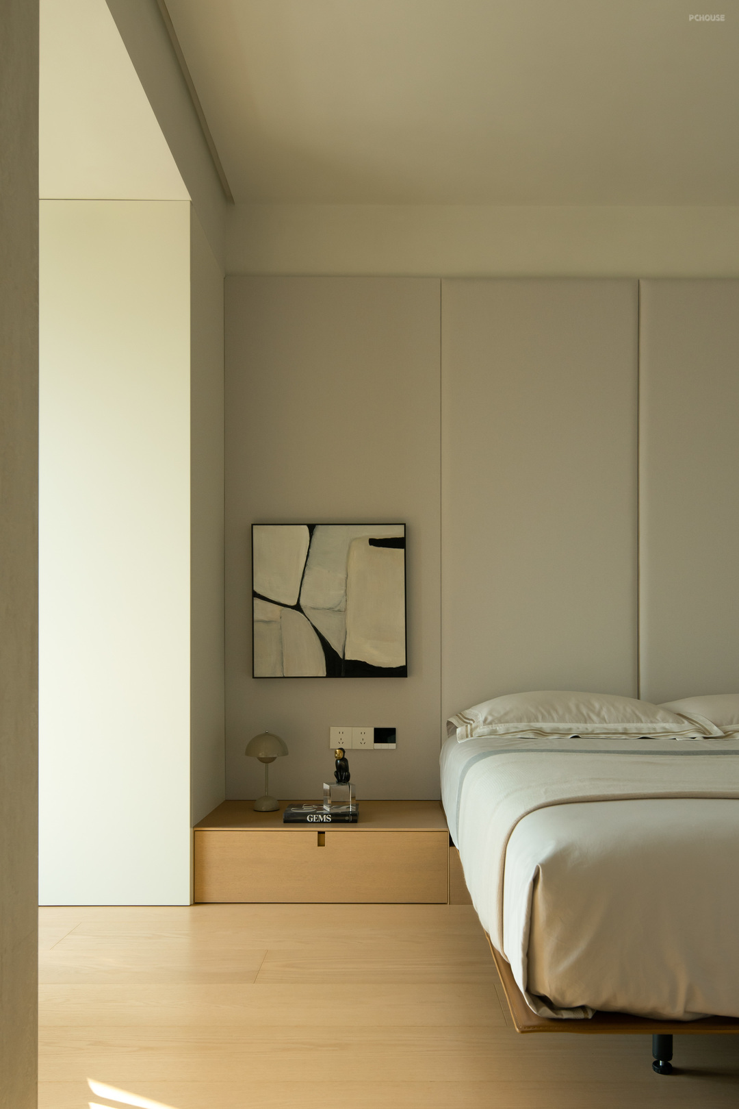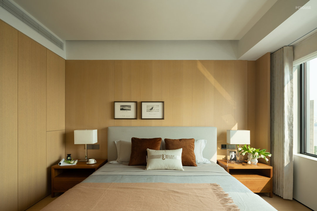 整幅木格延伸至顶,床头暗藏暖光,如晨曦微透林间。素锦床品铺陈于床上,摒弃繁复。床头散落,在卷帘滤过的柔光中静默生长。窗外见景,室内外木与江景交融,栖居谧境,梦有木香。