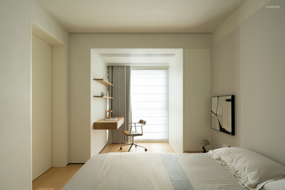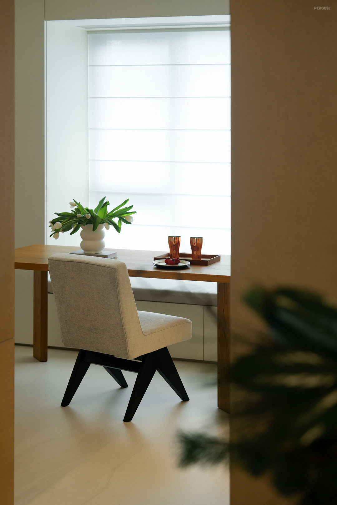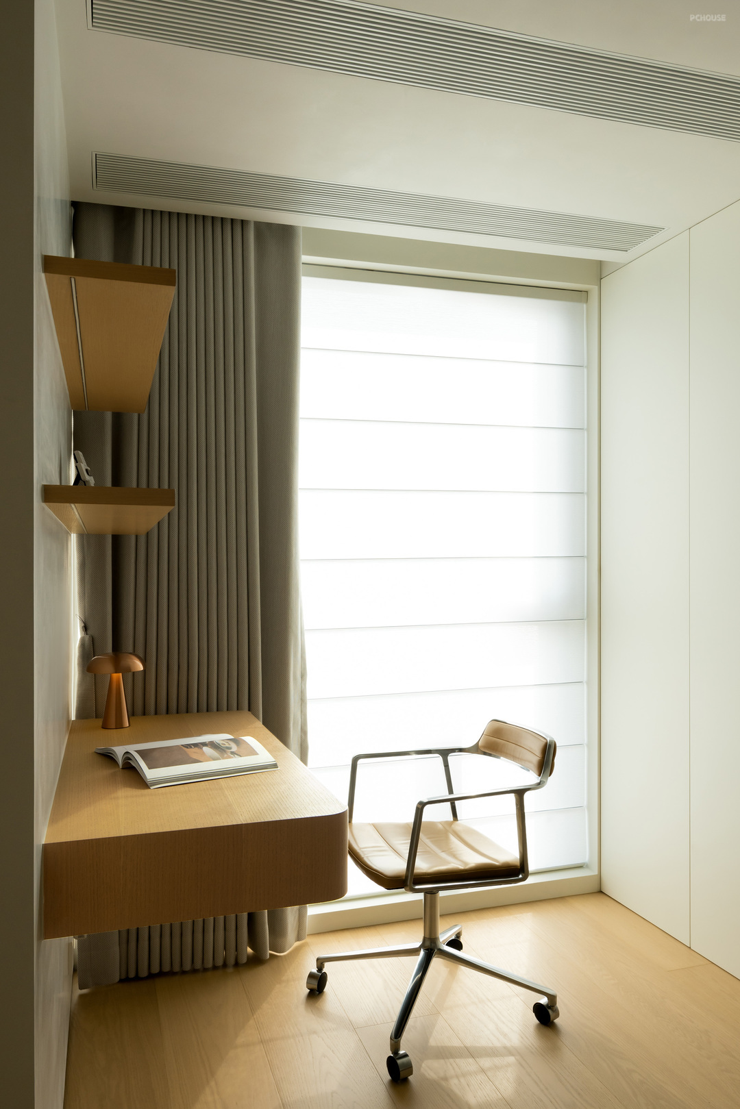 靠墙通顶书柜如博古架,格间藏书与陶器错落。长条原木书桌临窗而设,一砚一墨,镇纸如石。窗帘调节天光,树影在纸页上翩跹。既是一个书房,也是一个能够独坐此处,煮茶翻书之地。木的沉稳让人沉心静气,恰如贝聿铭所言,光在此刻成为空间的主角。