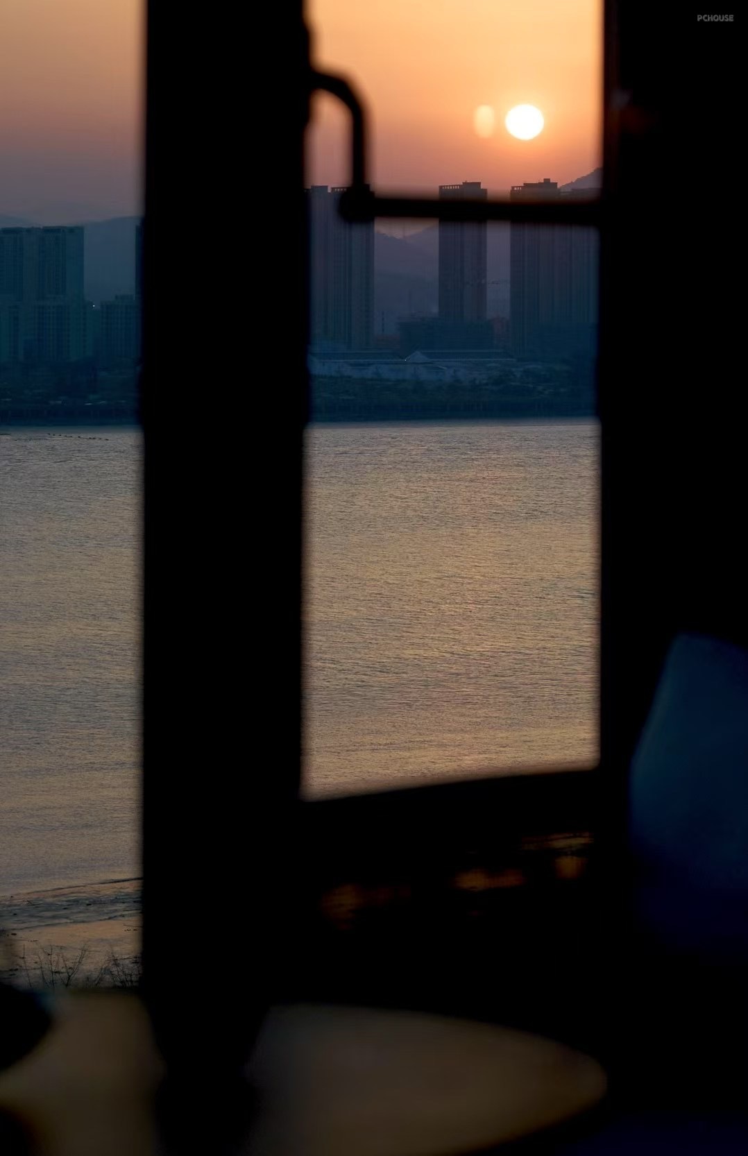 巨大的落地窗,像一面未经裁剪的画布,框住了整条奔流的江和渐沉的夕阳。窗内,一片宁静。倚在落地窗边,身旁是温润的木质圆桌。桌面的纹理在斜照里清晰可见,仿佛也吸饱了暮色,泛着琥珀般柔和的光泽。